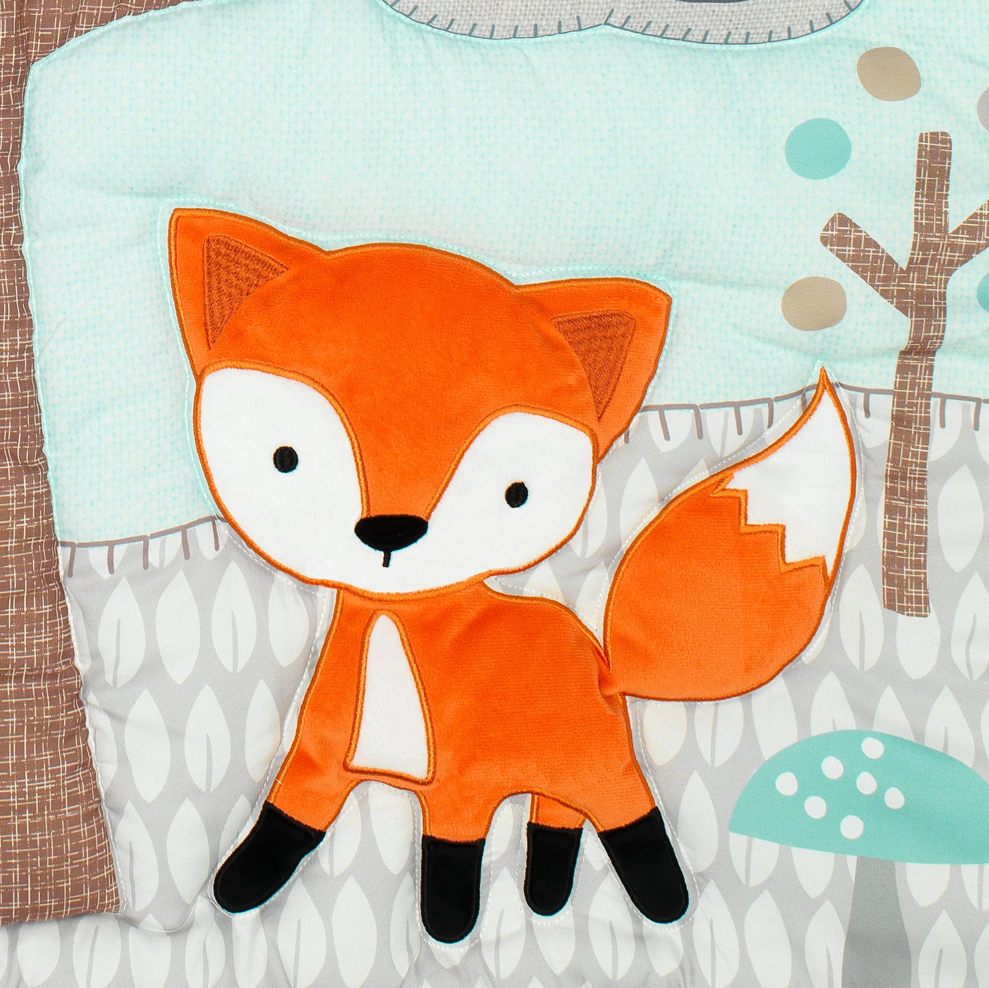 Includes 1 quilt, 1 fitted crib sheet, 1 crib skirt Made in an eco-friendly polyester microfiber in high resolution for enhanced colors Dimensional velour appliqued fox Fitted crib sheet with elastic all around ensuring a secure fit Cute colorful character crib skirt with 10” drop