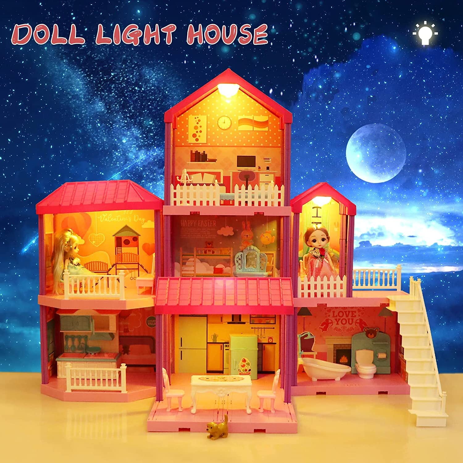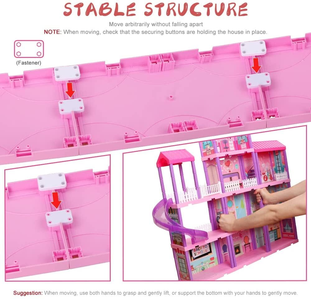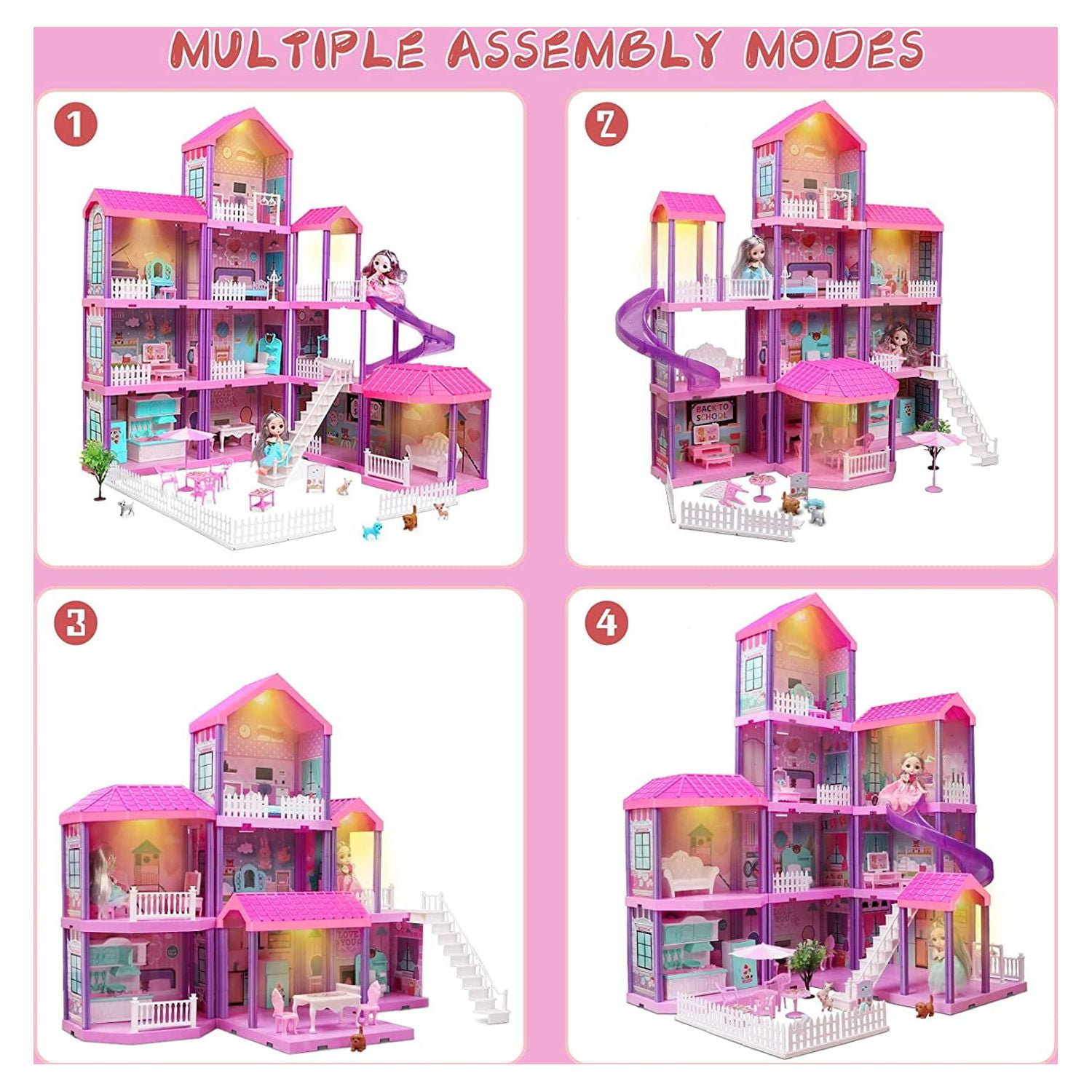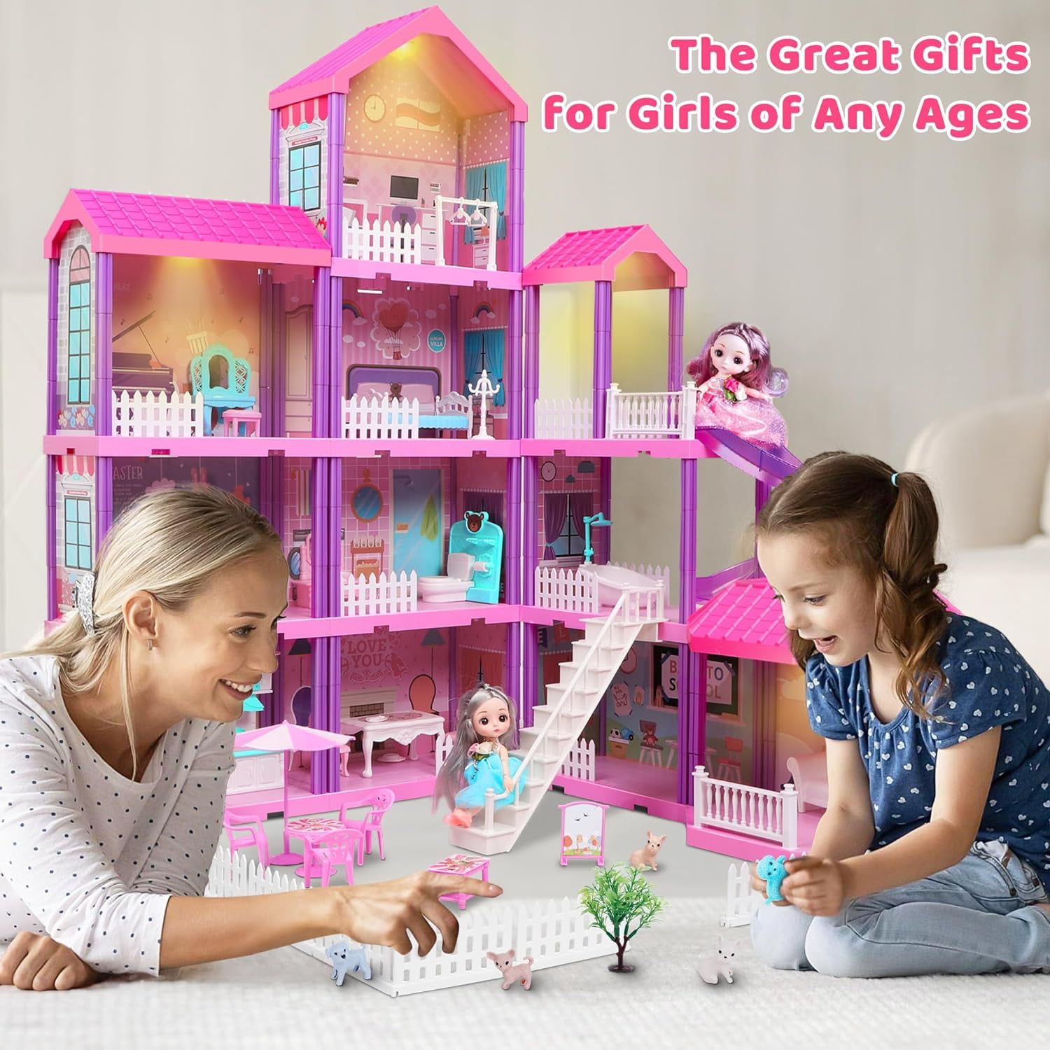 HUGE DOLL HOUSE KIT: 4 levels,11 rooms and 2 dools,4 Pack Warm Lights and 70 accessories. EASY TO INSTALL, NO TOOLS: This villa doll house comes with clear English installation steps. It does not require any tools and is very easy to assemble. DIY EDUCATIONAL TOYS KIT: There are multiple ways to assemble the princess house, with clear instructions. Kids can build and take apart their own dolls house according to their likes and imaginations. SAFE & DURABLE MATERIAL: The princess dollhouse kits are made of non-toxic and durable ABS material, which is environmentally friendly, durable, moisture, and does not fade. THE PERFECT CHRISTMAS GIFTS: It is the perfect New Year/Christmas/birthday gifts for 3 4 5 6 7 8 girls/kids. It is very suitable as a Christmas toys for boys and girls.