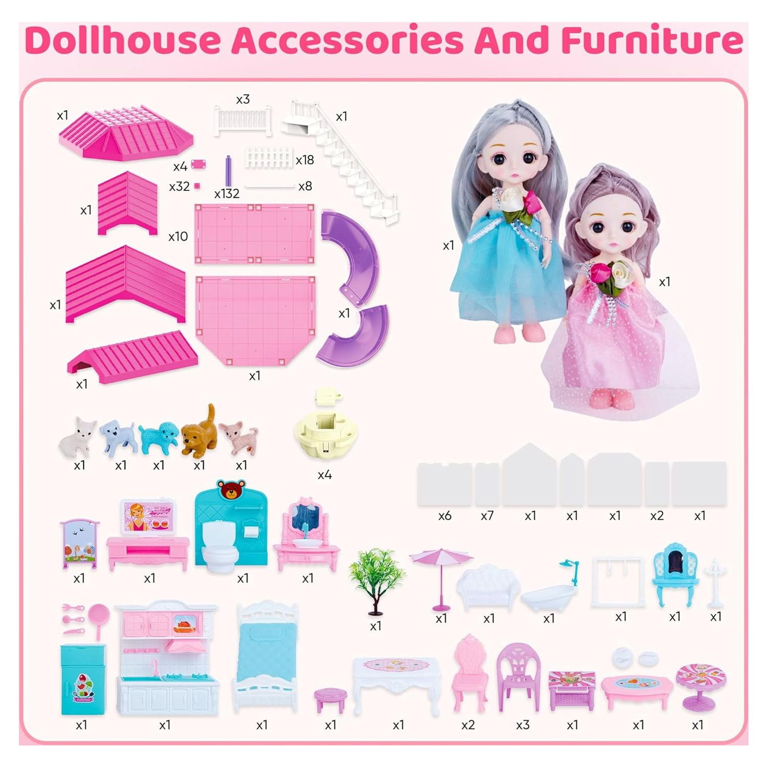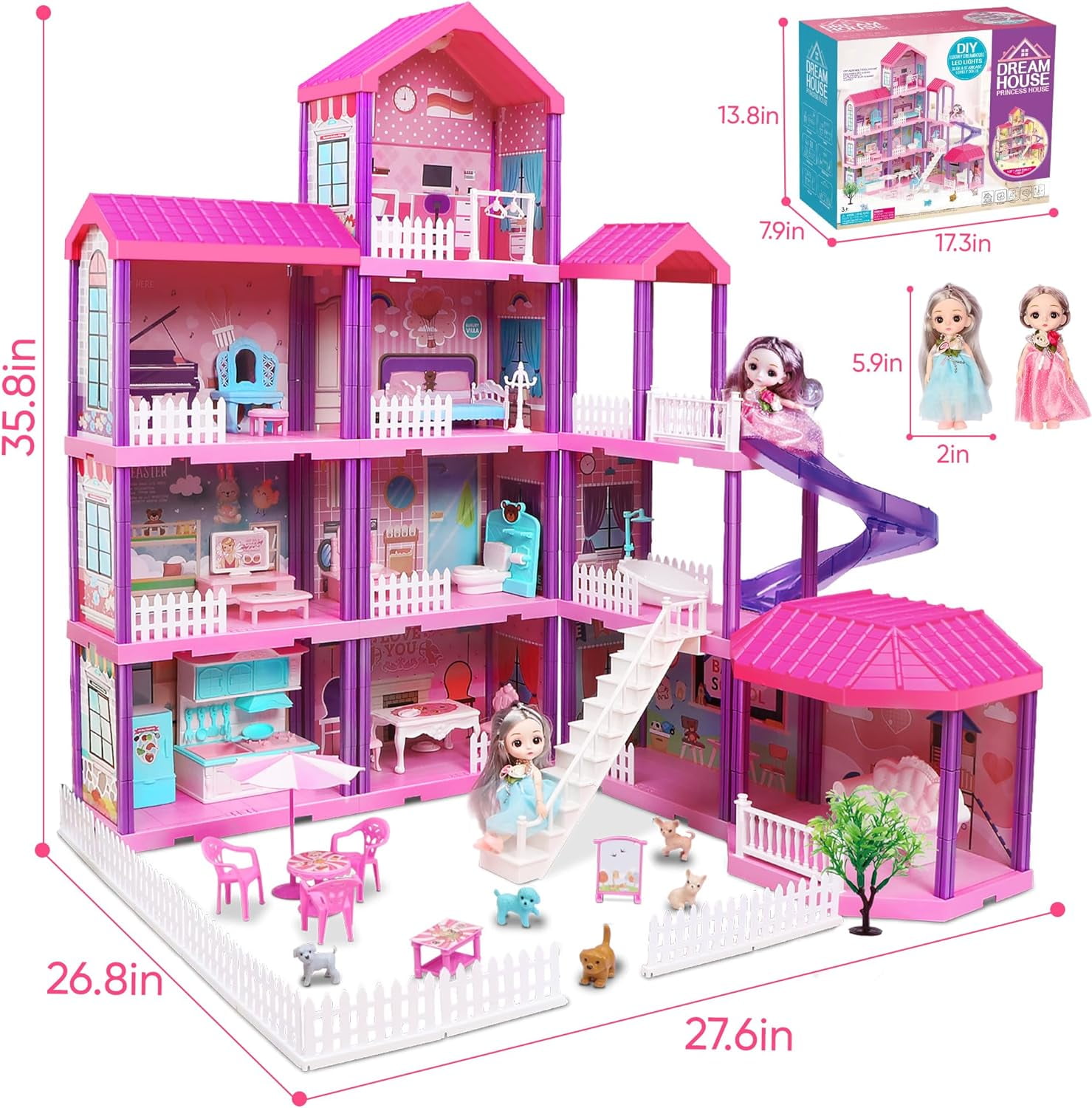 Every girl has a princess dream in her heart. Our dollhouse is the best gift for girls of 3-8 Year old ! Our doll house has 4 floors, 36 inch high, with 11 rooms and 70 accessories. And each room is equipped with a variety of furniture and accessories. And the dollhouse is equipped with two dolls. Kids can create their own stories for the 6-inch dolls. The princess house comes with assembly instructions to make assembly easier. You can follow the instructions on the assembly step by step. At Christmas or your child’s birthday, give it to your child as the best gift wrapped in a big ribbon, or quietly build a beautiful dollhouse to surprise your child. WHAT CAN YOU GET? DollHouse:1 ( 27.6*26.7*35.8 inches) Room:11 Doll:2 (Size: 5.9 inches) Warm Lights: 4 Pack (including batteries)