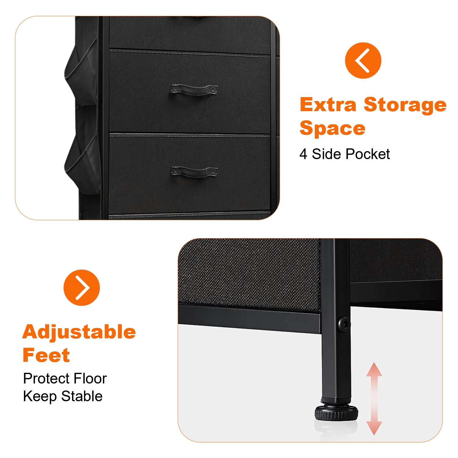 PRACTICAL DESIGN The fabric dresser for bedroom is designed with 11 separate collapsible drawers including 3 different sizes to satisfy your classified storage needs, which provides you endless organizational possibilities. Also, the wood top provides a hard surface fit to place commonly used items, keeping them in your reach. UPGRADED DESIGN SIDE POCKET Compared with others’ closet dressers, our dresser combined 1 side pocket. The side pockets add a extra space for thin items, hooks are handy for an umbrella or shopping bag,which can provide more storage space for your items to meet your different storage needs. SUFFICIENT STORAGE SPACE Our chest of drawers comes with ample space for you to sort out all your belongings so your room can always remain in an immaculate condition. You can easily store your scarves, blankets, clothes, socks, jewelry, and ornaments; arrange and sort them in various drawers. HIGH QUALIY STABLE STRUCTURE This black drawers is made of a sturdy steel frame, MDF wooden waterproof countertop, high-grade non-woven breathable fabric, and PU material, which offers reliable strength and stability, Meanwhile, the back bars upgraded the structural stability again! EASY TO ASSEMBLE The package comes with understandable assembly instructions and numbered parts, you will get a new dresser in a short time. If you have any questions about our 11 drawer dresser, please feel free to contact us, your satisfaction is our first priority. SPECIFICATIONS: Brand : Behost Material : Engineered Wood, Fabric Drawer, Metal Finish Type :Wooden Product Dimensions :37″D x 11.7″W x 48.5″H Number of Drawers :11 Color: Grey, Black,White ,Pink Style: Modern Mounting Type: Free Standing Room Type :Kids Room, Living Room, Bedroom, Hallway, Nursery