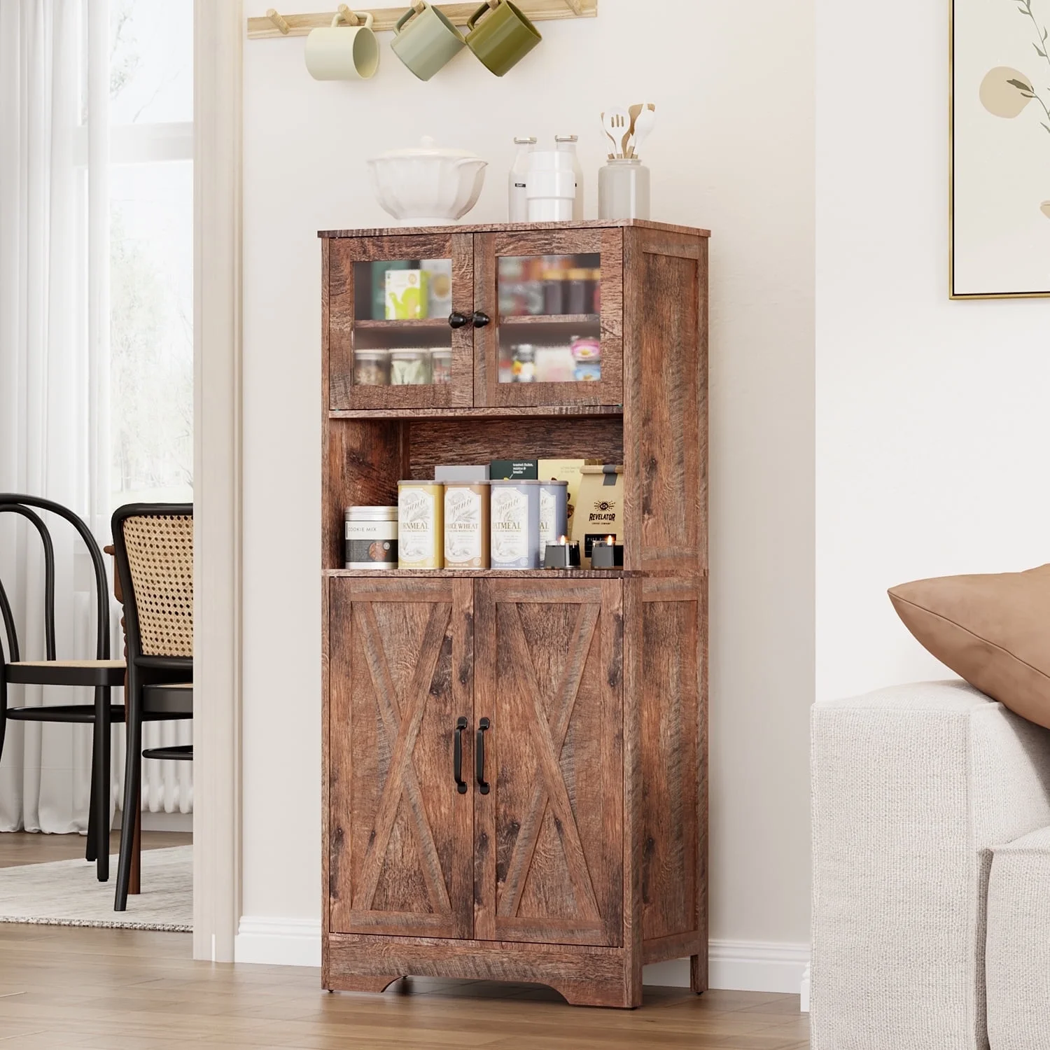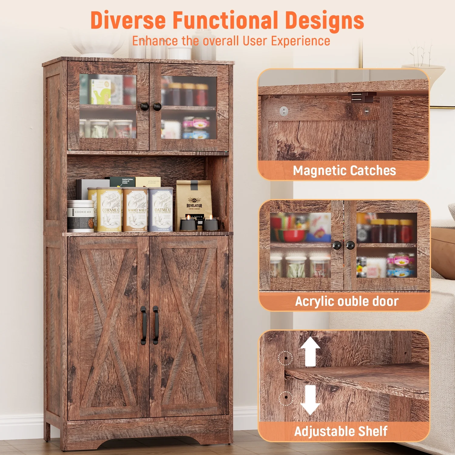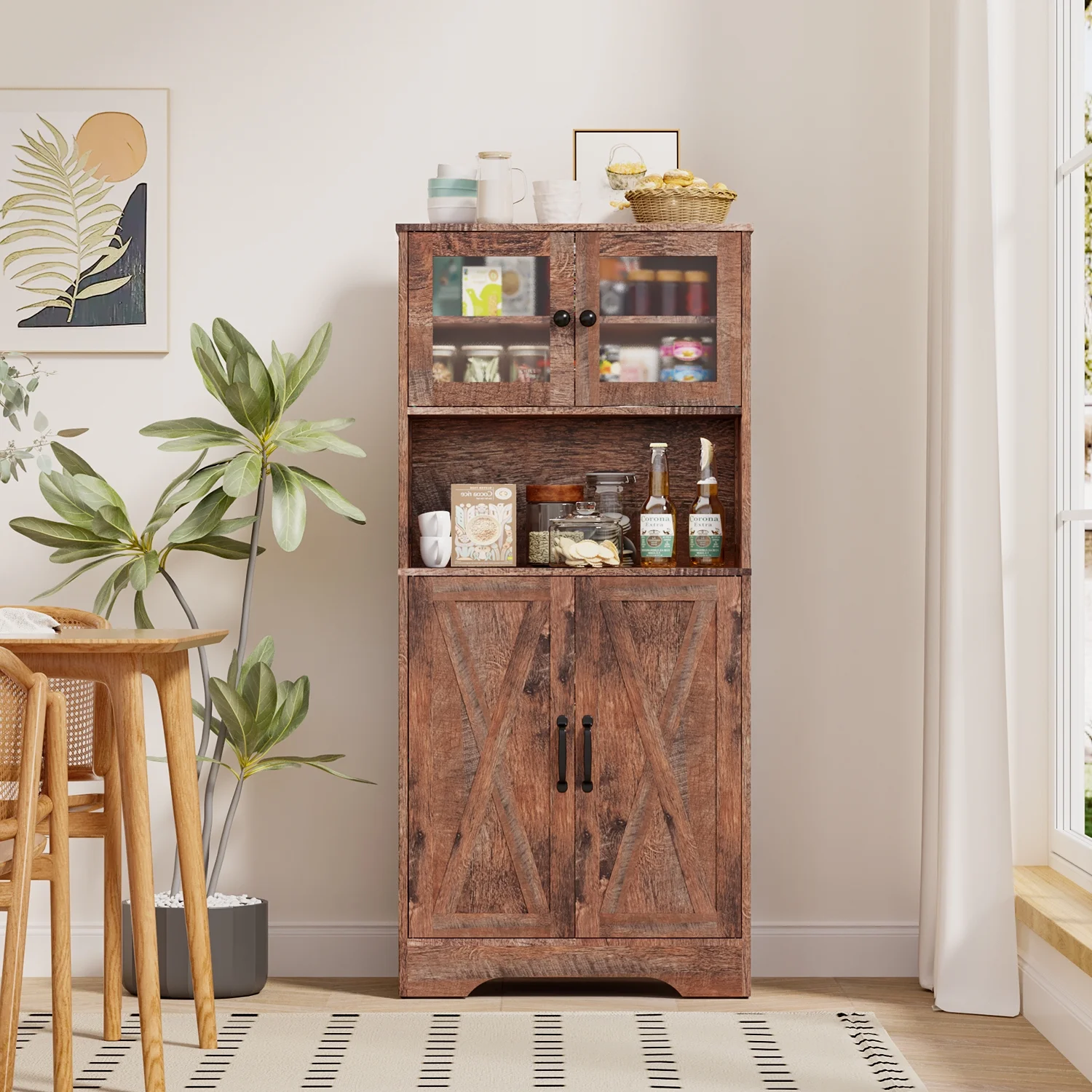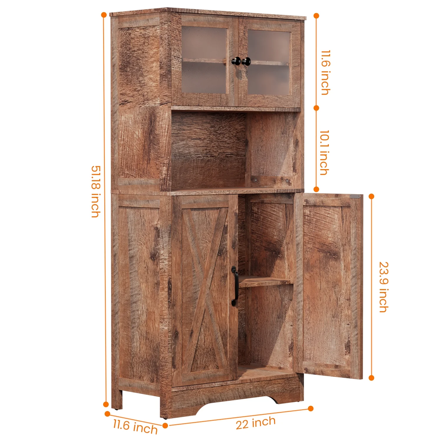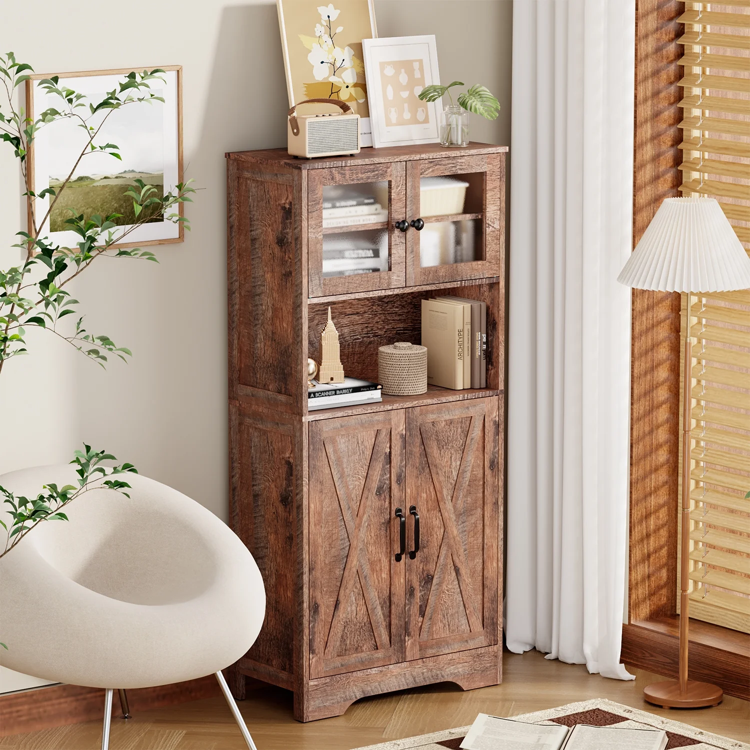 Ample Storage Space :This storage cabinet has a open compartment, 4 doors cabinet,and comes with 5-position height-adjustable shelves inside these two cabinets. Providing the ample storage space for your items of different sizes. Cabinet with Acrylic Doors Design:Top storage cabinet acrylic double door design is convenient to find what you want quickly. Adjustable shelves can meet your requirements for different sizes. Anti-tipping Device:With the anti-tipping device, the storage cabinet can fixed stably to the wall to prevent it from tipping over which adds extra stability and creates a safe environment for your children and pets. Versatile:It transitions effortlessly from a bathroom floor cabinet to a display floor cabinet in your living room, showcasing trophies, collections, and plants. In the kitchen, it becomes a pantry for spices and tableware; in your study, it stands as a bookcase for books and documents. This storage cabinet effortlessly adapts to your ever-changing needs, making it the perfect addition to any room in your home. Be An Artist Of Life:X-shaped industrial style door design with vintage textures.The attractive storage cabinet perfectly combines ample storage capacity and retro charm, easy to match other furniture and complements the room decoration. Easy to Assemble & 24H Customer Service:With clear instructions, numbered parts, and an assembly tool included, you’ll be able to assemble this storage cabinet before you know it. We provide 24 hours customer service to help you with any questions or concerns you may have. Please email us and we will reply within 24 hours.