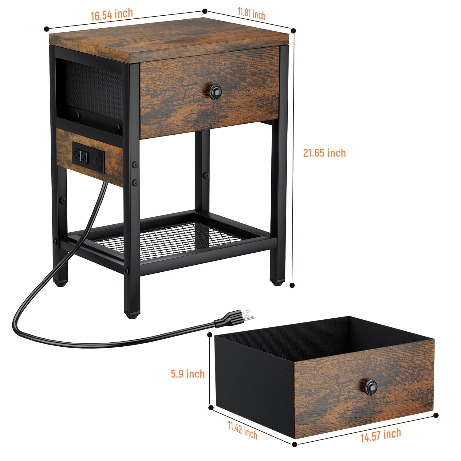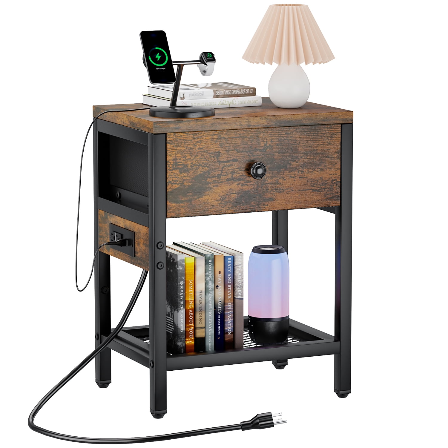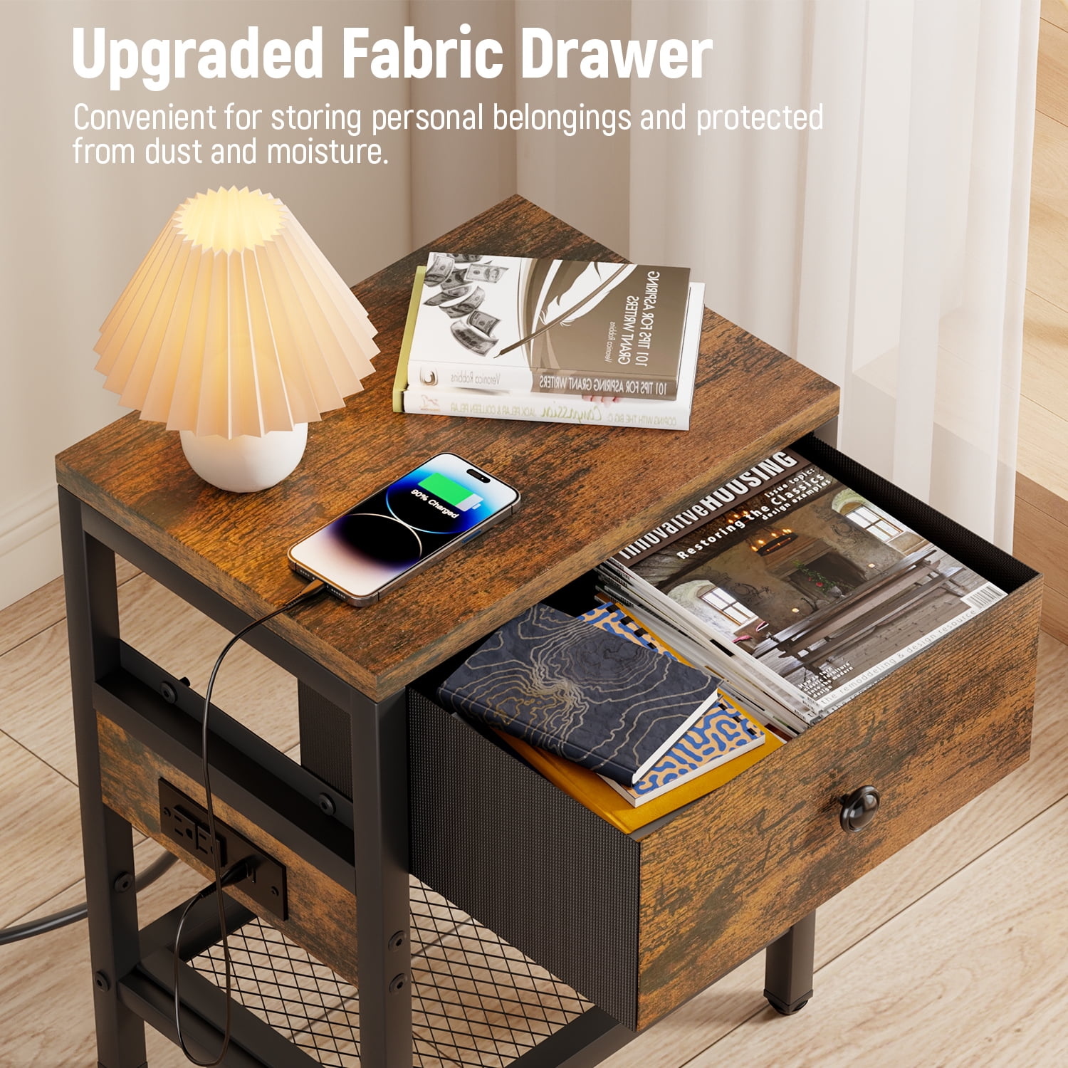 Behost Rustic Brown Nightstand with Charging Station, Side Table with Fabric Drawer, 3 Tiers End Table for Living Room, Bedroom