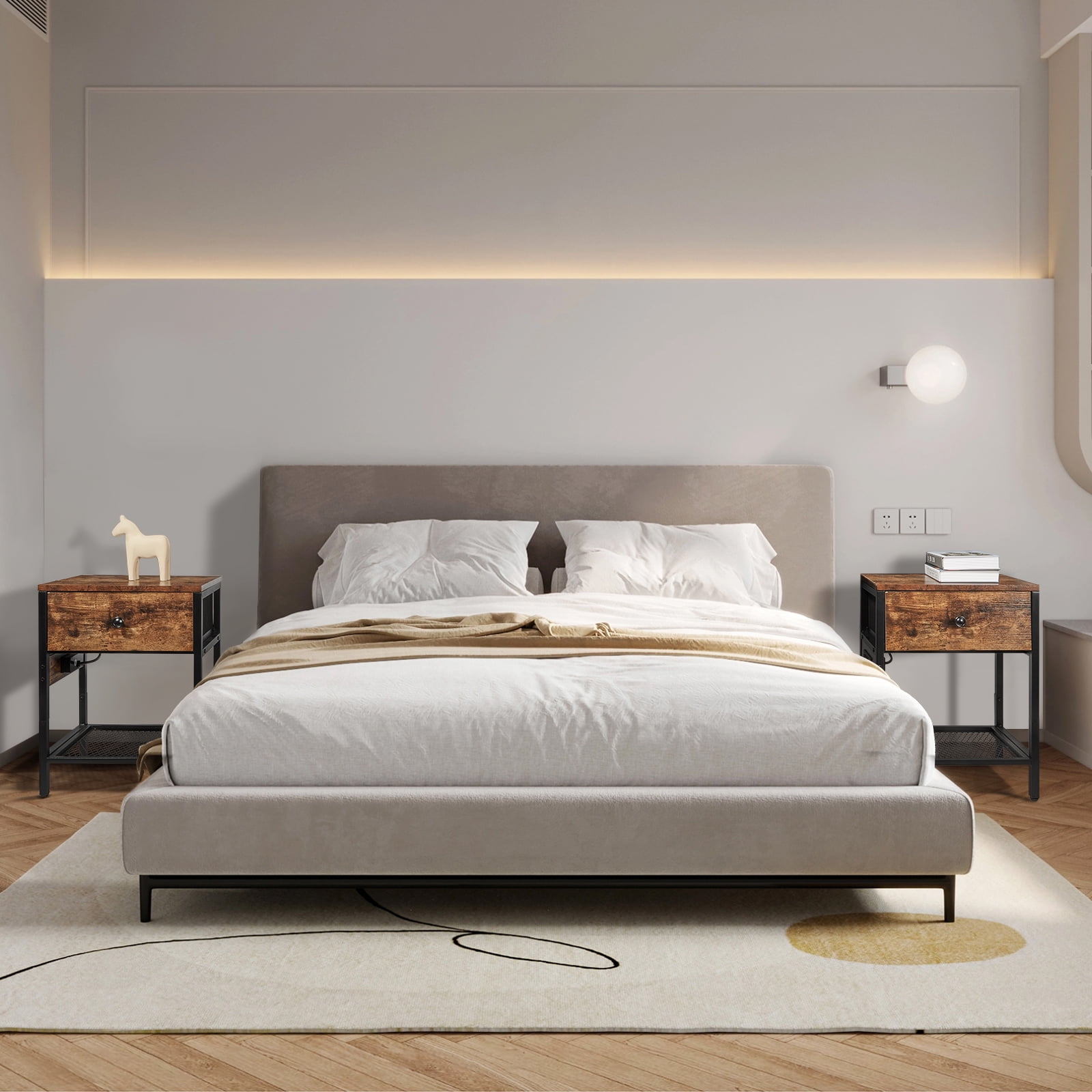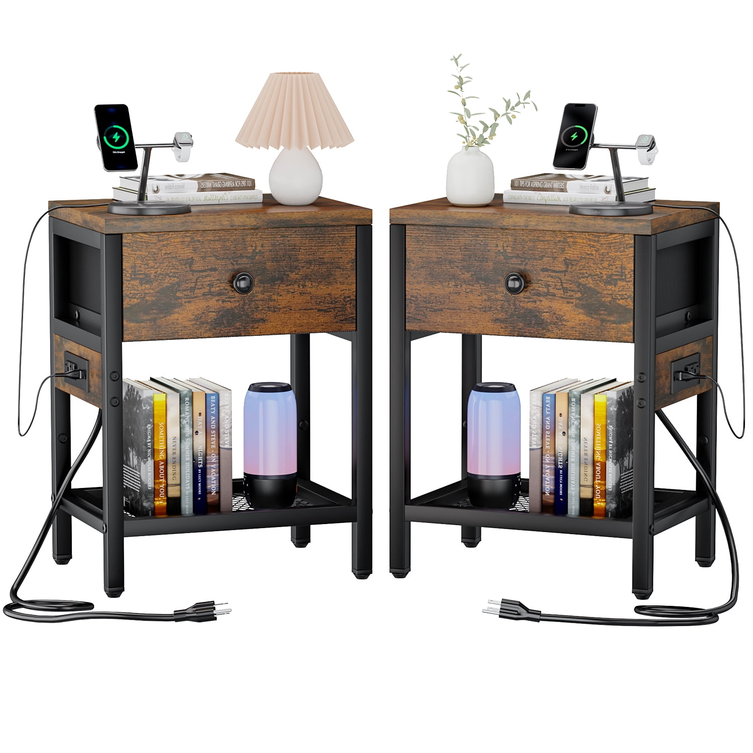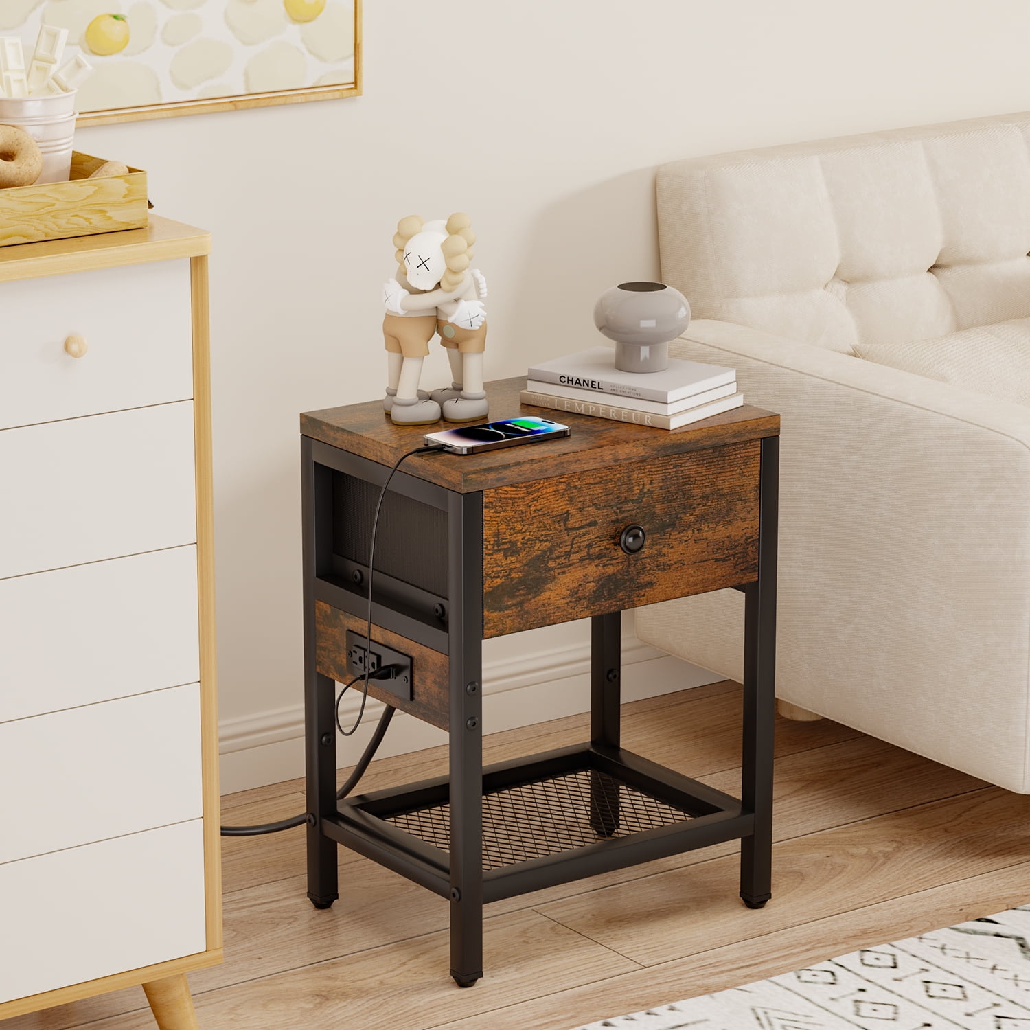 Behost Rustic Brown Nightstand with Charging Station, Side Table with Fabric Drawer, 3 Tiers End Table for Living Room, Bedroom