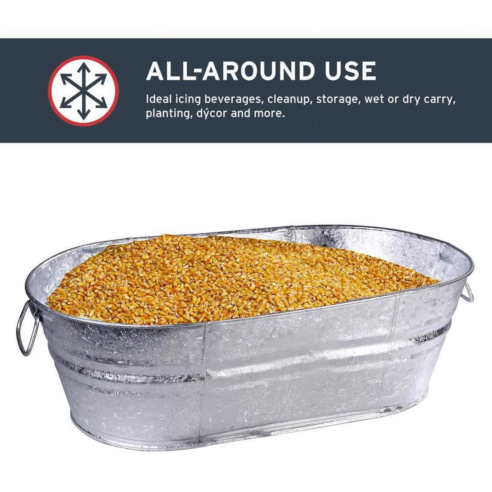 10.5 gallon, hot dipped steel, oval tub, ideal for pet feeder, planters, storage, rodent proof, won’t absorb colors, recyclable, weather resistant, won’t rust.