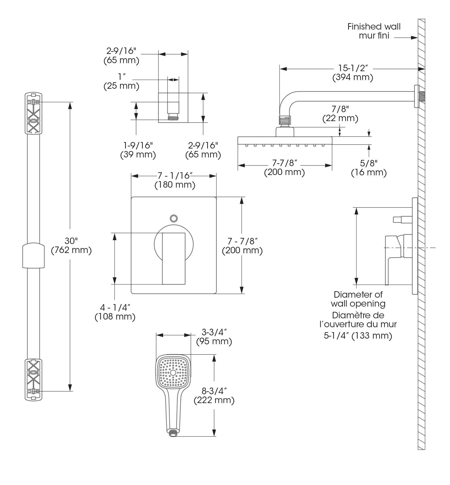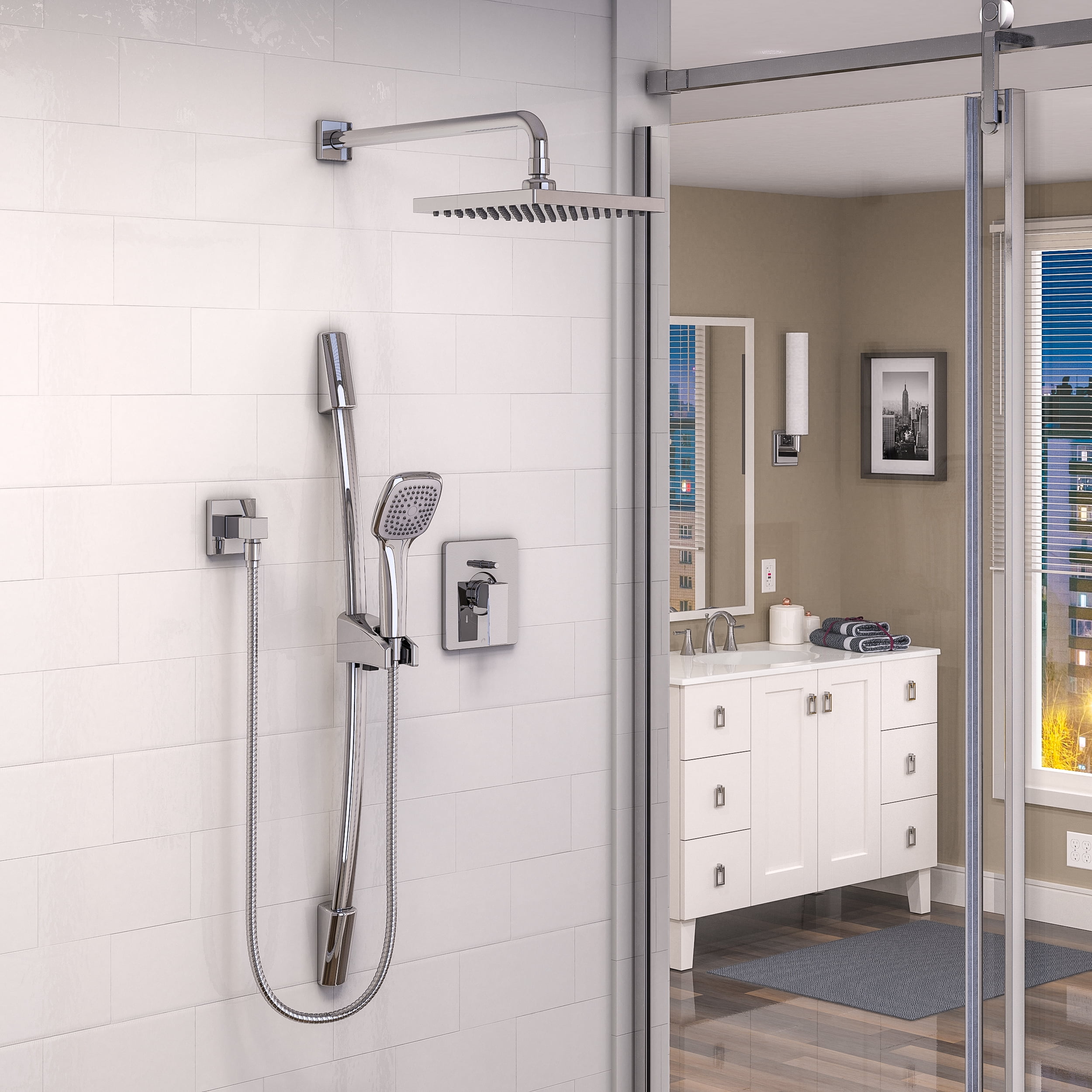 Rainfall showerhead and single-function hand shower Ergonomic single-handle valve allows you to easily adjust volume and temperature Features high-quality ceramic disc cartridge and brass construction 30-in. slide bar with adjustable hand shower holder Soft, easy-to-clean silicone nozzles Includes template for valve installation Water flow rate of 2.5 GPM Polished chrome finish cUPC and ADA compliant Limited Lifetime Warranty