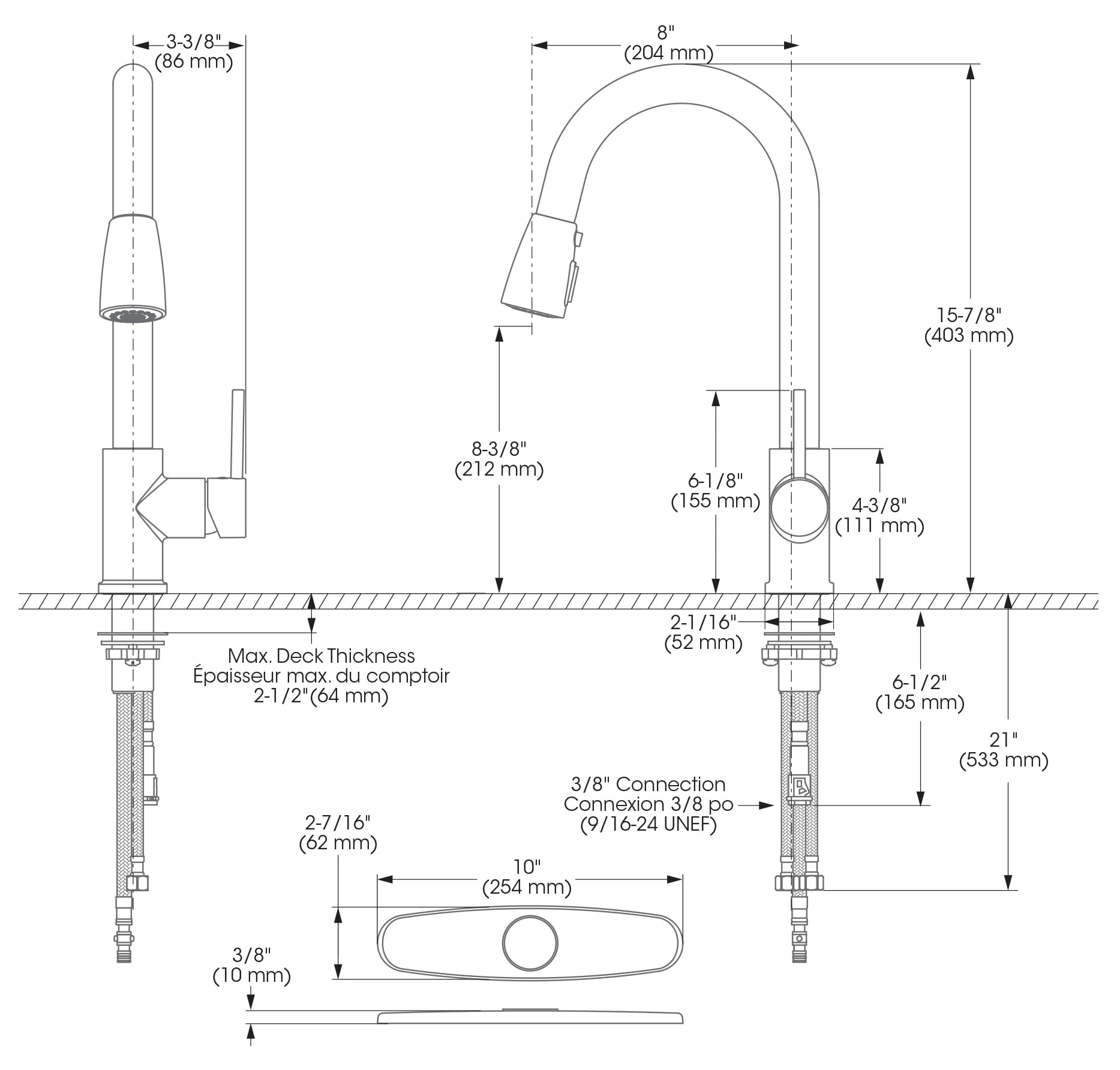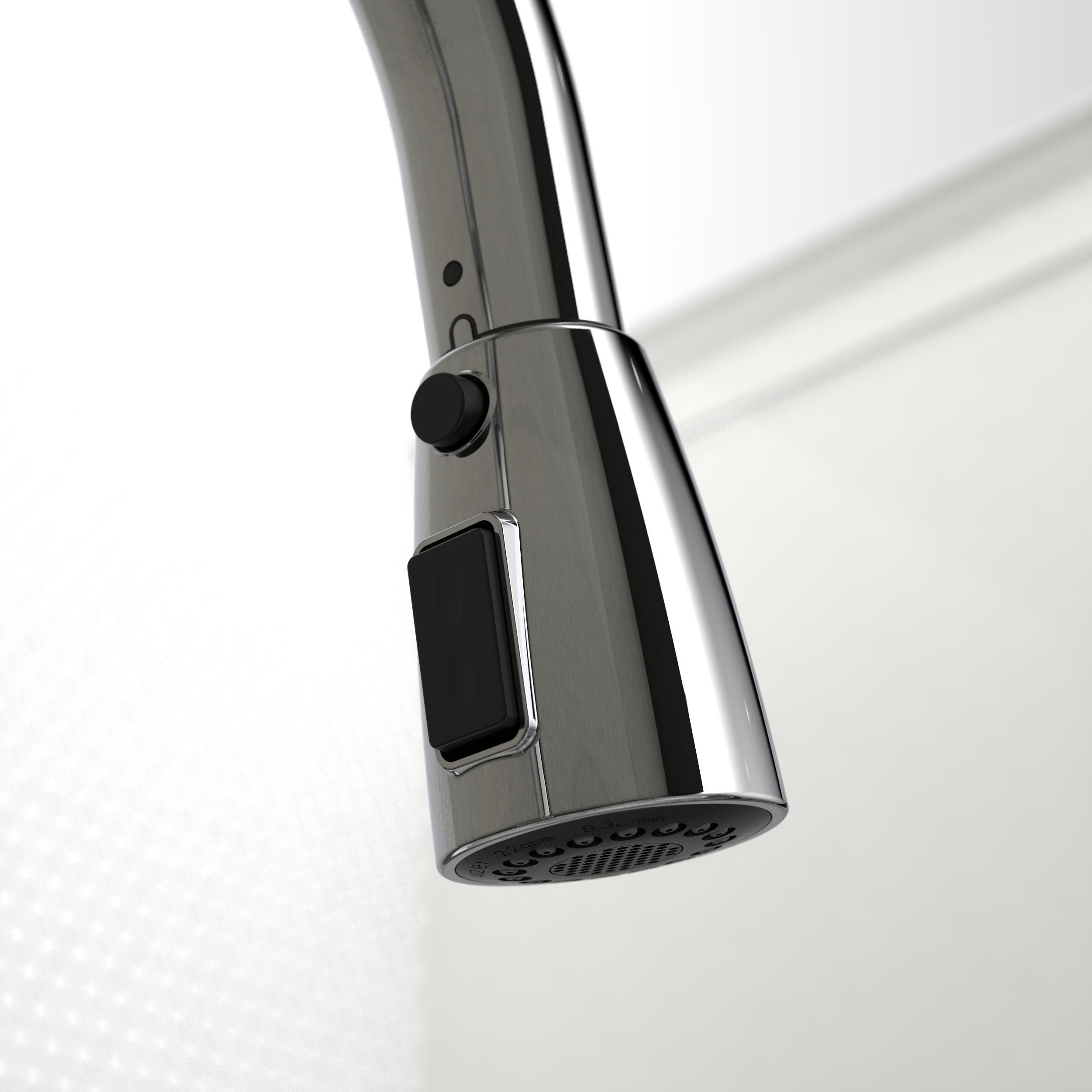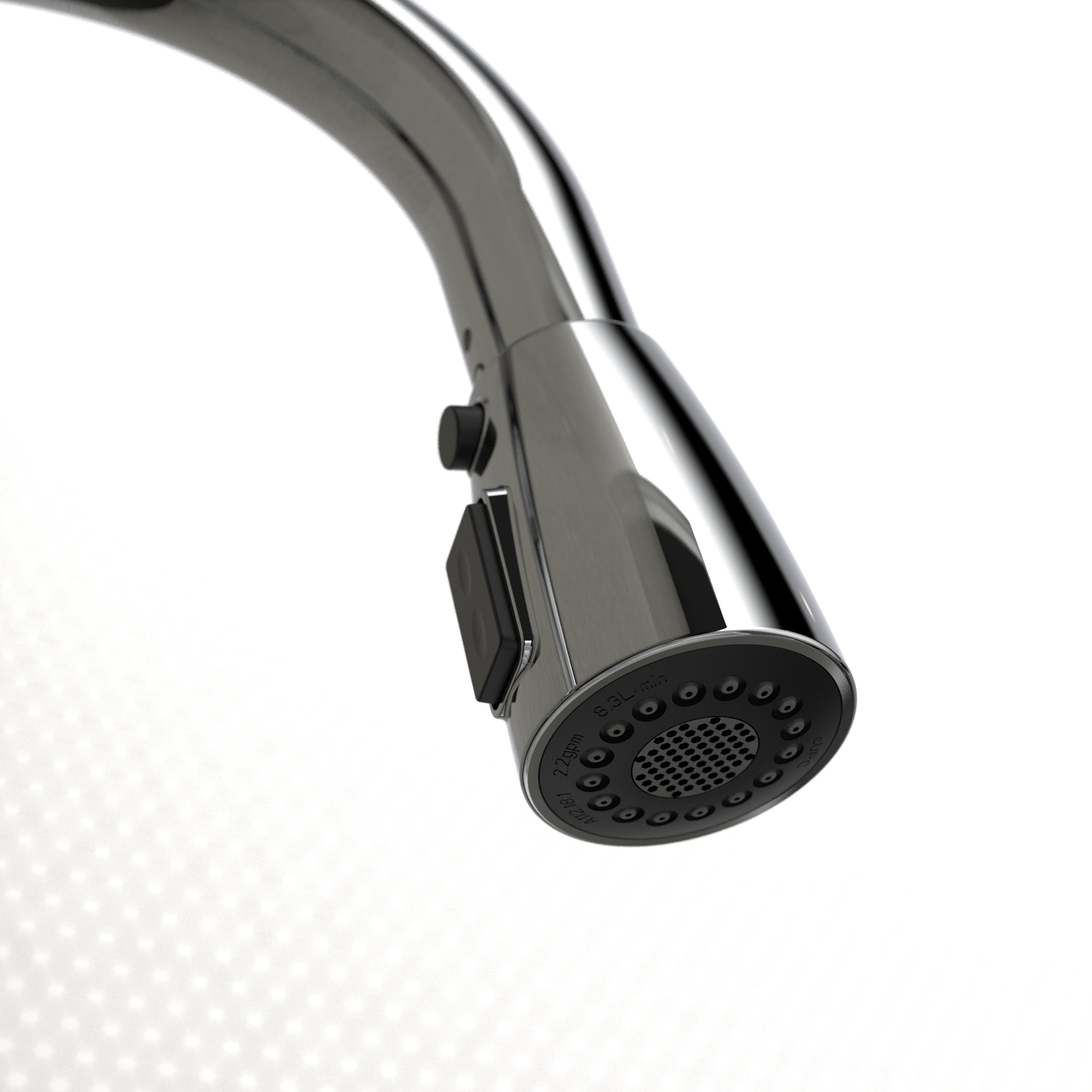Swivel pull-down spout with push-button diverter for stream or spray jets Flexfit with optional matching cover plate for single or 3-hole sink installation High-quality ceramic disc cartridge ensures maintenance-free use Metal exterior shell and brass waterways for long-term durability Ergonomic forward-rotating lever to control water flow and temperature Easy Klik Connection setup for fast installation Easy-to-clean silicone nozzles so you can wipe away build-up from hard water or lime scale Eco-friendly 1.8 GPM flow rate reduces water use without sacrificing performance 3/8-Inch connections with flexible nylon braided connectors Compliance: ADA, cUPC, and cUPC low lead Limited Lifetime Warranty