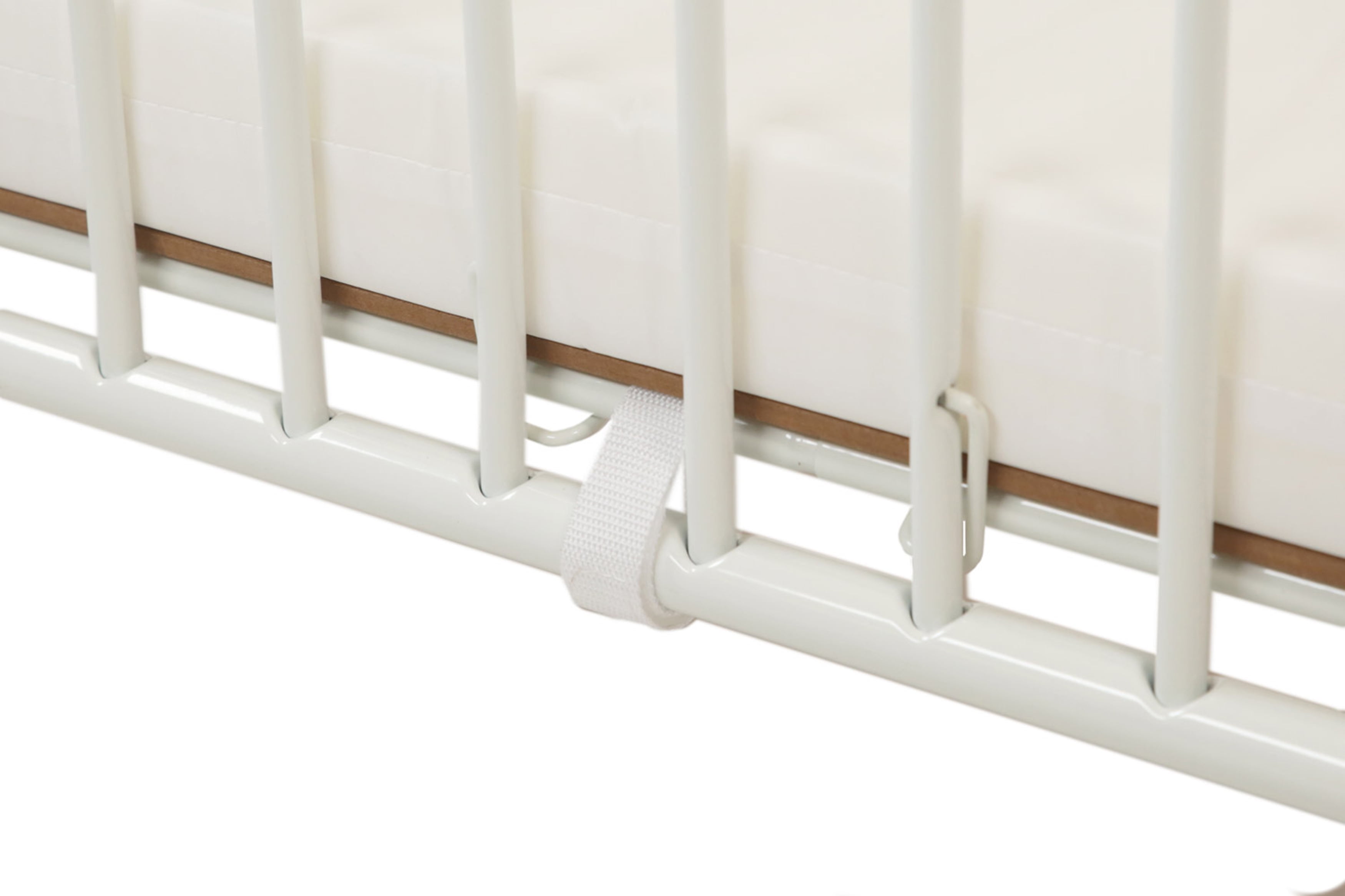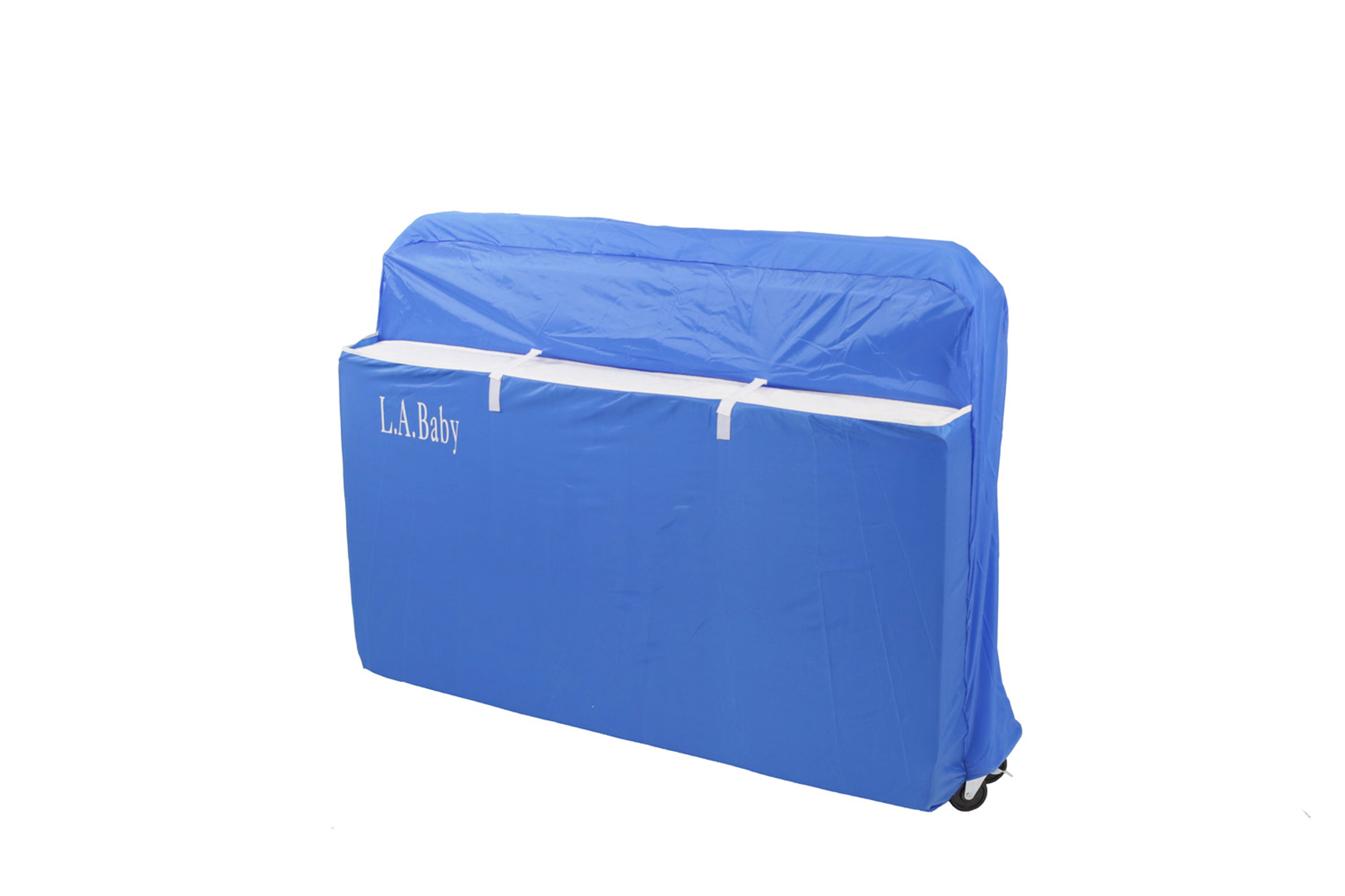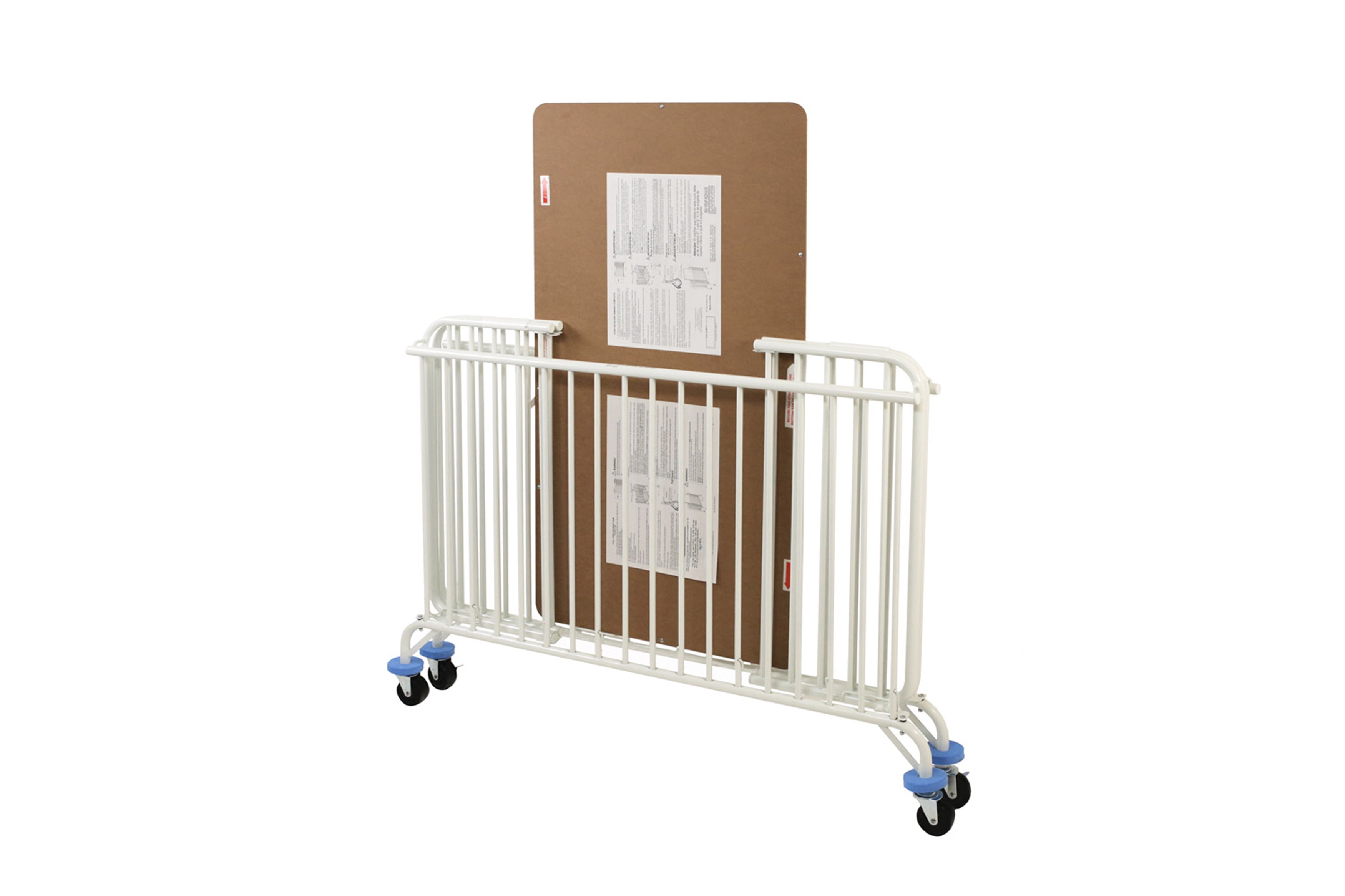 Full Size Metal Holiday Crib, White Full Size Metal Folding Crib Institutional quality folding (28”x52”) full size metal folding crib that comes fully assembled and folds away for easy storage. Easy to clean and scratch resistant non-toxic powder coat finish in white. Accepts a 28” x 52” standard crib mattress which is sold separately and available from L.A. Baby. Braced leg construction assures lateral rigidity in transport. Features exclusive, “Lock-down,” safety floor system. Stationery side rails and one position mattress support for a safe environment for baby, Easy to roll room-to-room, when folded, on heavy duty casters. Foam bumpers are included to protect doorways and other furniture. Meets the Mandatory CPSC 16 CFR 1219 regulations for full size cribs and also meets ASTM 2710 commercial crib regulations to withstand the rigors of a day care or other commercial environment. Instructions in English and Spanish included. Optional nylon storage cover is available. – Color: White – Item Height: 41 – Item Width: 29.5 – Item Weight: 70 – Assembled Length: 53.5