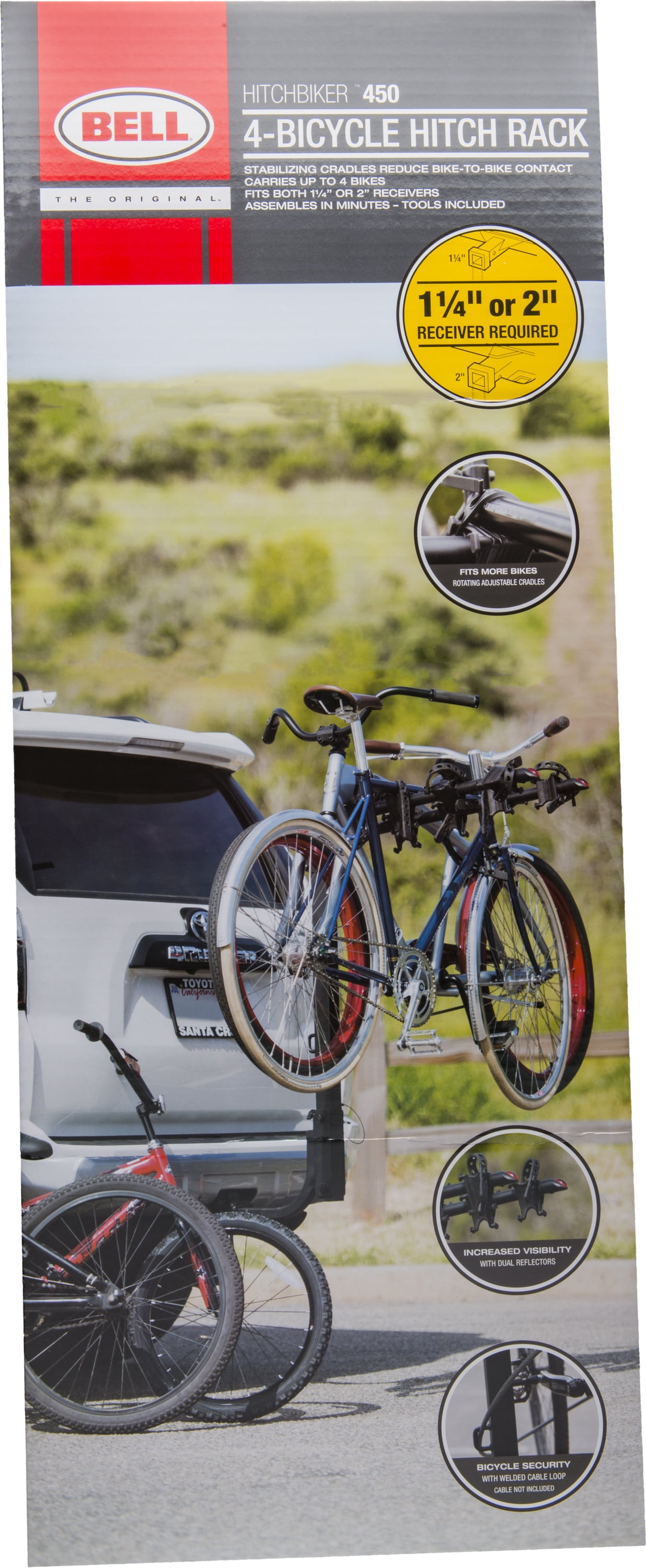 Bell Hitchbiker 450 4-Bike Hitch Rack, Gray Foldable Fits 1-1/4″ and 2″ receivers. Soft stable cradles