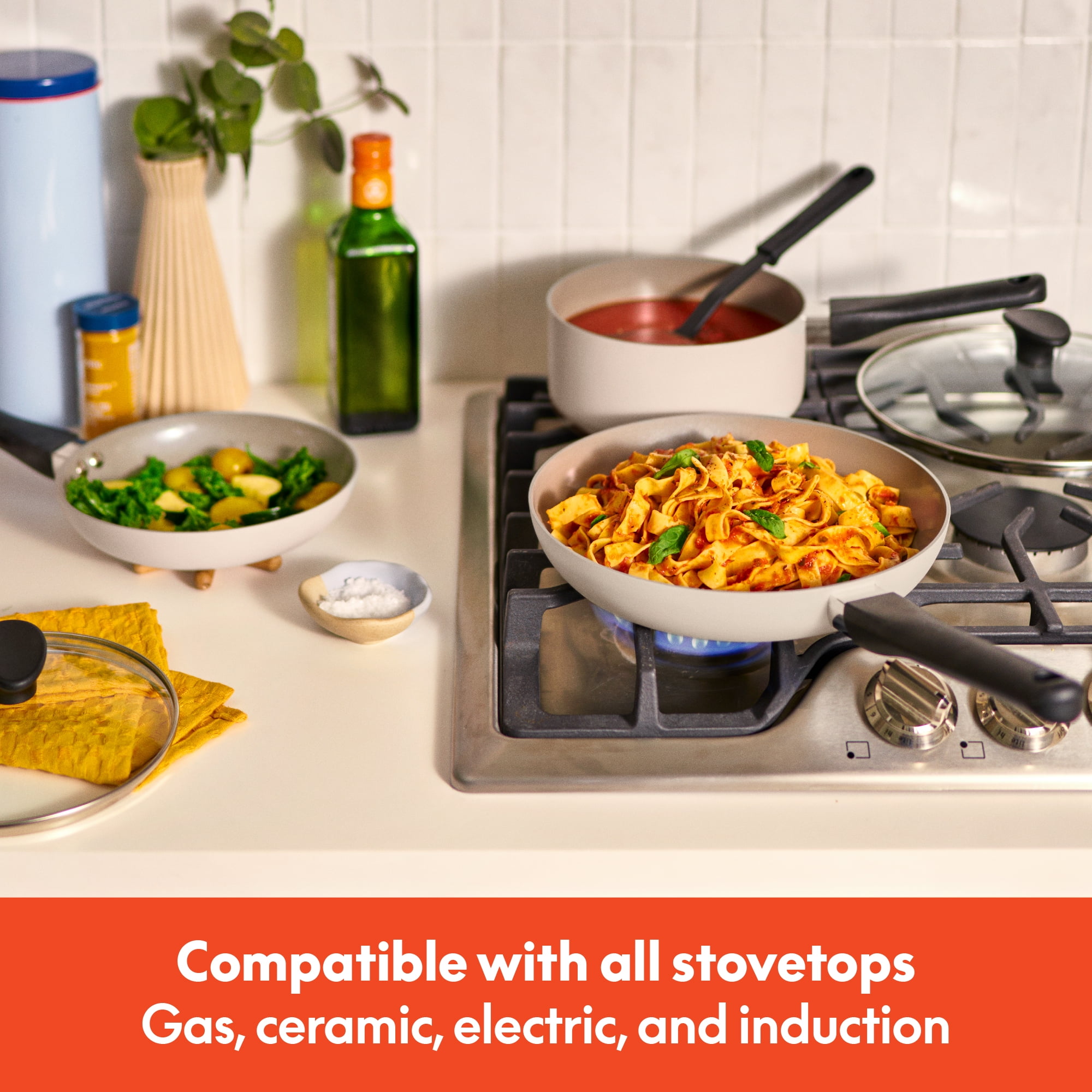 Set includes: 8” fry pan;10” fry pan; 2qt saucepan with lid; 3qt sauté pan with lid; 5qt casserole with lid; 10” x 15” baking sheet; 9” x 13” baking sheet; 6 cooking utensils; and 5 glass storage bowls with lids EverGood™ Ceramic Nonstick Coating Cookware is oven safe to 350°F Stay cool, comfort grip handles Cookware is compatible with all stovetops, including induction Cookware is dishwasher safe, hand wash recommended
