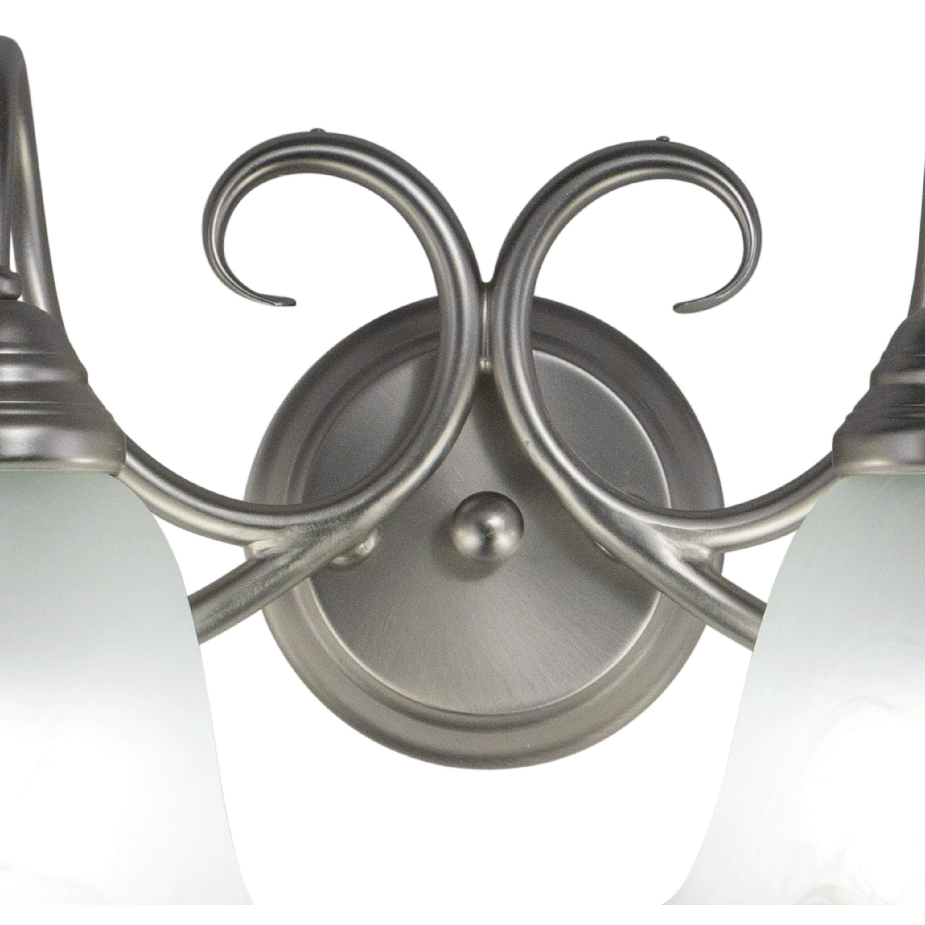 The Bella collection features a brushed nickel finish with white alabaster glass shades. The shades are delicately scalloped softening the overall feel. Elegantly scrolled arms complete the look of this transitional family of fixtures. This fixture may be mounted up or down. Choose from a variety of sizes for the perfect fit in your space.