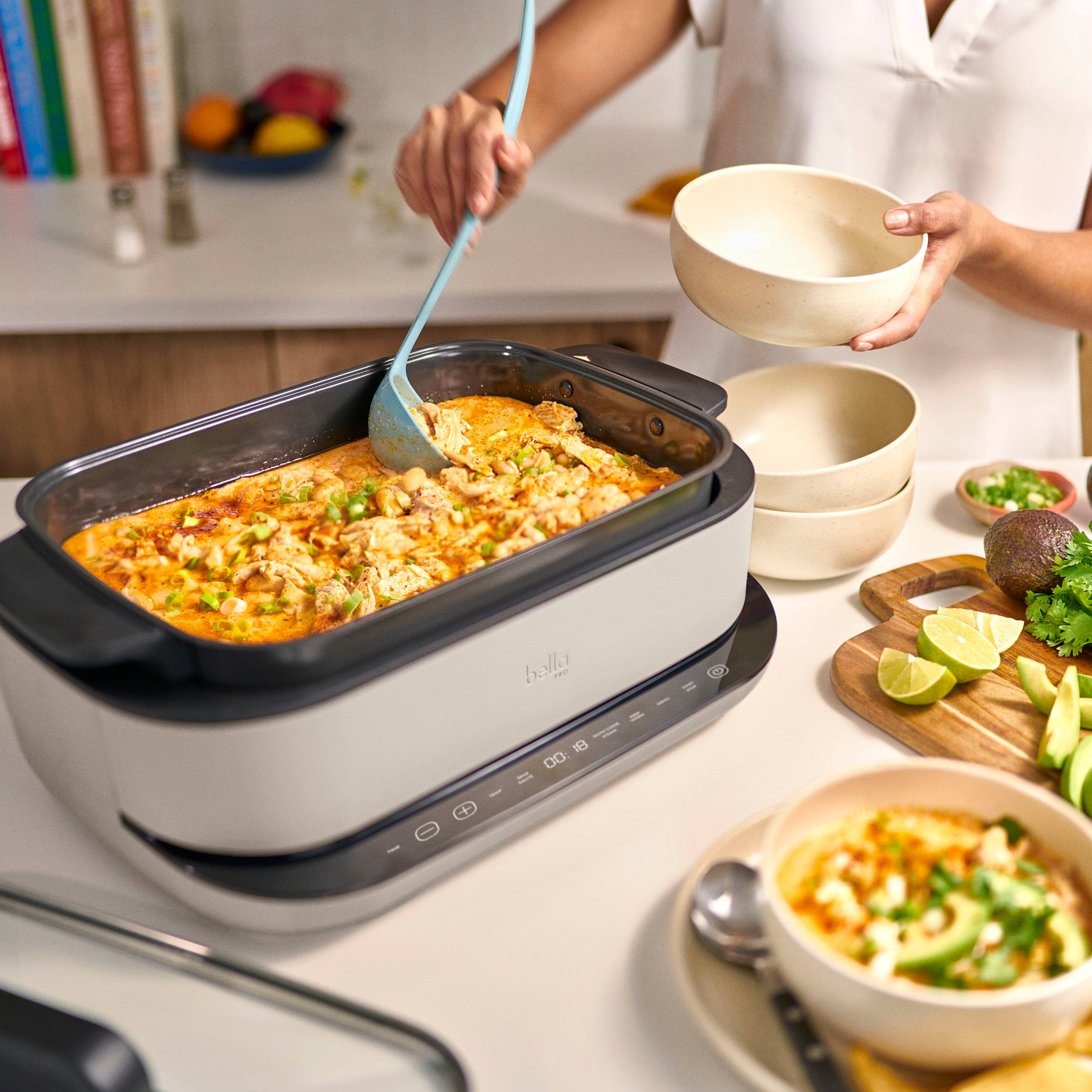 A one-pot meal maker, the bella PRO 6-qt. Multicooker with Sear Function lets you sear meats right in the pot and finish it off in the cooker, so you don’t need the mess of an extra pan. It can sear, sauté, and steam, and the pot features bella PRO’s EverGood Ceramic Nonstick Coating that’s made without PFAS, PFOA, PTFE, Lead, and Cadmium for easy cleanup. Plus, the generous capacity feeds up to 7, making it perfect for feeding a crowd. It’s programmable up to 12 hour, so you can plan ahead and let it do all the cooking for you.