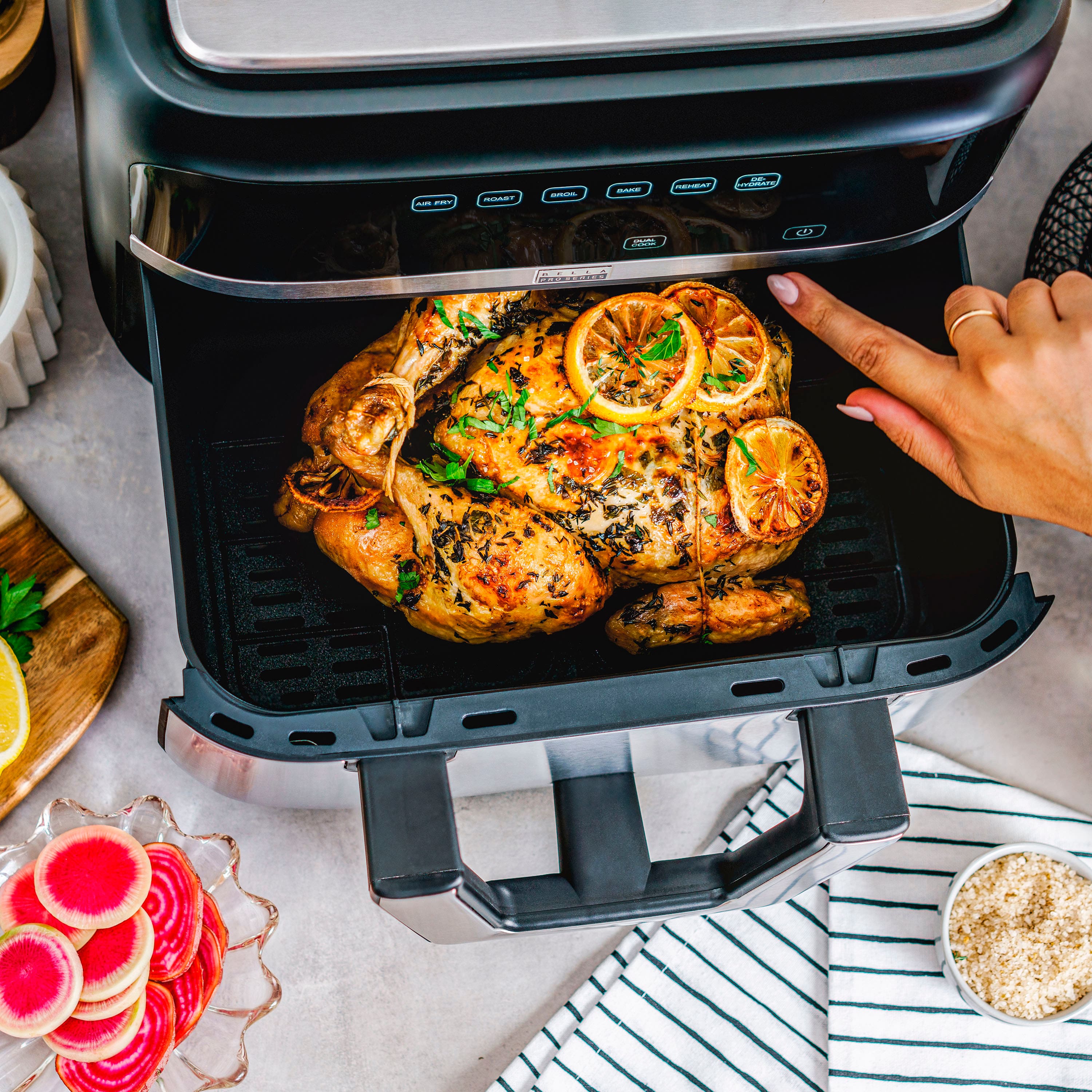 The new bella PRO 9-qt. TriZone Touchscreen Air Fryer with Dual Flex Basket is every multi-tasker’s dream come true. You can now cook two different foods two different ways, simultaneously, and still have them finish at the same time. Our innovative touch screen display gives it the touch of sleek and allows you to easily customize your method with 6 built-in smart cooking functions. Make a full load of the same dish using the extra large 9-quart capacity by easily syncing the cook settings across both baskets. Thoughtfully designed and easy to operate, this product is what you need to take your cooking up a notch. Made without PFAS, PFOA, PTFE, Lead, and Cadmium, the EverGood Ceramic Nonstick Coating gives you confidence & peace of mind when using this air fryer, while dishwasher-safe parts simplify the cleanup process and save you valuable time.