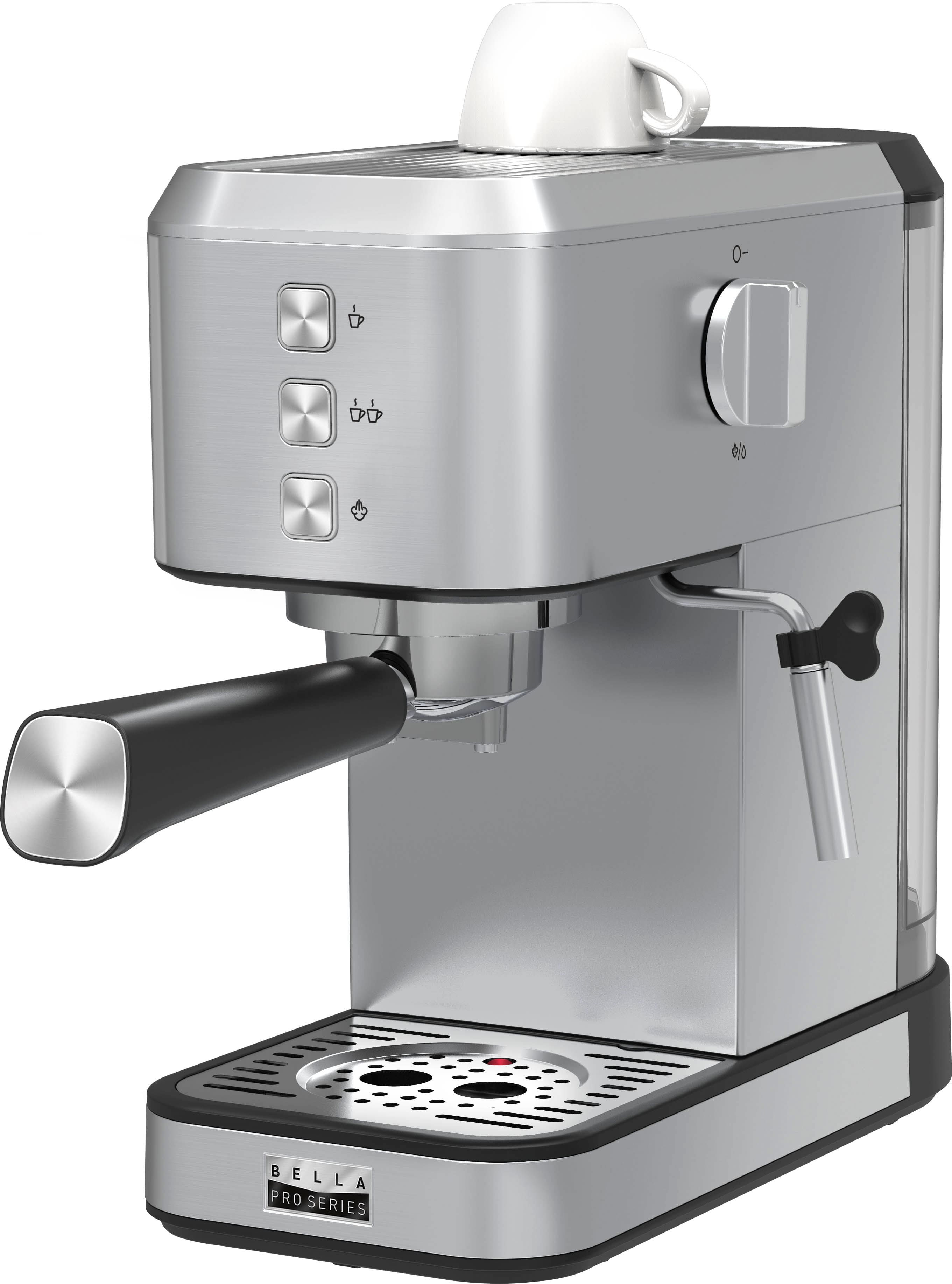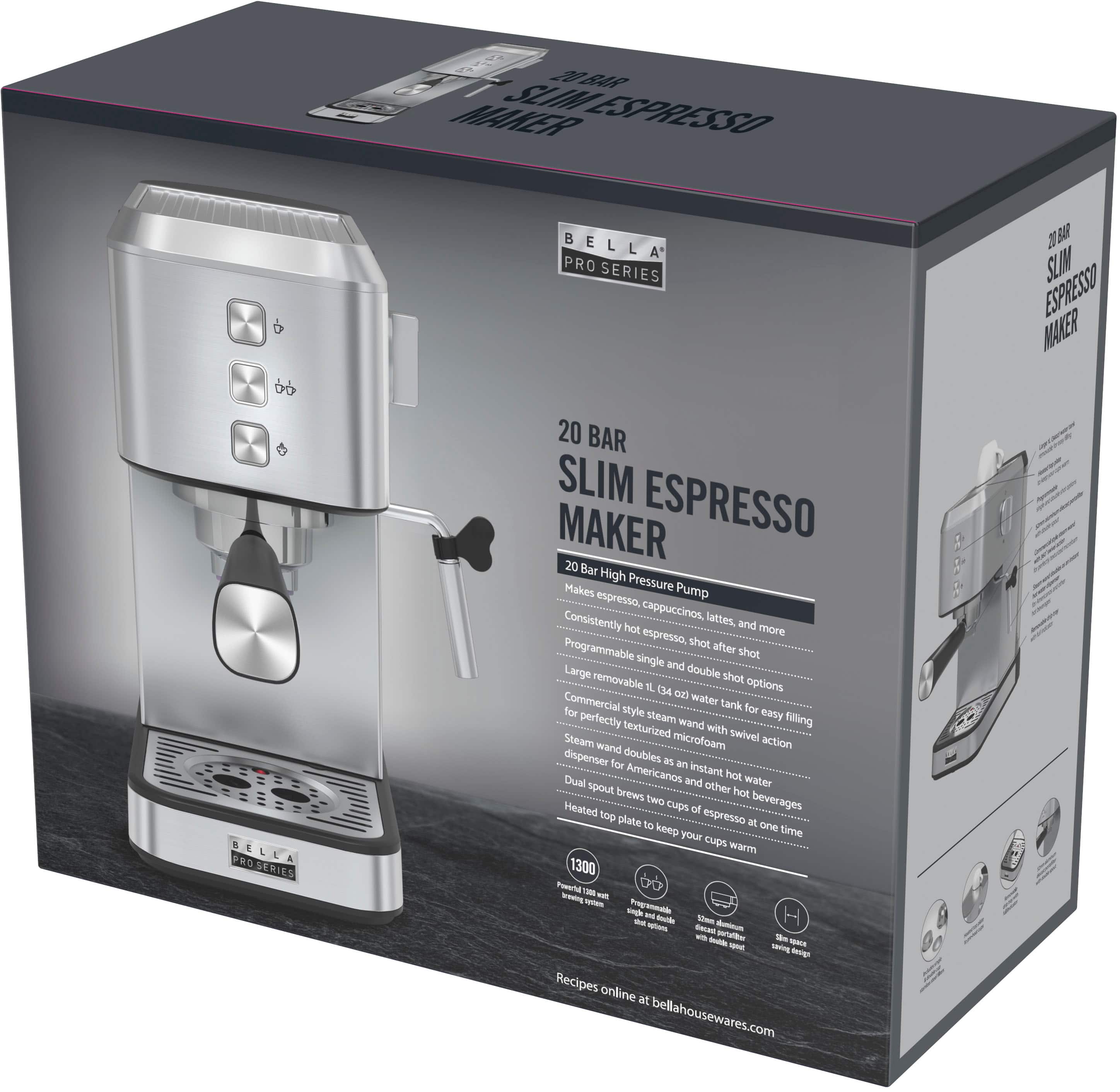 Experience the perfect cup of espresso with this bella PRO Slim Espresso Machine with 20 Bars of Pressure. This sleek and powerful machine combines innovative features with elegant design to deliver a truly exceptional coffee experience. Its 20-bar high-pressure pump ensures optimal extraction, resulting in rich and intense flavors in every shot. The commercial-style steam wand with 360° swivel creates perfectly texturized microfoam for delicious lattes and cappuccinos, while also conveniently serving as an instant hot water dispenser for brewing Americanos and other hot beverages. With a heated top plate to keep your cups warm and a removable 1L water tank, you can enjoy convenience and consistently hot espresso. Complete with a powerful 1300 watt brewing system, single & double cup stainless steel filters, and a removable drip tray with full indicator for easy cleaning.