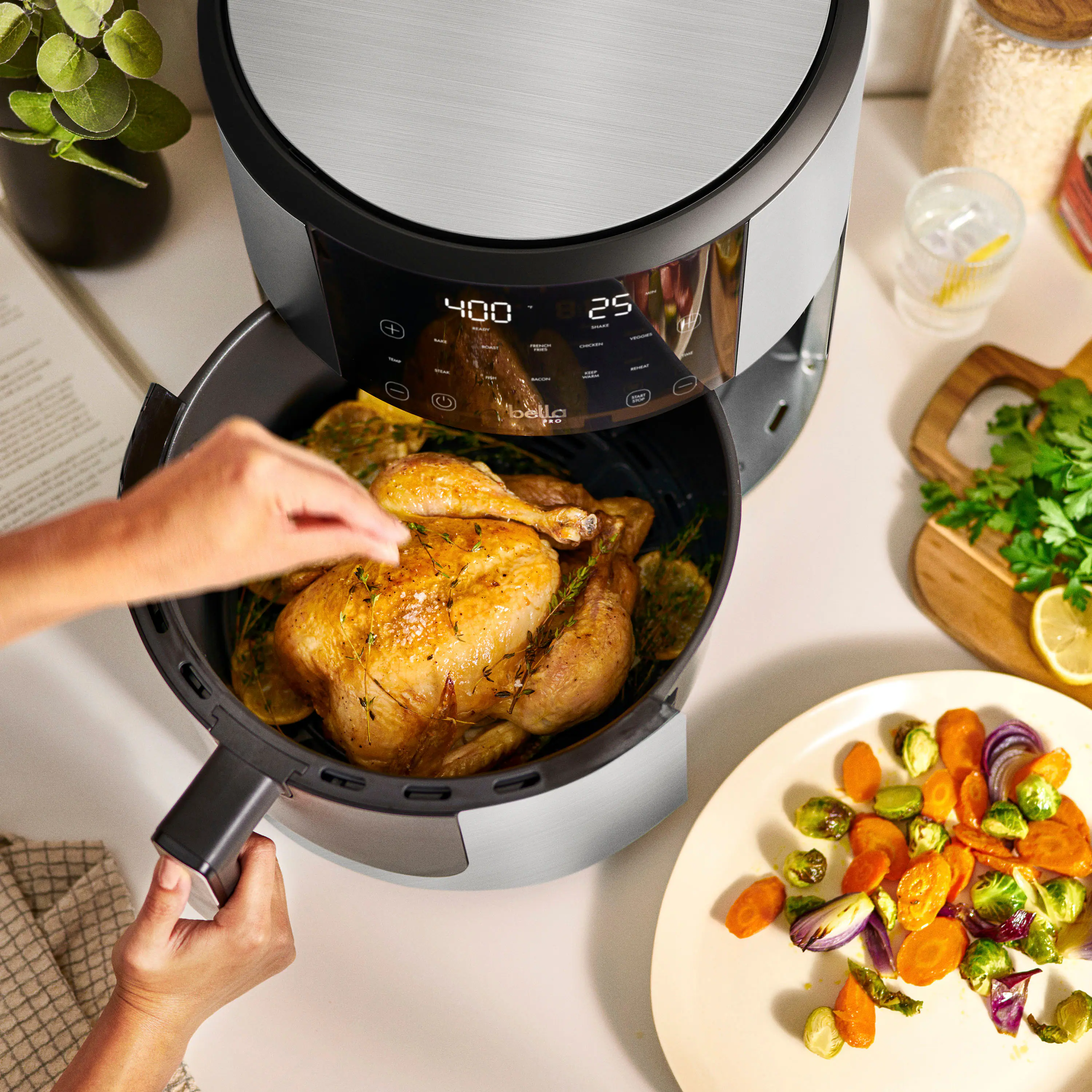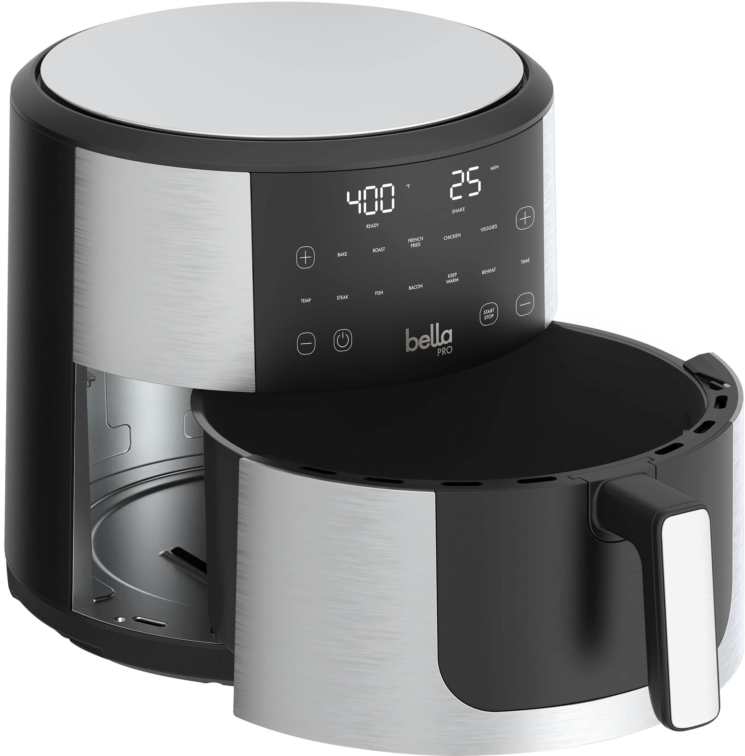A do-it-all-and-more powerhouse, the bella PRO SmartCrisp 8-qt. Touchscreen Air Fryer feeds a family of 8. The spacious basket holds more than 6lbs of food and features EverGood Ceramic Nonstick Coating that’s made without PFAS, PFOA, PTFE, Lead, and Cadmium. Simple, digital display with one-touch custom cooking options that include Air Fry, Roast, Broil, Bake, Reheat, and Dehydrate. Plus, it has a Shake feature that alerts you when it’s time to shake up your food for a perfect crispy finish. Air fryers use little to no oil for 75% less fat than traditional deep frying, making it a healthy option for you and your family.