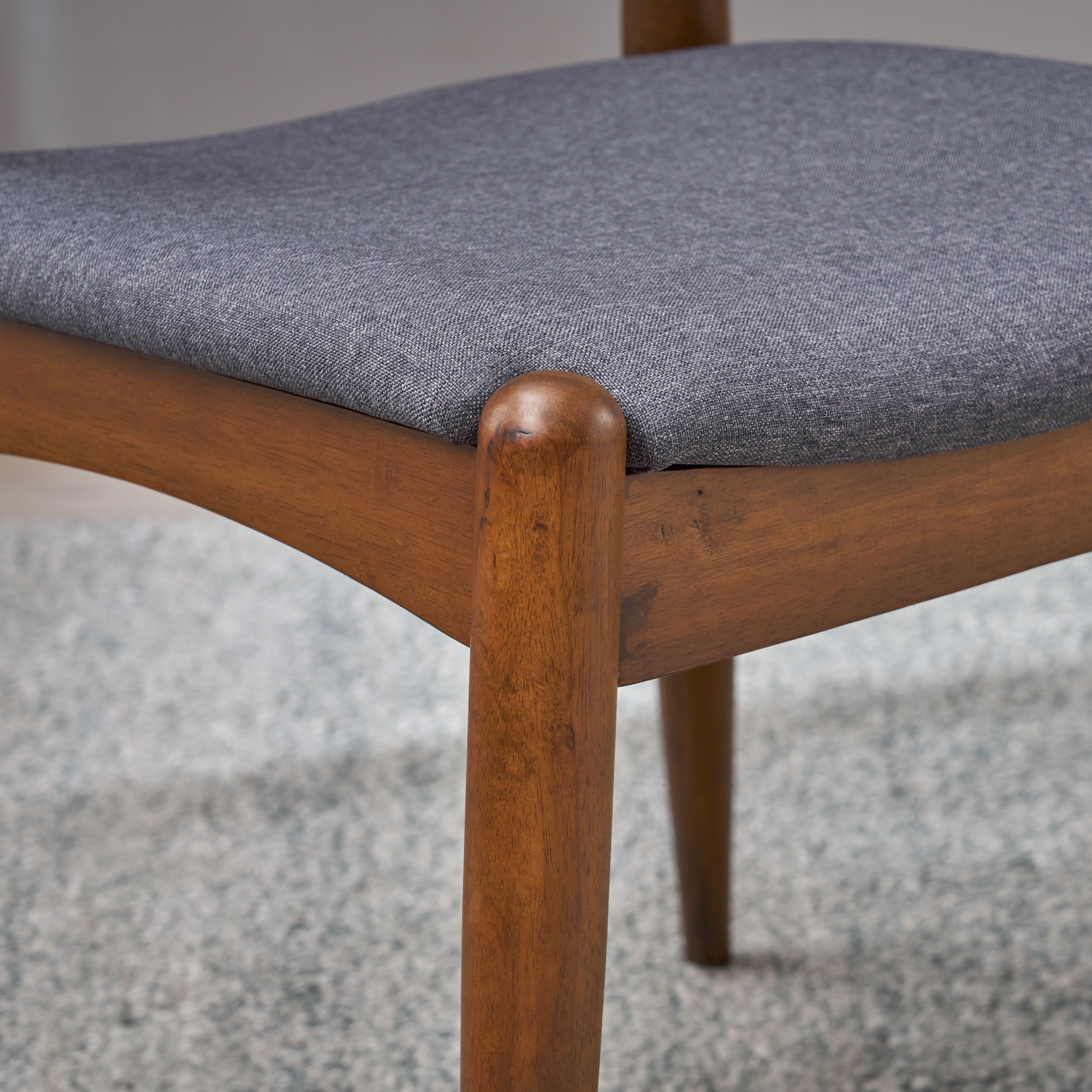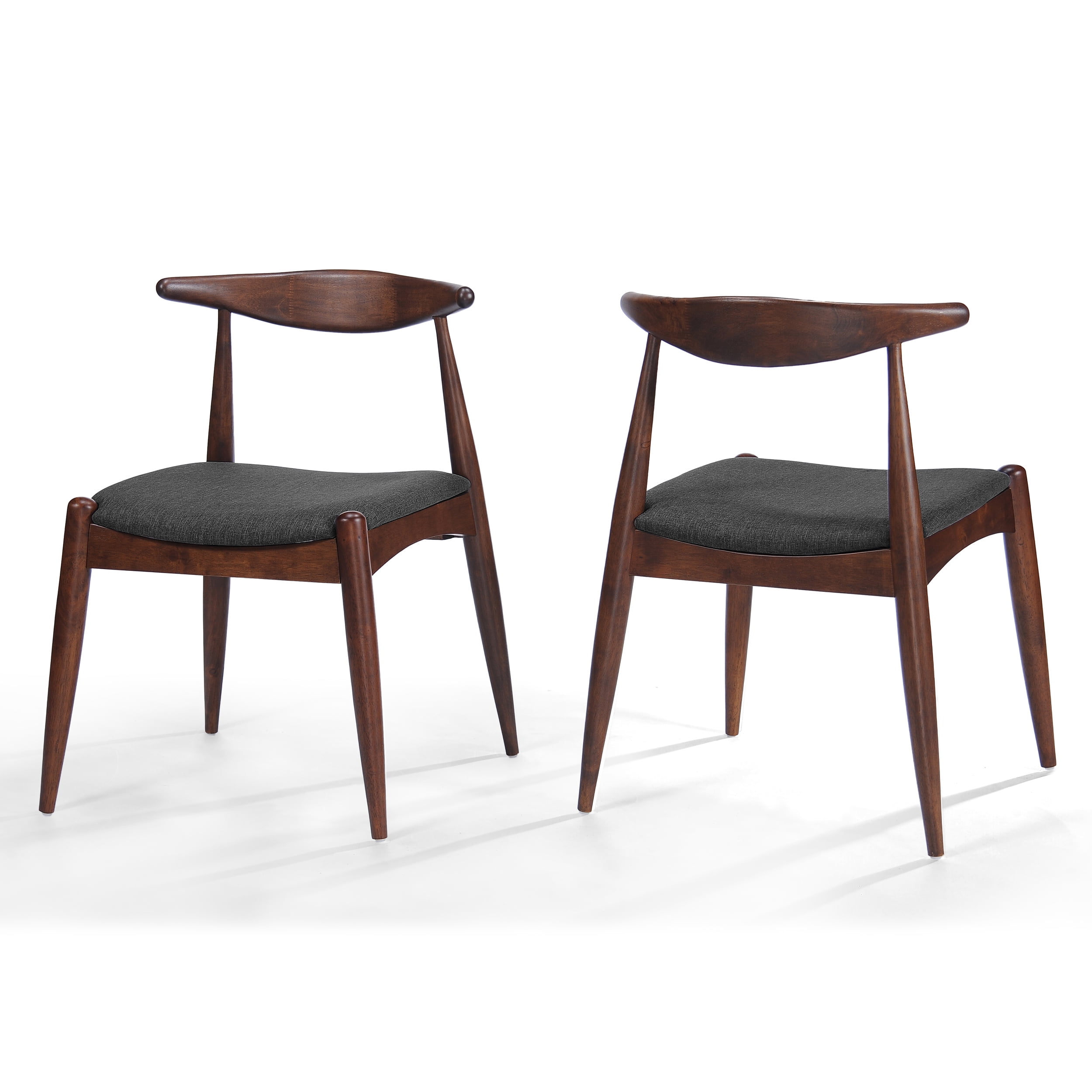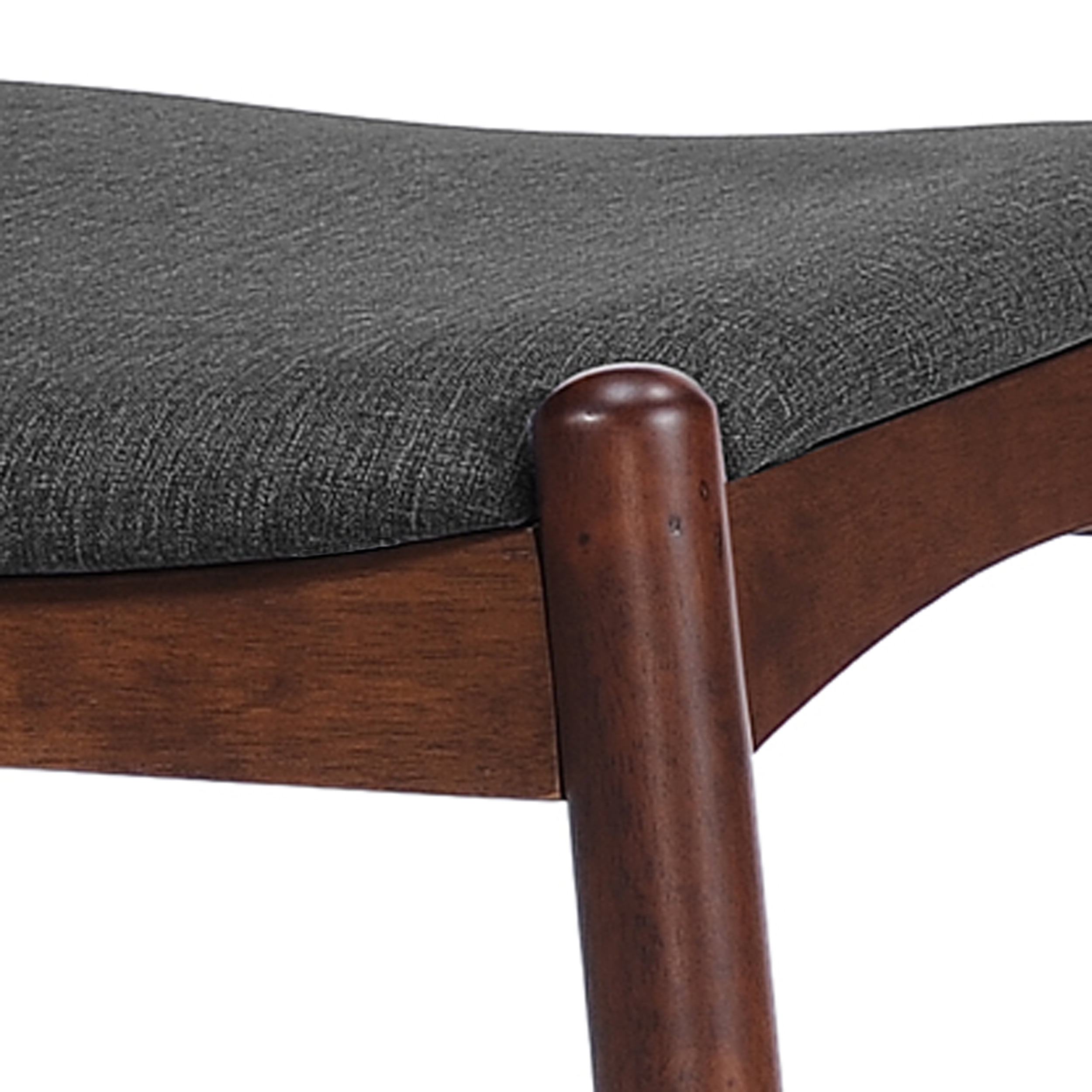 Give your interior space a new look by adding our classy dining chairs to your dining set for a fresh, mid-century modern style. Designed with minimalistic lines, our chair set lends compact comfort that allows you to make the most out of your space. Featuring an open back frame and slim tapered legs, this chair set emphasizes fresh design and simplistic structure, a perfect addition to any interior space. These dining chairs offer upholstered cushions in a refined charcoal color that is complemented by its smooth rubberwood frame with a deep walnut finish. Accented with iconic flared legs, this dining chair set will elevate your aesthetics to the next level with its sophisticated looks.