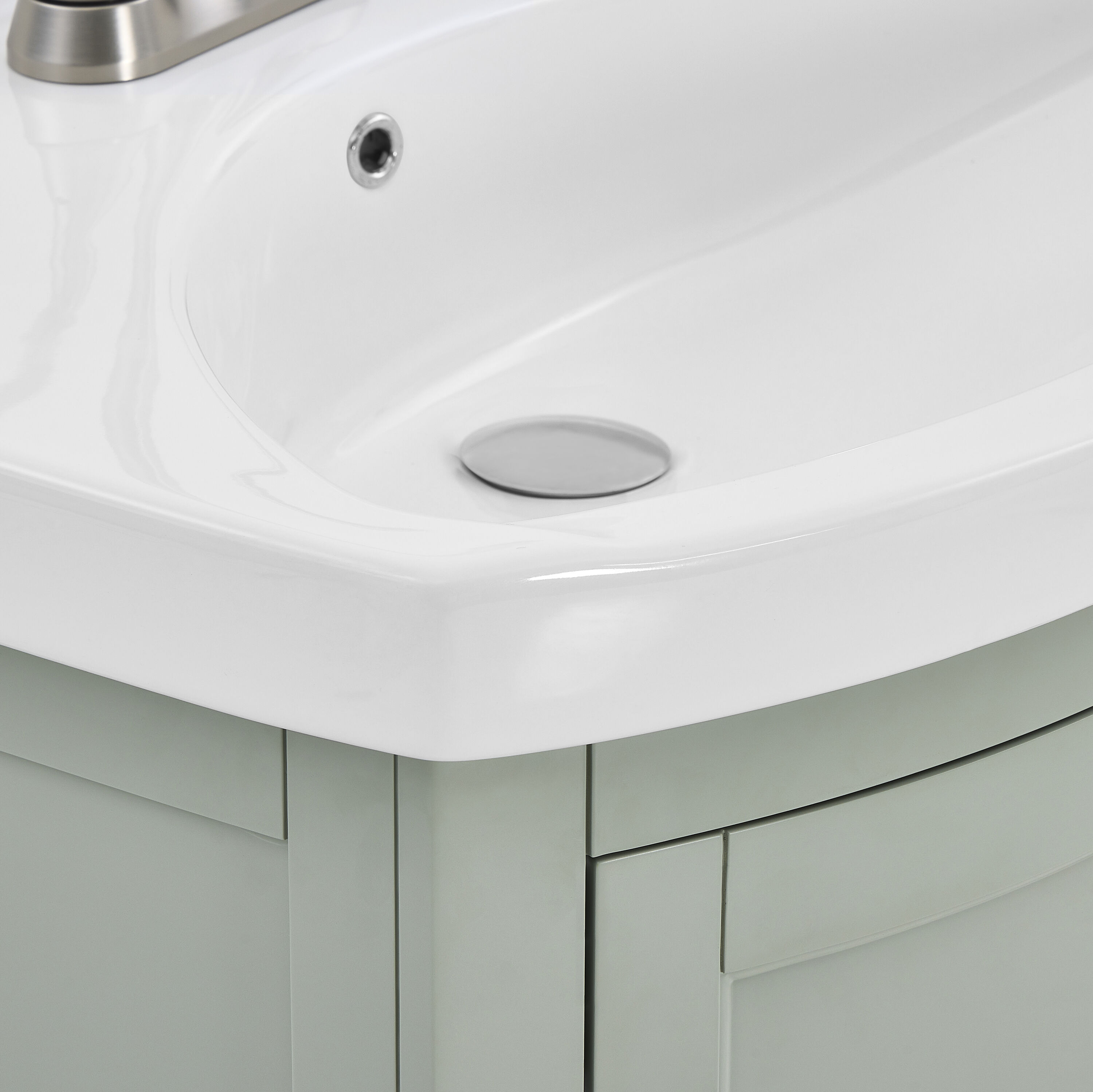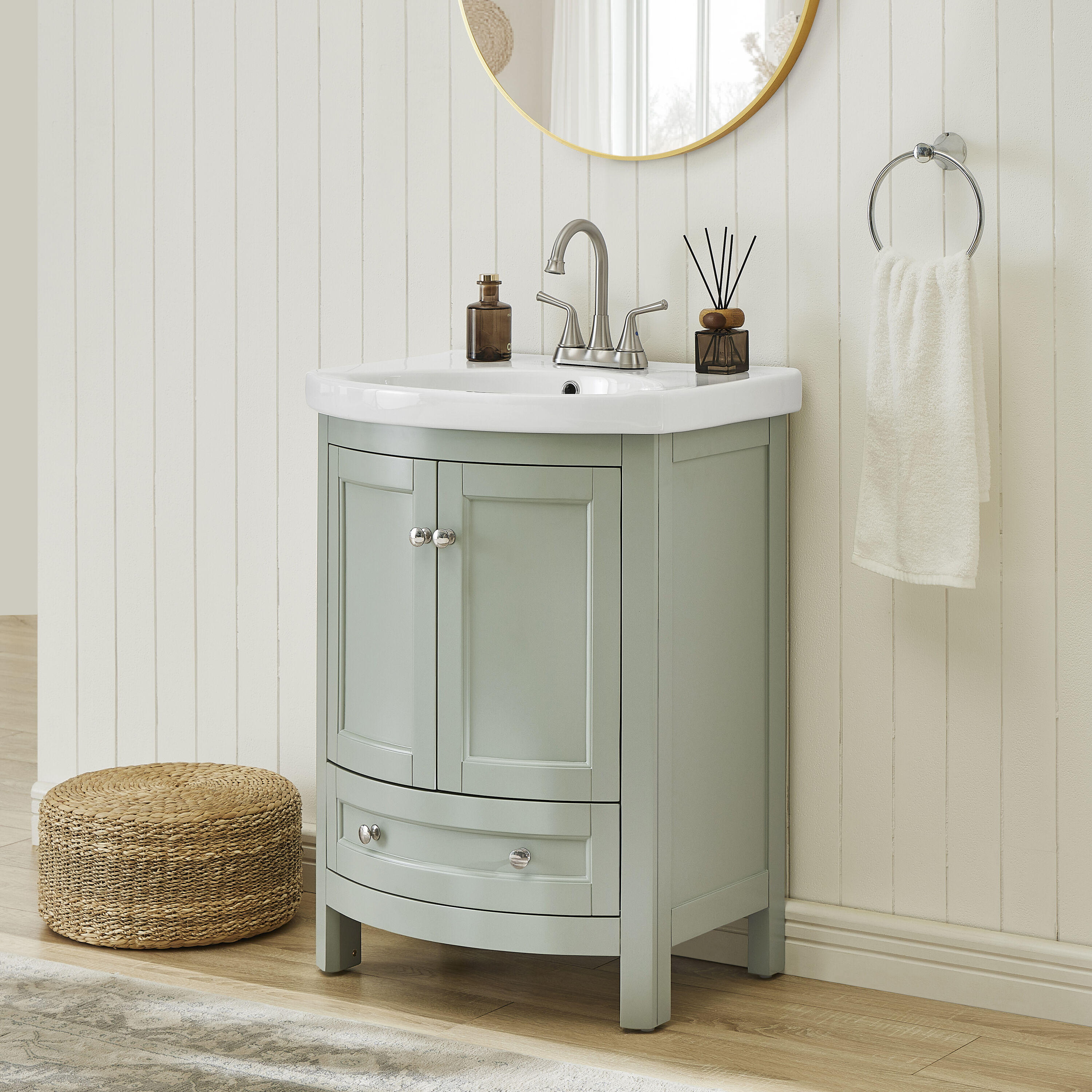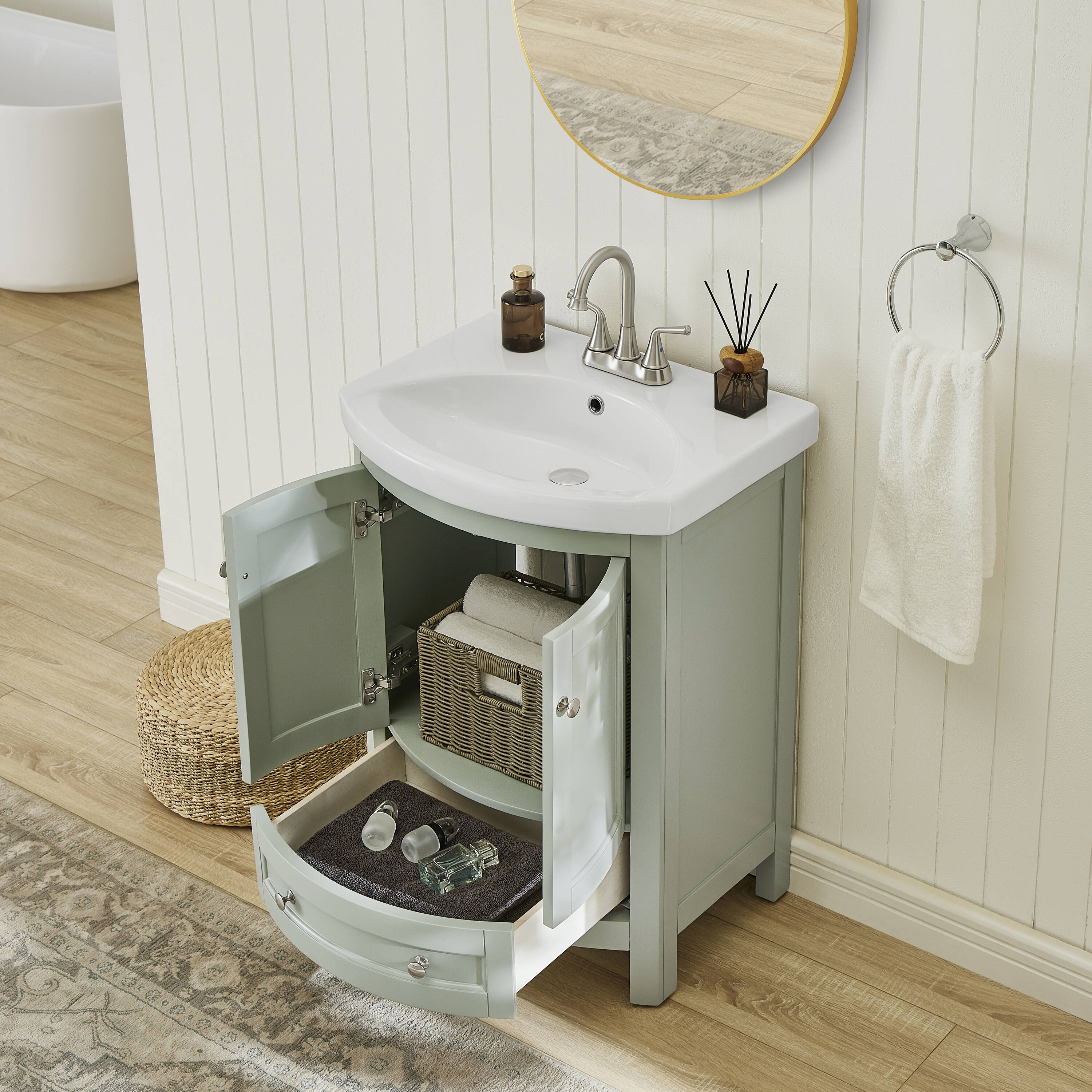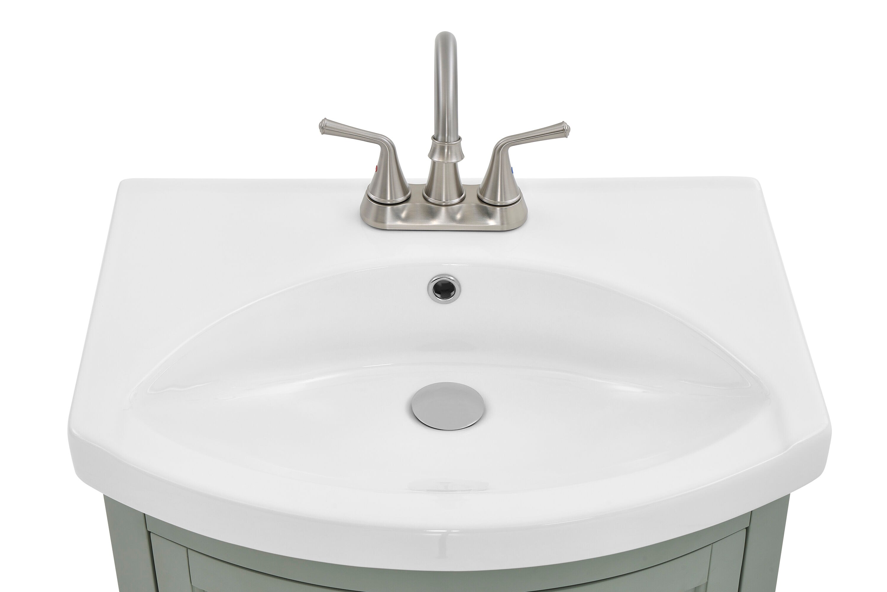 Beautiful and functional is the all wood constructed Bellina bathroom vanity by Runfine with elegant gray finish and comes complete and fully assembled. The vanity includes 2 recessed slow-closing doors and 1 slow-closing drawer along with Chrome hardware. The white vitreous top and basin have a gloss finish and is easy to maintain and clean. The bow front curved transitional look will add beauty and sophistication to any bathroom and is an excellent small space solution for additional storage.