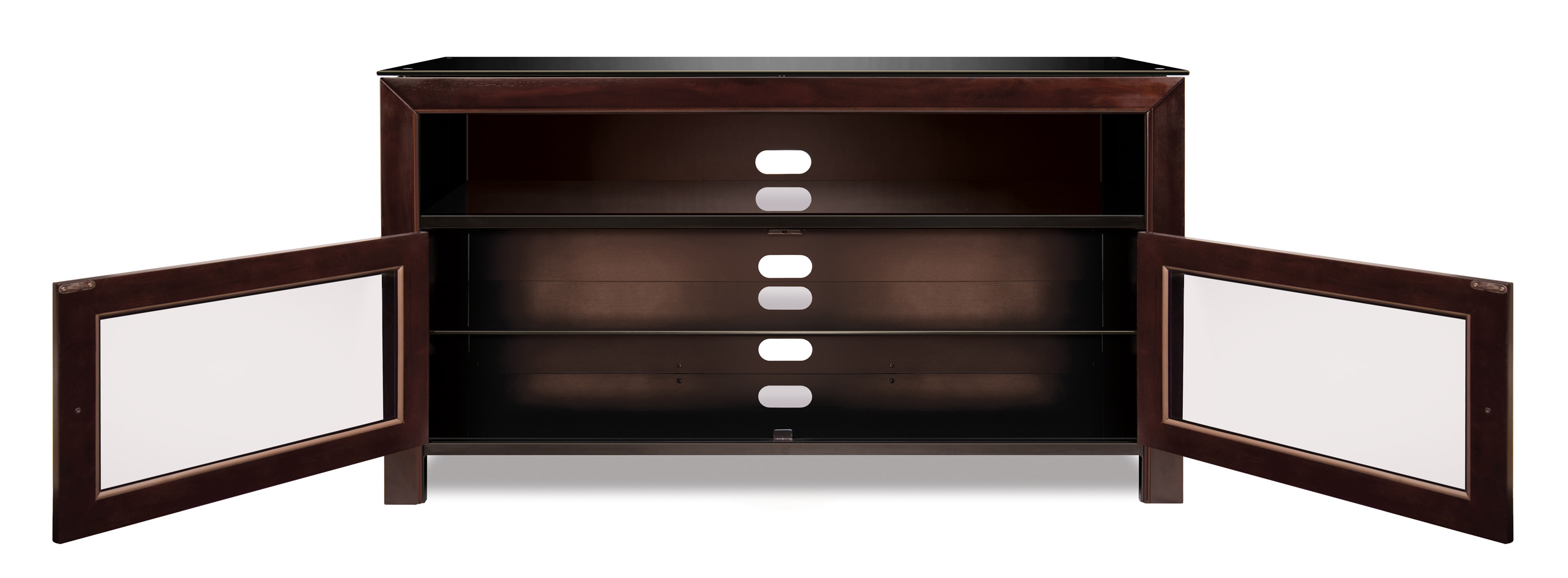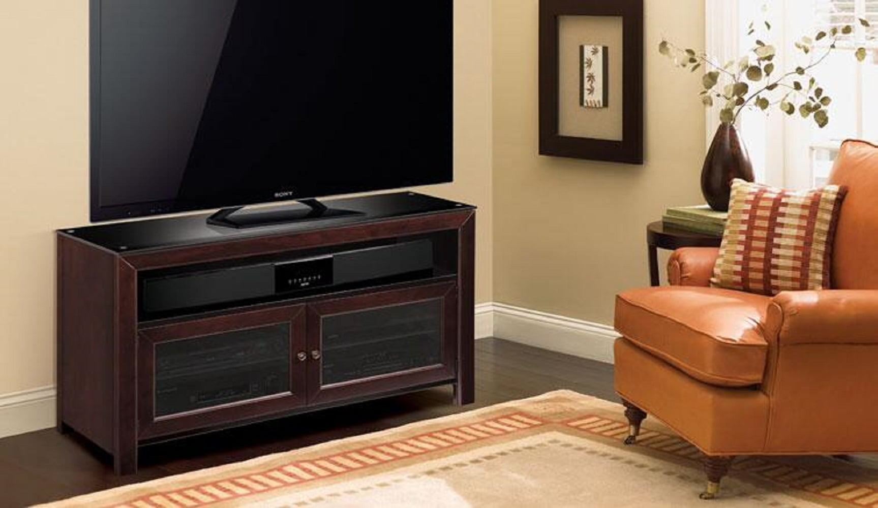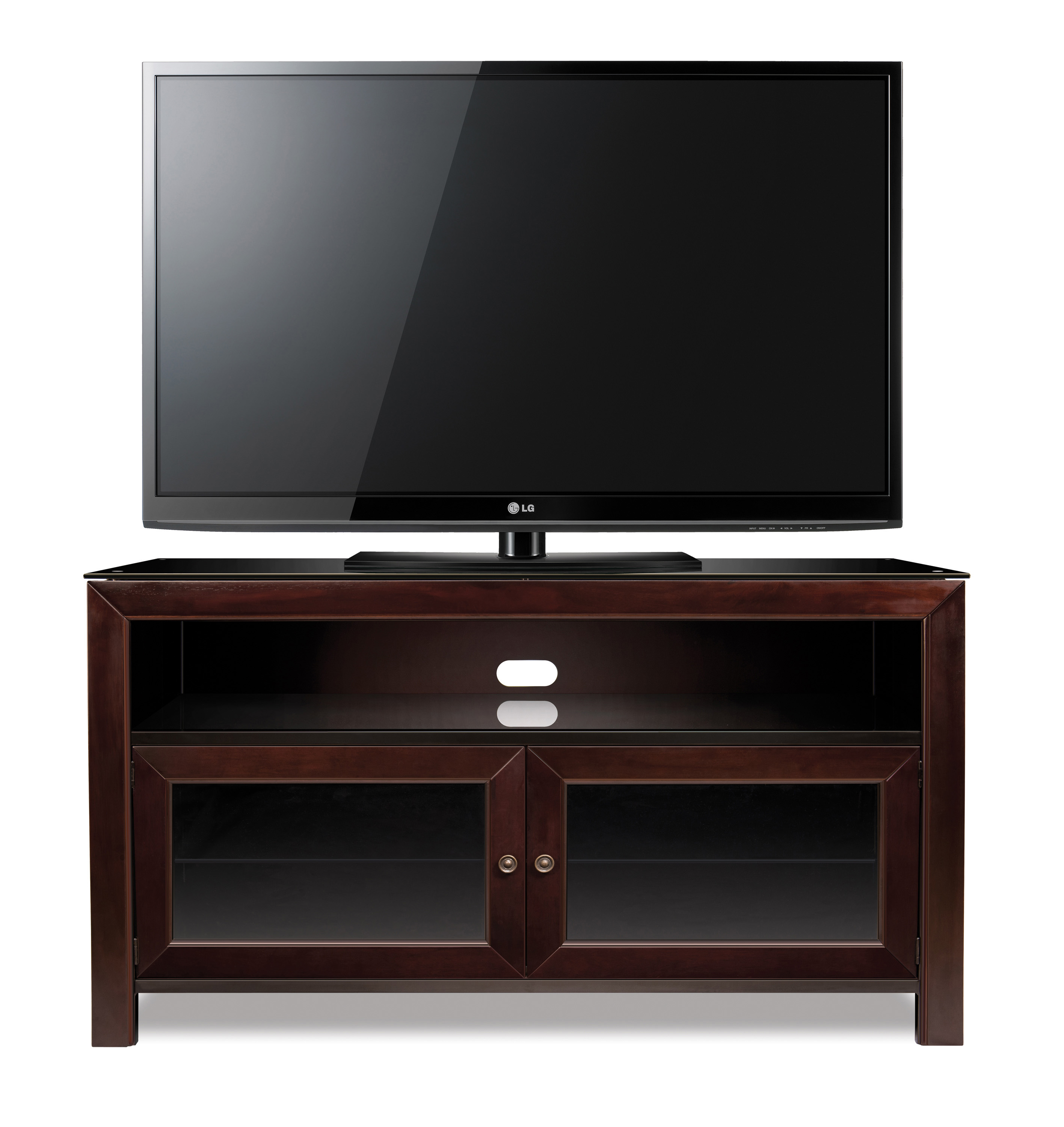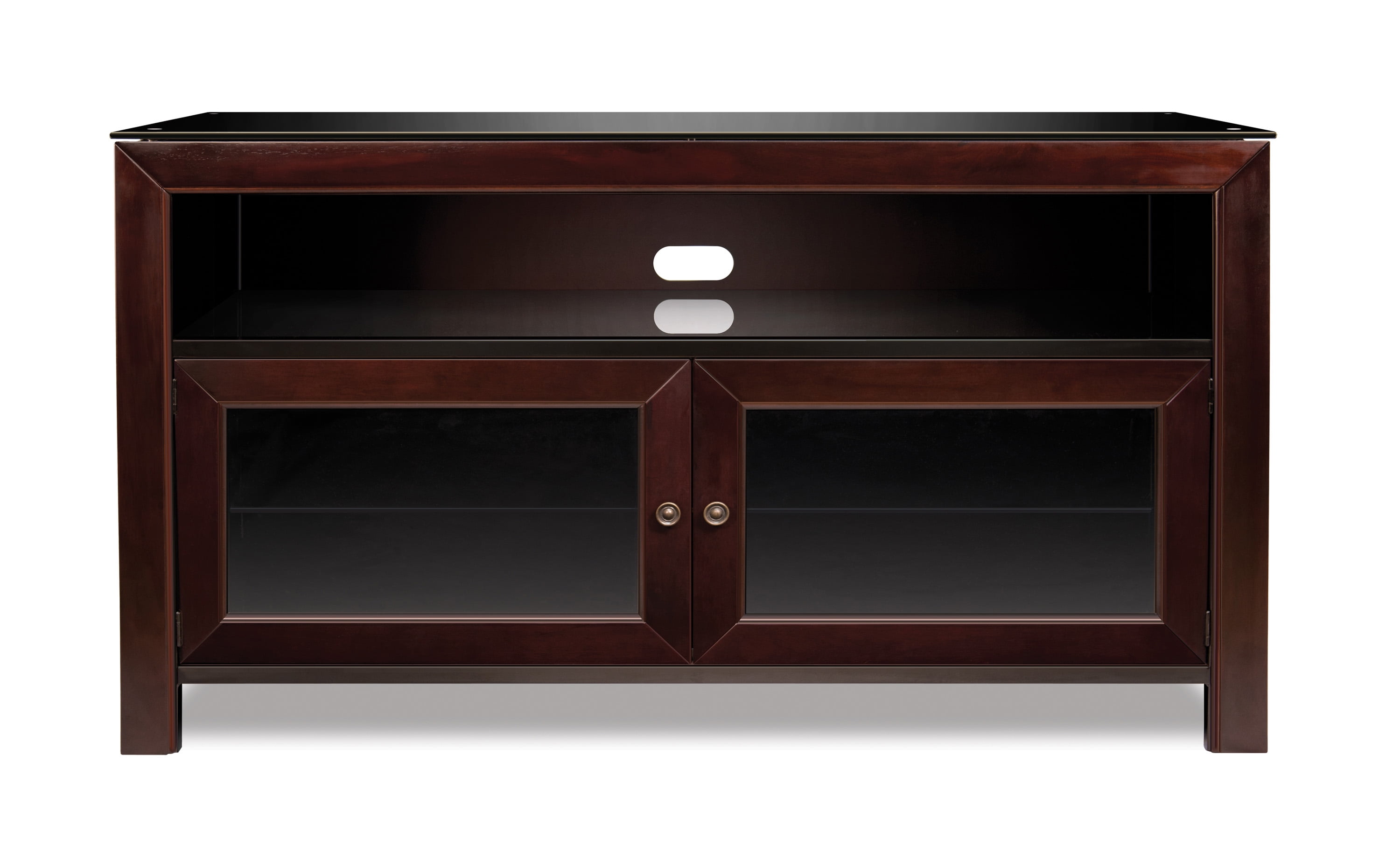 50″ TV Stand for TVs up to 55″, Deep Mahogany Accommodates most flat screen TVs up to 55″ or up to 100 lbs. Elegant black glass top Can hold up to 6 AV components Assembles in minutes – quick and easy to assemble. Includes an owner’s manual and easy-to-follow instructions. An integrated CMS® Cable Management System to hide and manage unsightly wires and cables Internal slots provide proper air circulation for conventional cooling of your components Tinted tempered safety glass doors allow for remote control use