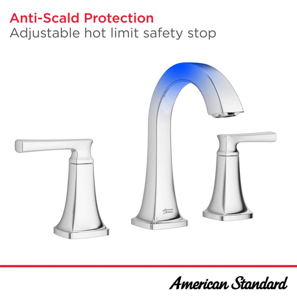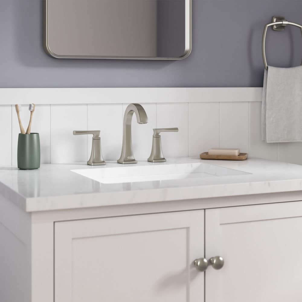 The Belmeade Two-Handle Widespread Bathroom Faucet from American Standard is a stately design with defined edges, a gently curved spout and sturdy lever handles. Impressive in any bathroom setting, the Belmeade faucet is easy to install for a quick update. This two-handle, 3-hole faucet promises drip-free performance, lasting beauty, and reliability in the busiest bathroom.