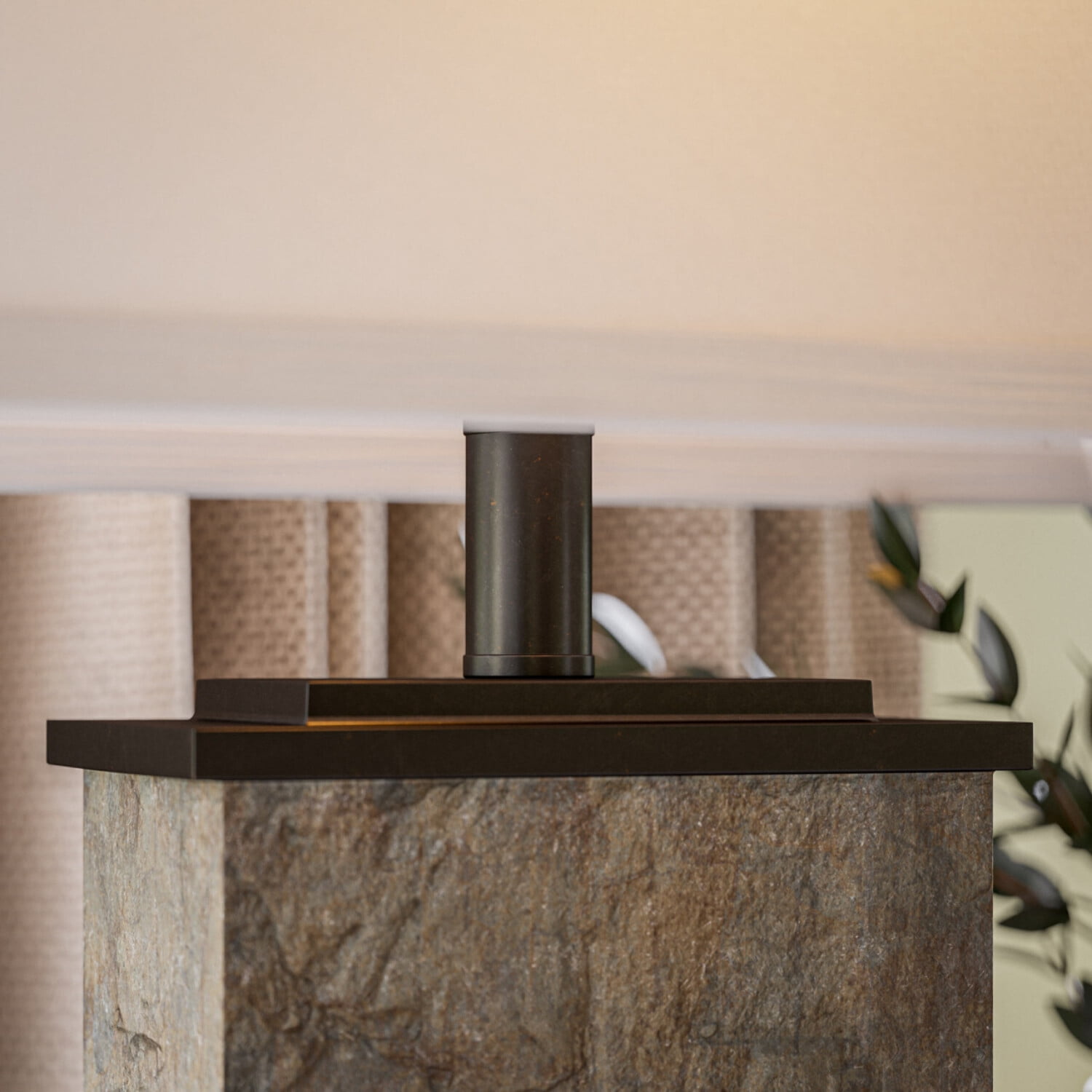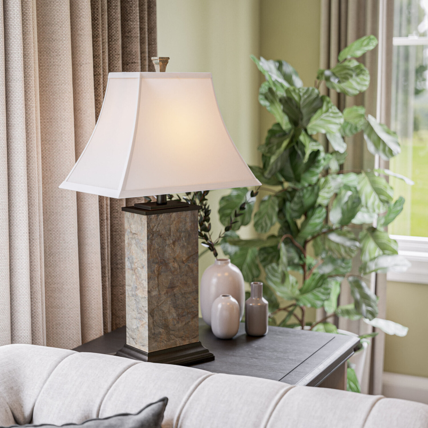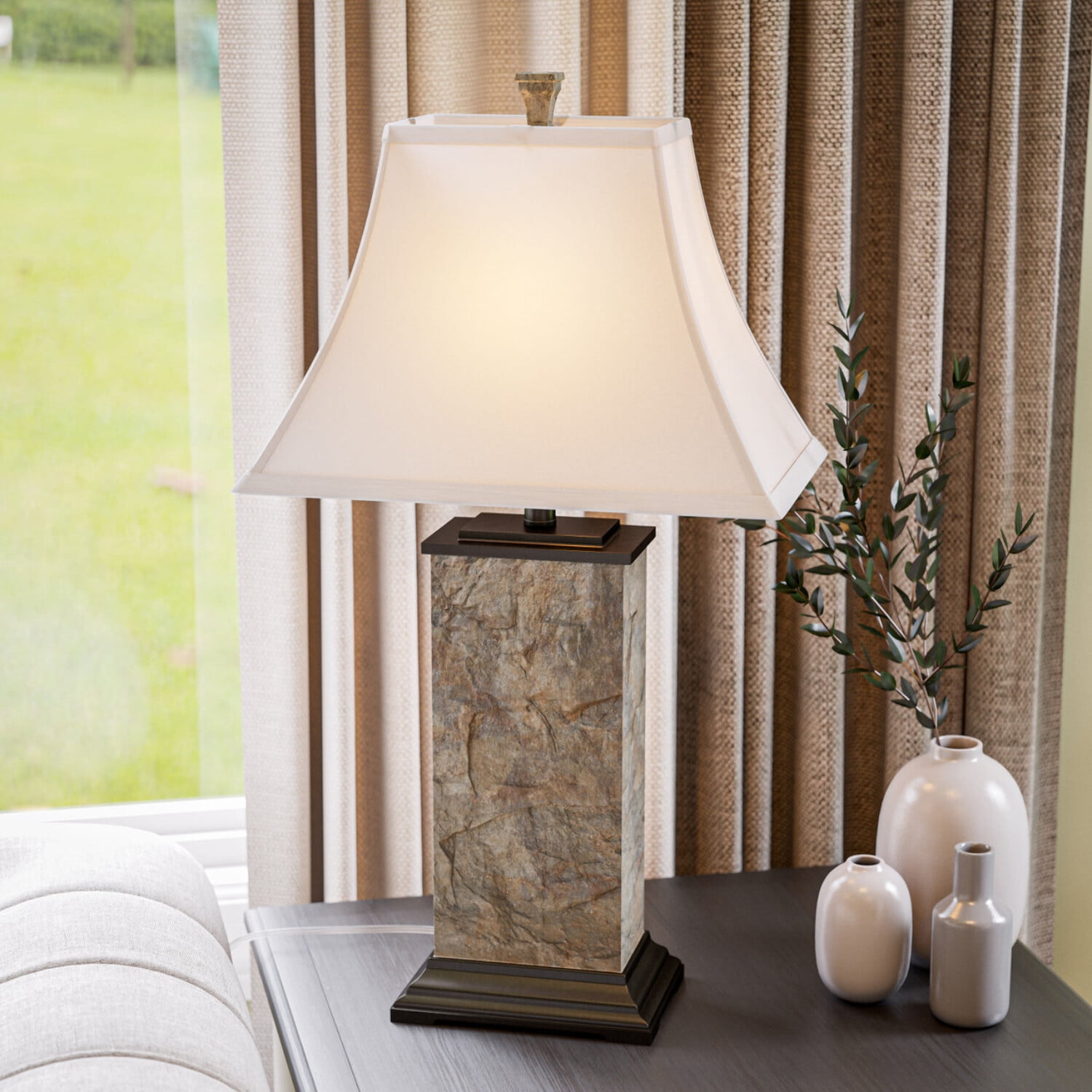 Natural modern table lamp with green slate body and sturdy bronzed base Genuine natural rusty green slate makes every piece unique with its own swirling green and earth toned patterns, while ensuring color is consistent across all slate pieces Cream faux suede tapered shade creates brightly diffused lighting Ideal for use as a reading light or task light Place on living room end tables, master bedroom nightstands, or entryway tables Rotary 3-way