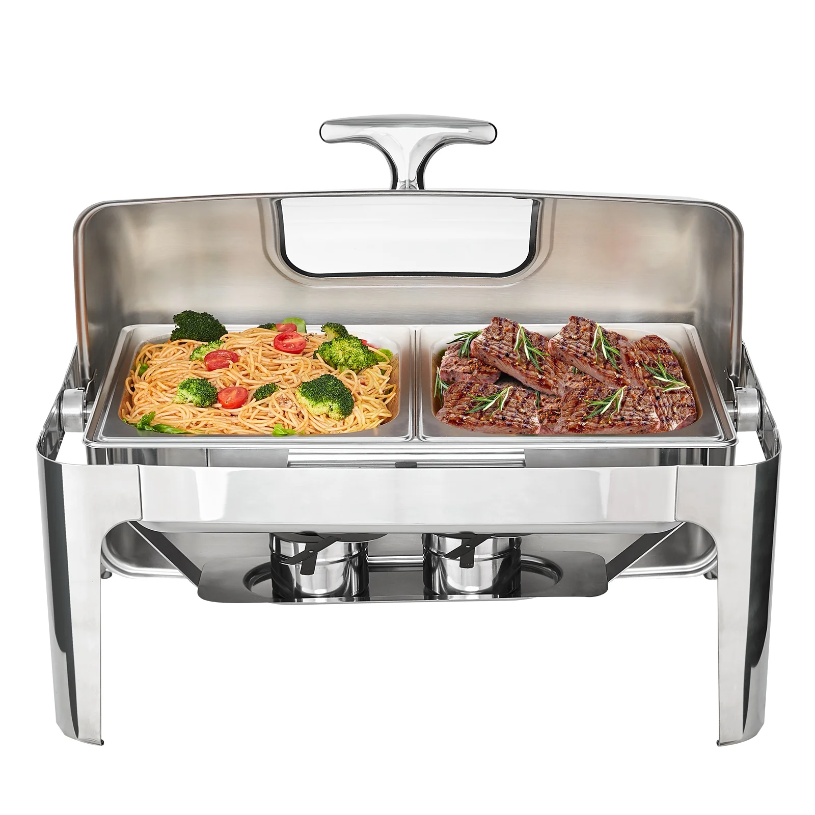 Warm and Fresh: BENTISM’s roll-top chafing dish buffet set lets you maintain the food’s temperature. Supported by fuel holders, our dish can heat food. Besides, you can also add enough ice to the water tray to cool the food. Ample 9 Qt Capacity: You will have enough space to serve all your delicious meals! This chafing dish has two half-size food pans, easily accommodating up to 9 Qt of piping hot appetizers, entrées, or side dishes, serving at least 9 people. Food-Grade Stainless Stee Chafers for Cateringl: Made of upgraded SS201 with a mirror finish, our chafing set is built to withstand everyday use, while providing a timeless appearance that blends in with your classic decor. It also features easy maintenance and cleaning. Visual Glass Lid: The chafing dish buffet set has a clear window, so guests can see food without opening the lid. They won’t be able to control themselves and will be waiting to taste your cooking. The elegant design helps present the best state of food to your friends attending the party. It’s time to eat! Applicable Occasions: Our catering food warmers are ideal for restaurants, parties, buffets, catering, schools, and corporate events that will professionally showcase the cuisine.