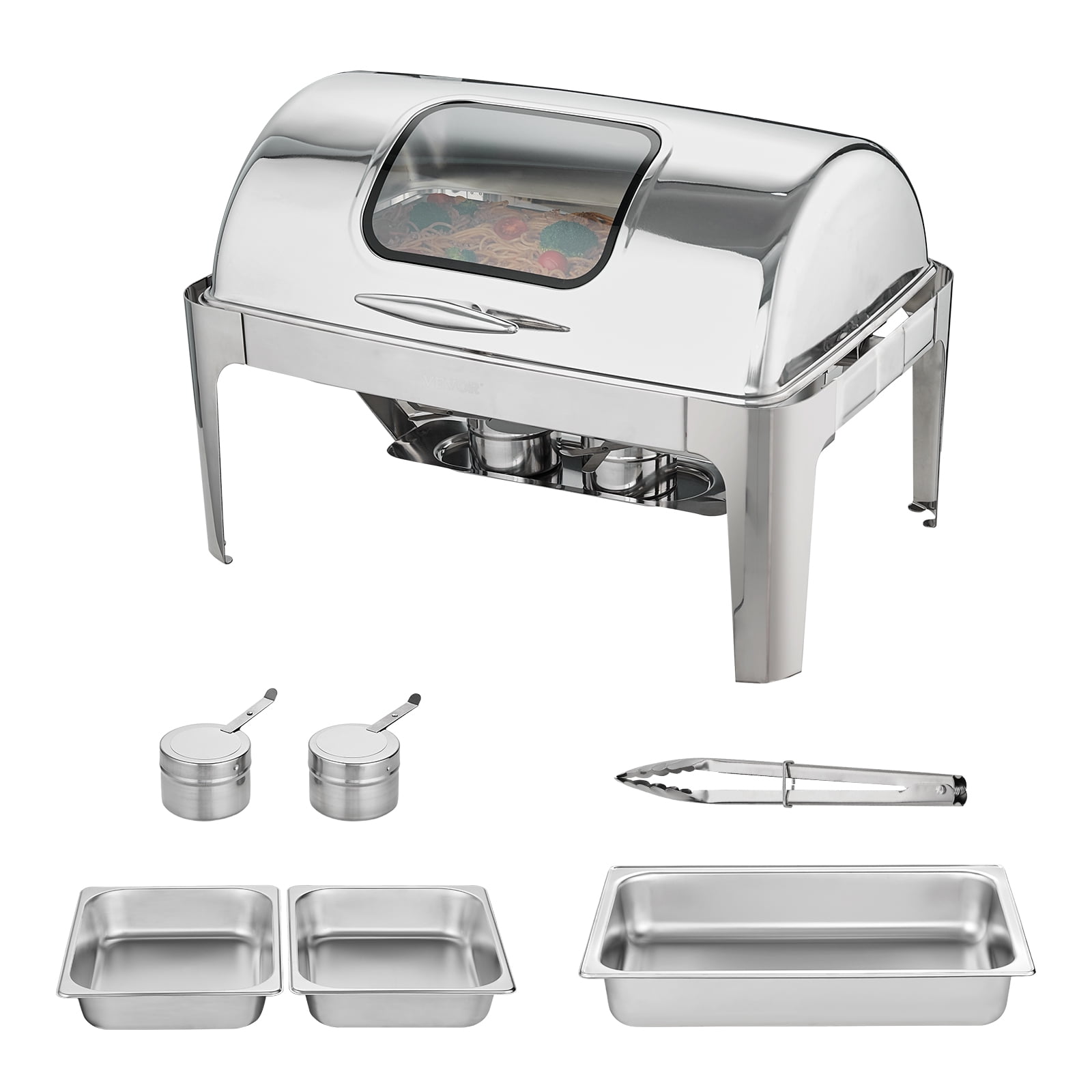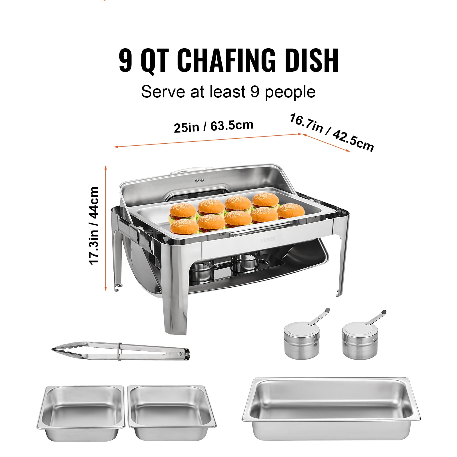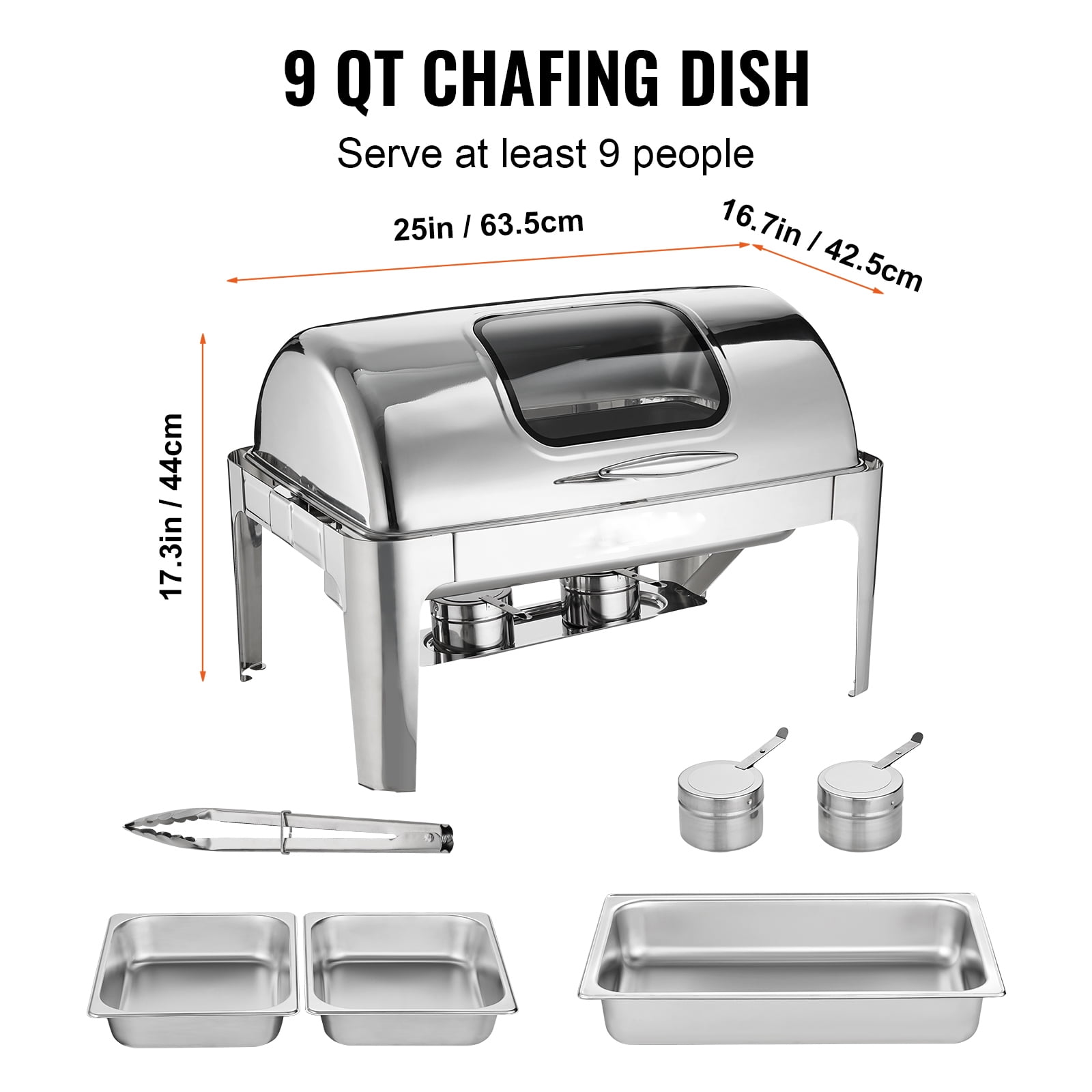 Product Description 9 Qt Commercial Chafing Dish Set Get ready to keep all your delicious foods fresh and ready to serve. 9 Qt catering food warmer set is not only suitable for commercial use, but also for family use. The warming trays for buffet parties can hold many kinds of dishes. The buffet servers and warmers are great for a buffet, hotel breakfast area, brunch, catering event, family gathering, banquet, wedding, self-service, etc. With enough room to serve all your guests, you will be the talk of the room! Lid Handle For Easily picking up the lid without scalding. Keep Food Warm and Ready Fuel holders with pans can heat water under pans, maintaining a temperature that ensures guests can taste delicious warm food. Given Thoughtful Tools A meal clip and a soup ladle are given to you for better enjoying your dinner time. Large Space to Serve Included 2 x 4.5 Qt half food pans, which provide you with more space to accommodate food at parties and self-help, serving at least 9 people. Glass Window of Protective Cover Guests can see what is inside the chafing dish through the clear glass window without opening the lids of the buffet warmers. Silent to Open We have upgraded the bearing of the buffet food warmers for parties to make sure the lid works smoothly without any noise. Specifications Model: DT-C1105 Quantity: 1 Material: Food-Grade 201 Stainless Steel Half-Size Pan Quantity: 2 Half-Size Pan Capacity: 4.5 Qt Each Water Pan Volume: Max. 4 L; Min. 2 L Can Serve: at Least 9 People Heating Method: Fuel Food Pan Size: 21×12.8×2.6 in / 53×32.5×6.5 cm Product Size: 25×16.7×17.3 in / 63.5×42.5×44 cm Product Weight: 16.8 lbs / 7.64 kg Package Content 1 x Rectangle Chafing Dish 2 x Fuel Holders 2 x Half-Size Pans 1 x Water Pan 1 x Frame (Lid & Fuel Tray Included) 1 x Meal Clip 1 x User Manual
