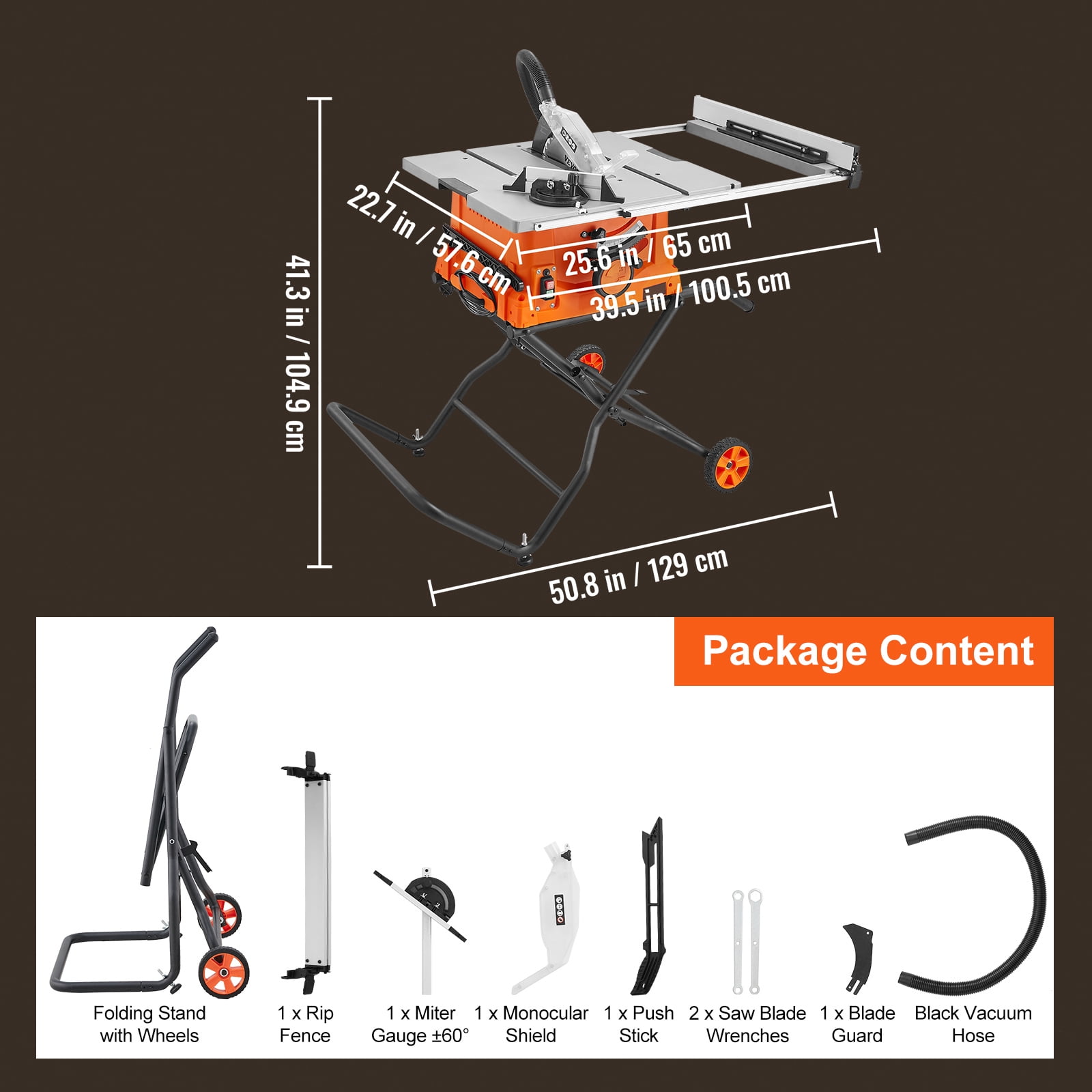 Cut into Good Times: Are you tired of big pieces of wood getting the best of you? Well, get ready for clean seamless cuts every time. Equipped with a powerful 15 Amp motor, the woodworking table saw cuts through various sizes of wood with ease at high speed of 5000 RPM. Its 40-tooth blade dramatically improves cutting efficiency. Cut at Various Angles: With the help of an adjustable, full-length, parallel fence with a measuring guide rail, our table saw for jobsite ensures reliable and smooth rip-cutting every time. You are going to feel so satisfied with the results. You can set the blade to any desired angle between -60° to 60° for bevel-cutting. Stay in control and cut at the most common angles no matter what. Your Security Comes First: Security is always our top priority. This jobsite table saw is designed with a security shield to prevent sawdust from lingering in the air. A blade guard prevents the blade from popping out after breaking, too. If the machine is overheating, the copper wire automatically starts overload protection to save the machine from damage. With security mechanisms like this put in place, you can’t go wrong! Designed Just for You: Don’t you just hate dust and bulky tables? The 10 inch table saw is easy to carry for outdoor operations thanks to its compact and foldable design. It fits perfectly in your truck for convenient storage. The dust port does well in dust prevention, keeping your workshop clean. Perfect Choice for Wood Cutting: The portable table saw is helpful for wood cutting and various DIY woodworking projects. You can process logs, cut wood boards, or make furniture. Whether in the workshop or outdoors, it will become your #1 cutter helper. Let’s get to work.