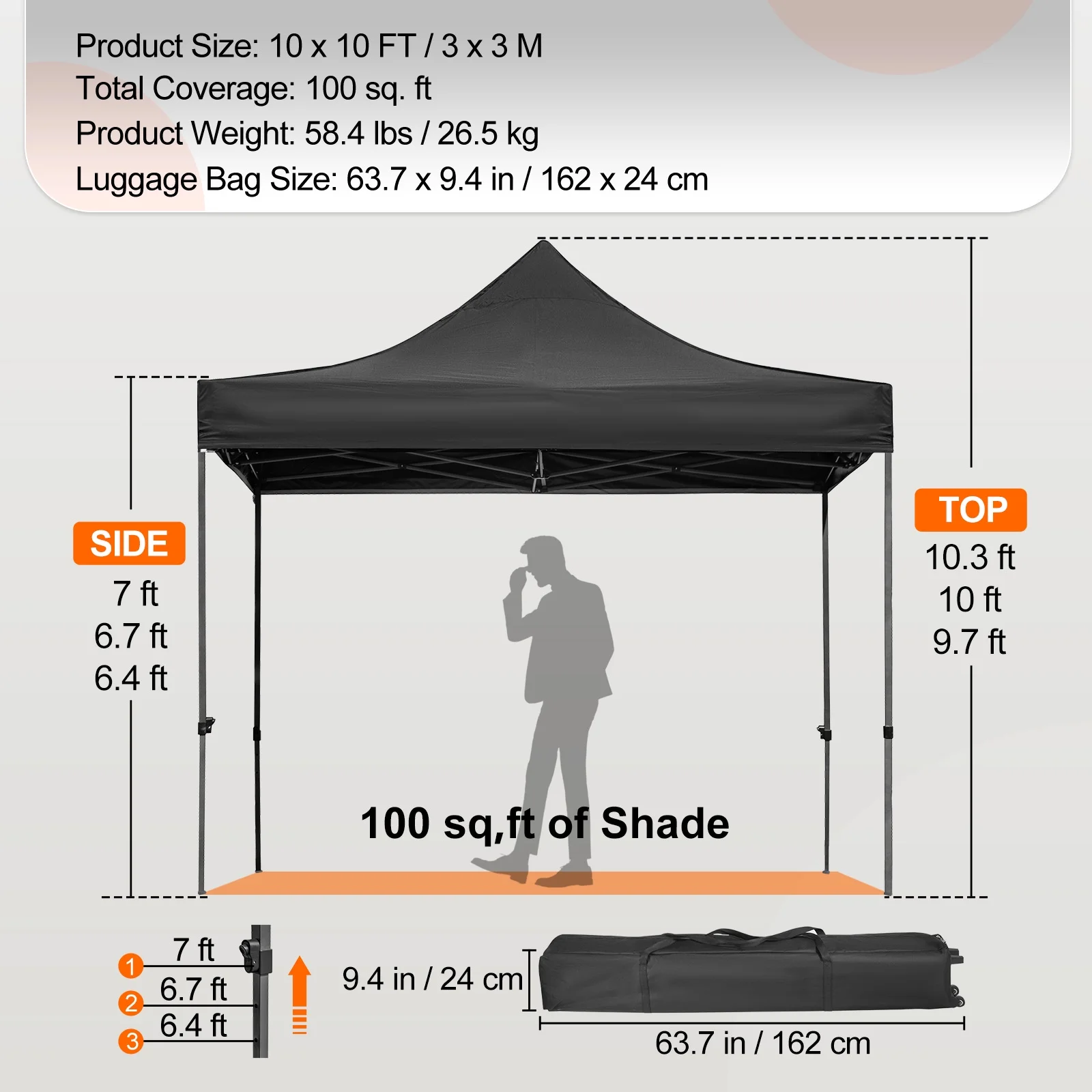 Product Description 10 x 10 FT Pop up Gazebo Tent Adjustable Height & Pop-up Design & Easy to Store The Quality You Can See The tent top is made of 240g PVC-coated polyester, and the removable sidewalls are made of thick PVC. Both high-quality materials will make the tent look good as new for years to come and ensure long-time use outdoors. Multiple Protections The instant gazebo shelter can protect you from rain, snow, and sun during all seasons. The transparent sidewalls allow you to see outside clearly while keeping out the wind and rain. Convenient Height Adjustment Using the Upgraded button, you can easily adjust the height from 9.7ft to 10.3ft by gently pulling the button outwards. Three different heights allow you to choose the right height for your needs. All-purpose 3 in 1 Gazebo Tent The side walls are detachable, so you can build different tents according to your needs. For example, detach all the side walls and the door, or install the sidewalls. Just open the door or fully close it. Take it Anywhere To facilitate usage and storage, we provide a free wheeled carry bag, so you can store and take it out conveniently. Place the tent in the bag, put it in your car trunk, and travel anywhere you want. Broad Applications The pop-up gazebo tent with sidewalls provides approximately 100 sq. ft of space for 6-7 people. It is essential for outdoor parties, weddings, or other commercial activities. Specifications Tent Size: 10 X 10 FT/ 3 x 3 M Top Material: 240g PVC-Coated Polyester Sidewalls Material: PVC Adjust Peak Height:9.7ft/ 10.0ft/ 10.3ft Adjust Side Height:6.4ft/ 6.7ft/ 7ft Bag Material: 600D Oxford Fabric Item Color: Black Bag Size: 63.7 x 9.4 in/ 162 x 24 cm Item Weight: 58.4 lbs/ 26.5 kg Package Content 1 x Pop up Frame 1 x Canopy Top Cover 4 x Sidewall 1 x Storage Bag 8 x Stake 4 x Fixed Rope 1 x Manual