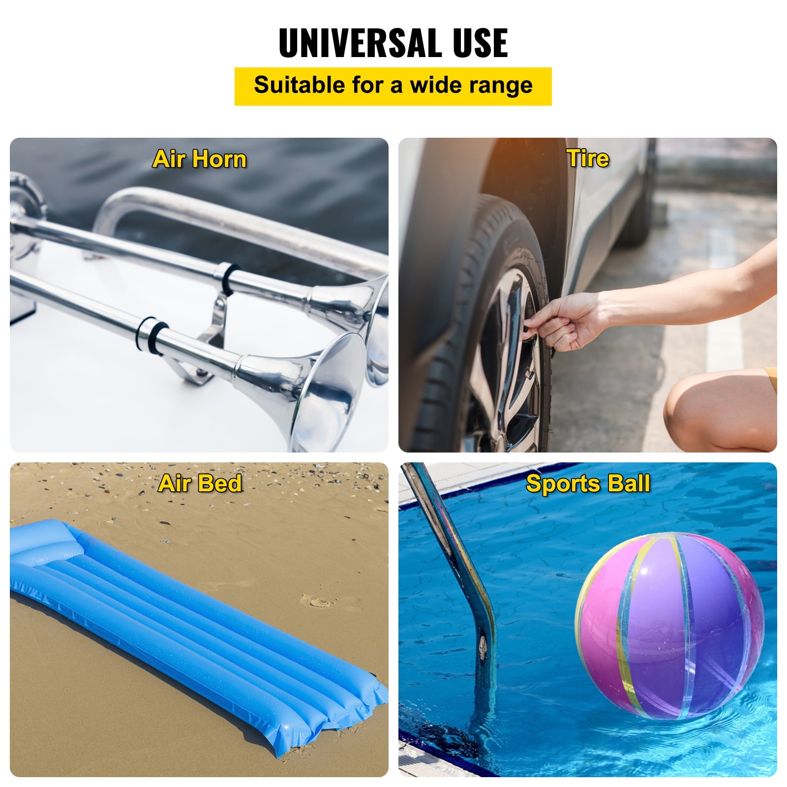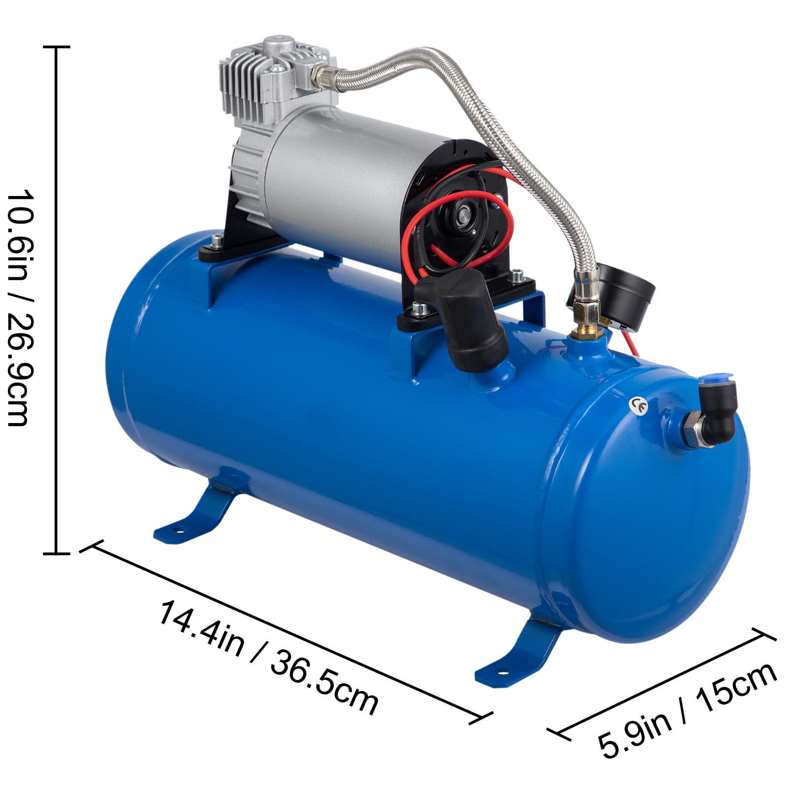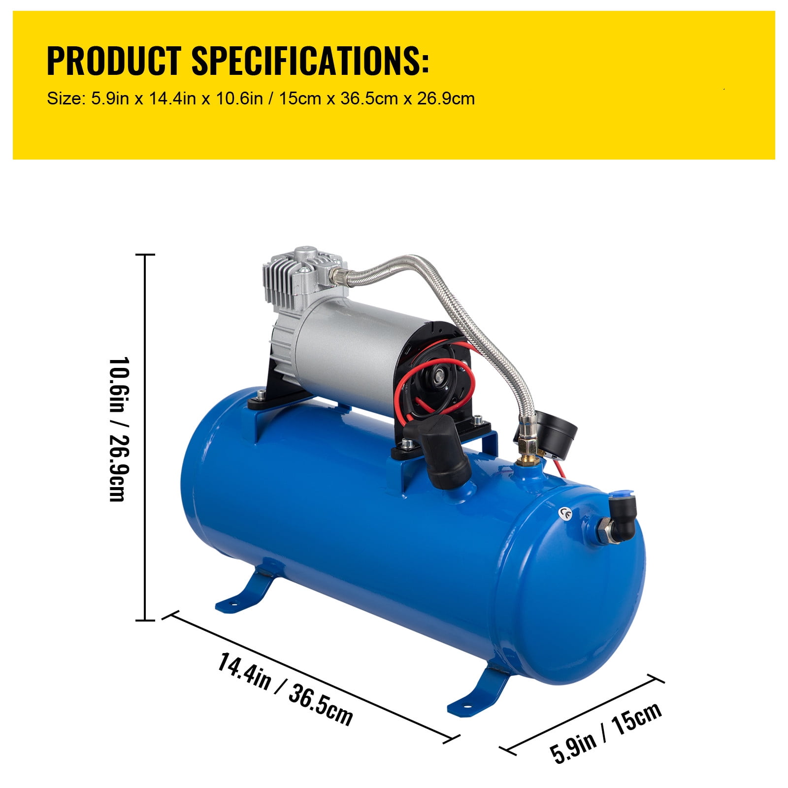 Product Description 12 Volt Onboard Air Compressor System This onboard air compressor system features the steel air tank and aluminum alloy compressor and can offer reliable performance, suitable for air horns on trucks, cars,and boats, inflation of tires, air beds, sports balls, etc. Sturdy & Durable The steel tank and aluminum alloy compressor are durable and sturdy for your long-lasting use. Specifications Max. Pressure: 150 PSI Power Input: 12 V DC Current: 25 A Power: 180 W Tank Capacity: 6 Liters (1.6 Gallons) Duty Cycle: 25% Flow Rate: 35 L/M Pressure Switch Settings: 90 PSI on, 150 PSI off Weight: 5.5 kg (12.1 lbs) Package Dimensions (L* W* H): Approx. 40* 15* 30 cm (16″* 6″* 12″) Package Content 1 x 12 Volt Air Compressor 1 x Air Tube