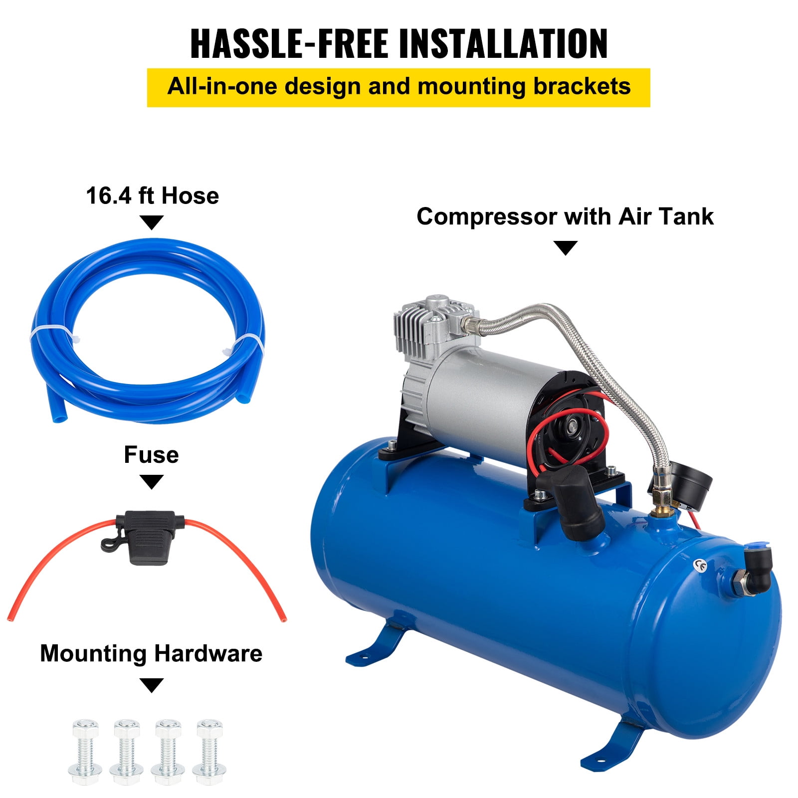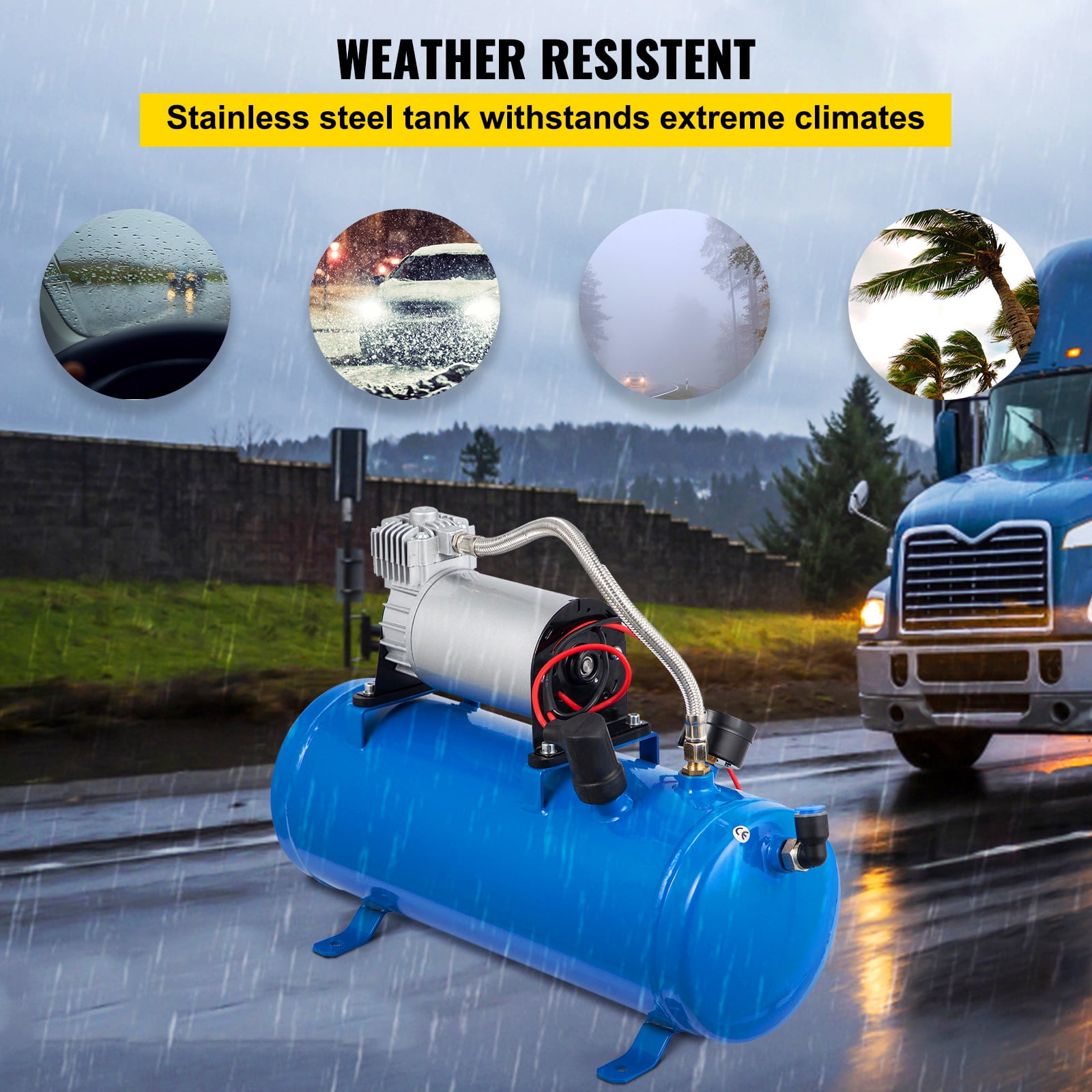 【PREMIUM QUALITY】-This onboard air compressor system for tires features the high-quality stainless steel tank plus aluminum alloy air compressor, sturdy and durable. Tank Capacity: 6 Liters. 【RELIABLE PERFORMANCE】-12 volt air compressor heavy duty can offer reliable performance. Max. Pressure: 150 Psi, Pressure Switch Settings: 90 PSI on, 150 PSI off. 【DRAIN COCK DESIGN】-There is a drain valve on the bottom of the tank, designed for you to drain sewerage easily, which can help to lengthen its service life. 【LONGER & FLEXIBLE HOSE】-Our extension air tube is one meter longer than similar products, which means more flexible and convenient for you to operate. 【QUICK & EASY INSTALLATION】-This onboard air compressor for jeep comes with an all-in-one design, and mounting bracket included for your quick and easy installation, designed for onboard solution for air horns, inflation of tires, air bed, etc.