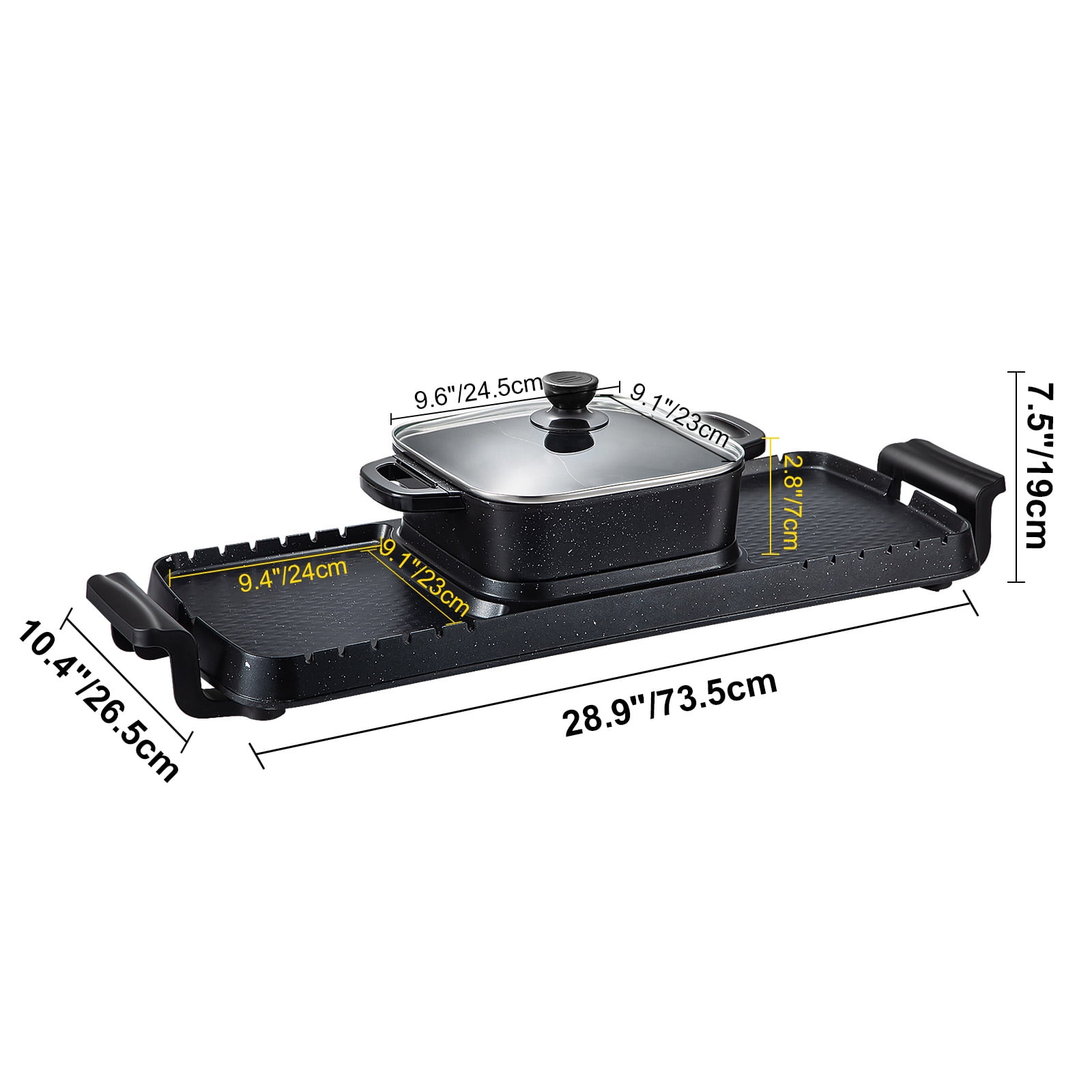 Product Description 2 in 1 Electric Hot Pot Grill Dual Temp Control & Nonstick Coating & Detachable to Clean 2 in 1 Design Our multifunctional hot pot grill adopts 2 in 1 design. It contains a 2.5Qt / 2.8L hot pot with 2 tastes and 2 wide grill areas. With this feature, it allows you and your friends to enjoy barbecue and hotpot simultaneously and brings diversity to your table. Dual Temperature Control Two 356-464℉ temperature control knobs, with 5 speeds, can adjust the heating temperature of the grill and hot pot respectively. It is ideal for you to enjoy grill or hot pot mode as you wish. High-Efficient Heating This electric grill hot pot is equipped with three high-efficient heating tubes, including an 800W tube for the hot pot and two 800W tubes for the grill. These fast and even heating components allow you to enjoy food in a short time. Durable Construction The thickened cast aluminum body is firm and durable for long-term usage. The nonstick coating surface enhances the heat resistance of this machine and brings you an easy-cleaning & smokeless experience. The tempered glass lid keeps the steams inside the hot pot and avoids accidents. The bakelite handles are scald-proof for your secure use. Humanized Design The oil leakage ports on two sides can avoid excessive oil. The detachable hot pot is effortless for you to clean and store. The grooves on the grill plate are specially designed for holding skewers. Wide Application This 2 in 1 grill hot pot is suitable for 1-8 people on all foodie occasions, such as family gatherings, friend parties, and BBQ festivals. You can use it for cooking steaks, vegetables, shellfish, pasta, etc. Specifications Model: VV-HP-F-2200 Body Material: Cast Aluminum Lid Material: Tempered Glass Finish: Nonstick Coating Power: 800W (Hot Pot) + 1600W (BBQ Grill) Adjustable Temp Range: 356-464℉ / 180-240℃ Hot Pot Capacity: 2.5Qt / 2.8L Hot Pot Size: 9.6 x 9.1 x 2.8 inch / 24.5 x 23 x 7 cm Grill Size: 9.1 x 9.4 inch / 23 x 24 cm Product Dimensions: 28.9 x 10.4 x 7.5 inch / 73.5 x 26.5 x 19 cm Product Weight: 7.5 lbs / 3.4 kg Package Content 1 x BBQ Grill Hot Pot 2 x Spoons 1 x Food Clip 1 x Spatula 1 x A Pair of Gloves 1 x A Set of Cutlery 1 x Brush 1 x Cleaning Cloth
