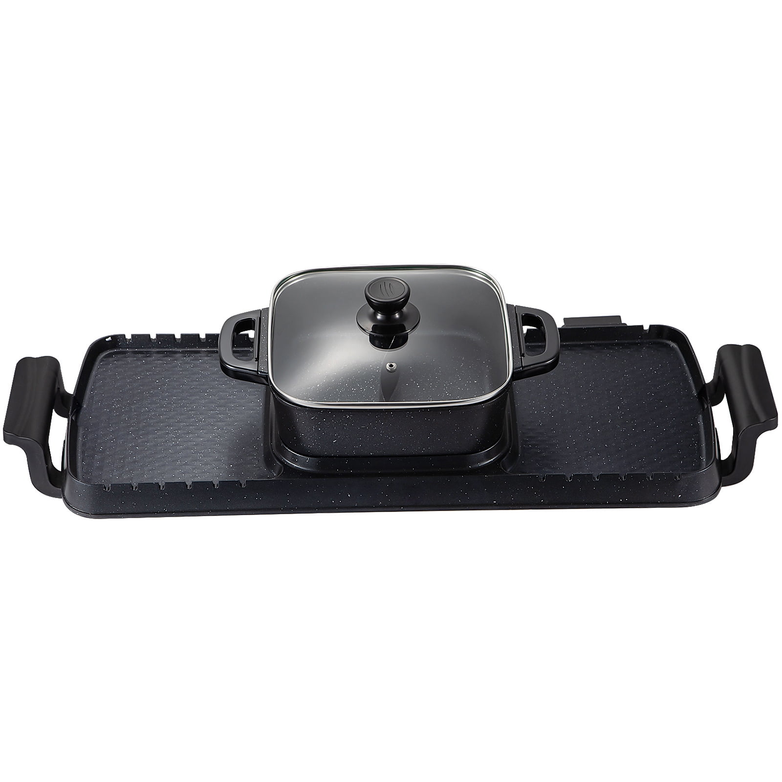 【2 in 1 Hot Pot Grill】: Our black electric hot pot grill combines a hot pot and 2 grill areas for multipurpose use, allowing you to enjoy hot pot and barbecue simultaneously. The 2.5Qt / 2.8L capacity hot pot contains a divider for carrying 2 tastes of food, while the grill plates adopt the groove design for skewers. Dual-purpose offers double fun. 【Separate Dual Thermostat】: Our hotpot and grill are equipped with 2 independent temp control knobs. You can precisely adjust the heating temperature from 356℉ to 464℉ with 5 speeds. With an 800W heating tube for the hot pot and 2 tubes with 1600W total power for the barbecue grill, our machine offers you a high-efficient and stable heating experience. In addition, it also has overheat protection, which will auto shut off when the temperature is up to 464℉. 【Excellent Cooking Material】: Made of cast aluminum with nonstick coating, the body of our hotpot grill combo is heatproof, easy to clean, and sturdy to use. The tempered glass lid is well-designed to block the steam inside and avoid accidents. Besides, the bakelite handles keep your hands from scalding during operation. 【Innovative Design】: The oil leakage outlets on the grill plate can effectively discharge excess oil and reduce the amount of smoke produced. The detachable design is convenient for you to clean the hot pot. The base plate has excellent heat insulation, ensuring that the heat remains in the cooking areas. 【Versatile Use】: This BBQ grill hot pot is perfect for 1-8 people in family gatherings, friend parties, and dinners. It is widely applied in heating and grilling meats, steaks, vegetables, shellfish, etc.
