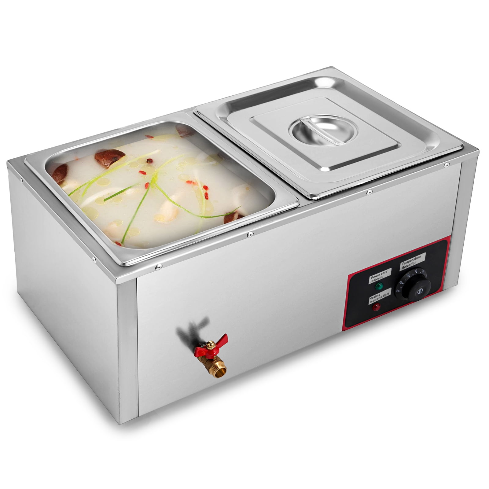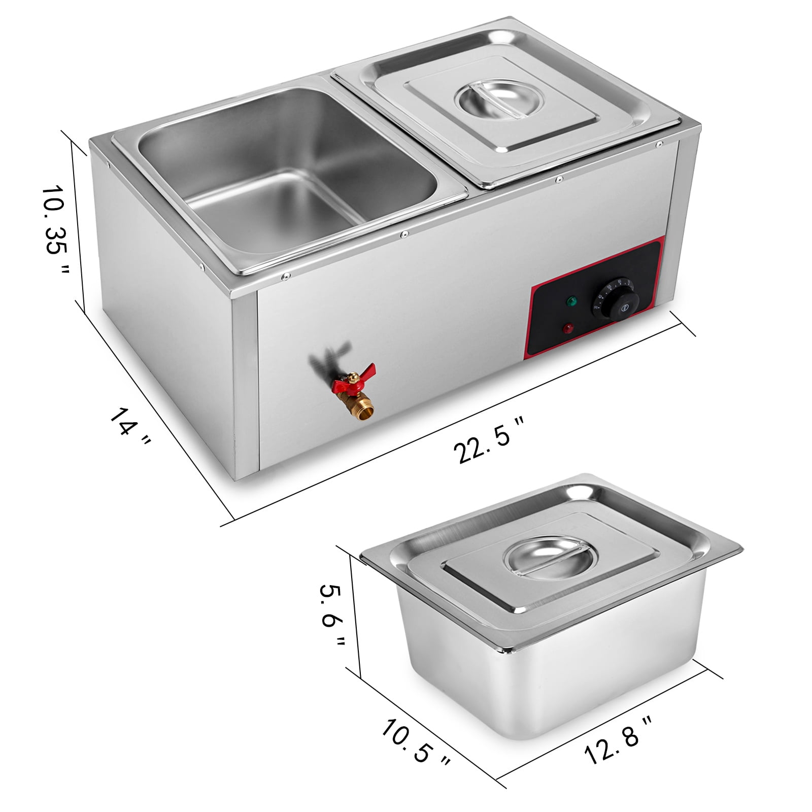 Electric Food Warmer Restaurant food warmer, including 2 pans and lids, is made of thickened food-grade stainless steel, durable, anti-squeezing and easy-cleaning. Constant temperature control (30-85℃) keeps dishes warm as you wish. The catering food warmers are widely used to keep dishes warm, heat up milk and steamed buns, and melt chocolate. Specifications Temperature Range: 86-185℉(30-85℃) Product Dimensions: 22.6″x15.0″x10.6″ (575x380x270 mm) Single Pan Dimensions: 12.8″x10.4″x5.9″ (325x265x150 mm) Pot Thicness:0.03inch ( 0.8mm ) Product Weight: 22 lbs Power: 1200W Package Content 1 x Electric Food Warmer