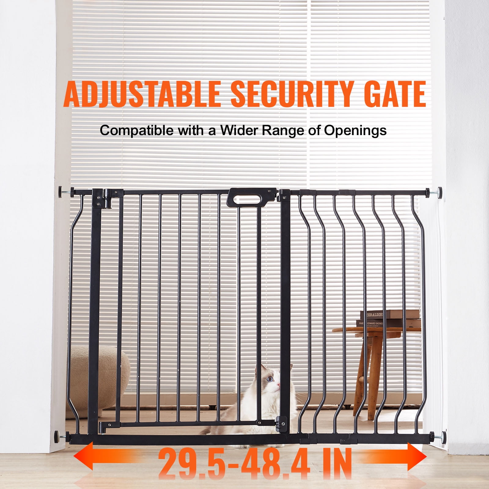 Adjust On the Fly: Home layouts differ, but our baby gate doesn’t mind! Swing it across doorways ranging from 29.5 to 48.4 inches (749 to 1229 mm). Whether it’s a cozy nook or a grand hallway, we’ve got your back and your baby’s space! Swing it Both Ways: Our 180 dual-swing dog gate has got moves. Facilitates one-handed operation when carrying a baby, closes automatically when opened less than 90, and stays open for walk-thru and housework when opened at 90. Parenting is hard, but using our gate isn’t: pull, lift, and voil! Plus, with our double-lock, your curious kiddo or pet isn’t getting through. Step Through, Not Over: Say goodbye to awkward sidesteps! Our stair gate’s generous opening width (>21 inches/533 mm) lets strollers roll and parents stroll. At a sturdy 30 inches/762 mm tall, it’s just the right height to keep adventurous tots and pouncing pets where you want them. Dual Installation Methods: Choose between pressure mounting for a no-fuss setup or hardware mounting for that extra secure fit. The child gate can be set up in just 10 minutes without damaging your walls for pressure mounting. And, if stairs are involved, just go the hardware route for top-notch security. Built Tough for Tumbles and Tail-Wags: Made with robust, rust-resistant iron, this puppy gate stands strong against both the toddler tests and the tail-wag trials. Our 2.1 inches/53 mm rail spacing is all about security, keeping tiny heads out and furry friends in so you can breathe easy and laugh more. Specifications Item Model Number: B3336 Width Range: 29.5 – 48.4 inches/749 – 1229 mm Angle: 180 Height: 30 inches/762 mm Latch Mechanism: 3-Step Opening, Bottom Automatic Locking Material: Iron (Powder-Coated) + Plastic Color: Black Net Weight: 10.8 lbs/4.9 kg Latch Handle: Dual-Lock Tongue Structure, ABS Bar Spacing: 2.1 inches/53 mm Door Opening Width: >21 inches/533 mm Tensile Strength: >45 lbs/20 kg Impact Resistance: 33 lbs/15 kg Package Content 1 x Baby Gate with Accessory Kit