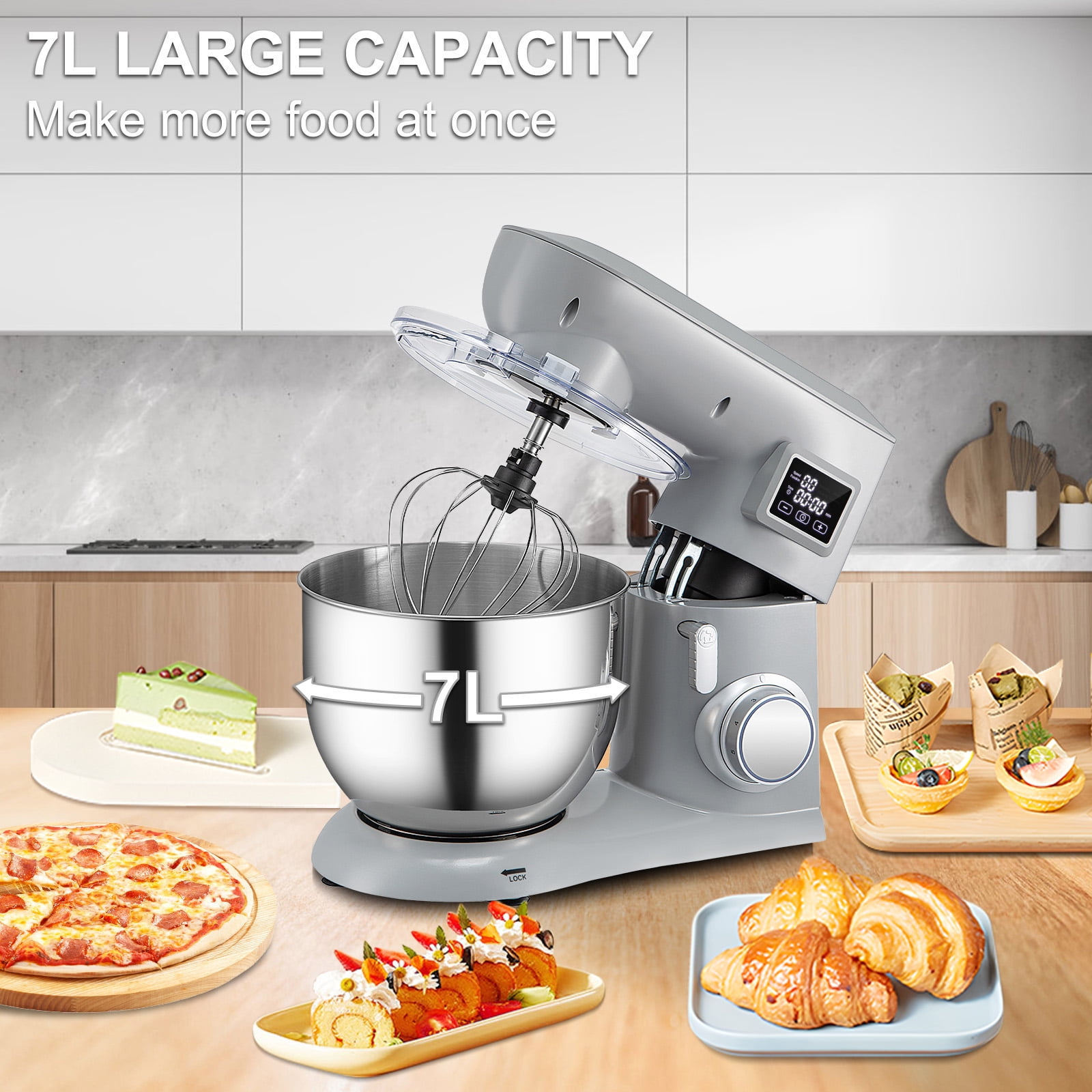 Product Description Free Your Hands and Enjoy Unattended Mixing 7.4 Qt Bowl & 450 W Motor & 3 Attachments Digital Control Panel The LCD screen accurately displays the speed and time, keeping your eyes off the machine. Whether kneading dough or whipping creams, 6-speed levels allow you to craft various recipes perfectly. Even beginners can learn the ropes quickly. Pure Copper Motor This mixer will stand up to your establishment’s most demanding jobs, featuring a powerful 450 W motor with 6 speeds. It can handle baking ingredients continuously for 1 h while maintaining low noise and evenly mixes thick batter and dough. Stainless Steel Bowl A 7 L bowl provides enough room for mixing batches of your best-selling foods. It can produce dough for 45 buns, 6 loaves of bread, or 1.5 L light cream. Besides, you can put it into the dishwasher for thorough and effortless cleaning after use. Dough Hook The dough hook with a cast aluminum coating can easily knead flour into the smooth dough. Save an unbelievable amount of time and effort compared to kneading by hand. Beater The beater has silicone scraping edges and is ideal for quickly and thoroughly mixing butter, mashed potatoes, meat salad, etc. No need to flip or scrape manually, leaving nothing to waste. Whisk This planetary mixer comes with a large thick whisk, which can rapidly blend air into the raw materials and make fluffy whipped cream, perfect protein cream, etc. Specifications Model: SM-1571NL Voltage: 120V/60Hz Color: Classic Gray Capacity: 7.4 Qt / 7 L Material: Stainless Steel + Metal Operation: LCD Touch Panel + Rotary Knob Number of Speeds: 6 Speeds + P Power: 450 W Motor Type: Pure-Copper Motor Product Dimensions: 15.8×8.1×13.5 in / 40.1×20.5×34.4 cm Net Weight: 15.7 lbs / 7.1 kg Package Content 1 x Stand Mixer 1 x 7L Stainless Bowl (with Cover) 1 x Set of Mixing Part (Hook / Beater / Whisk) 1 x Scraper 1 x User Manual