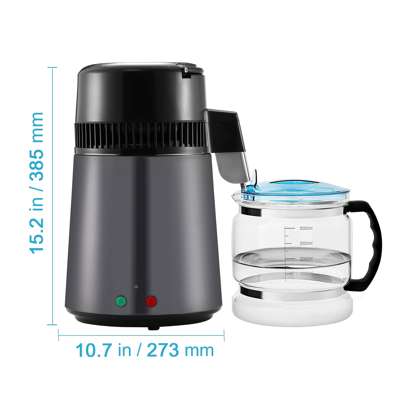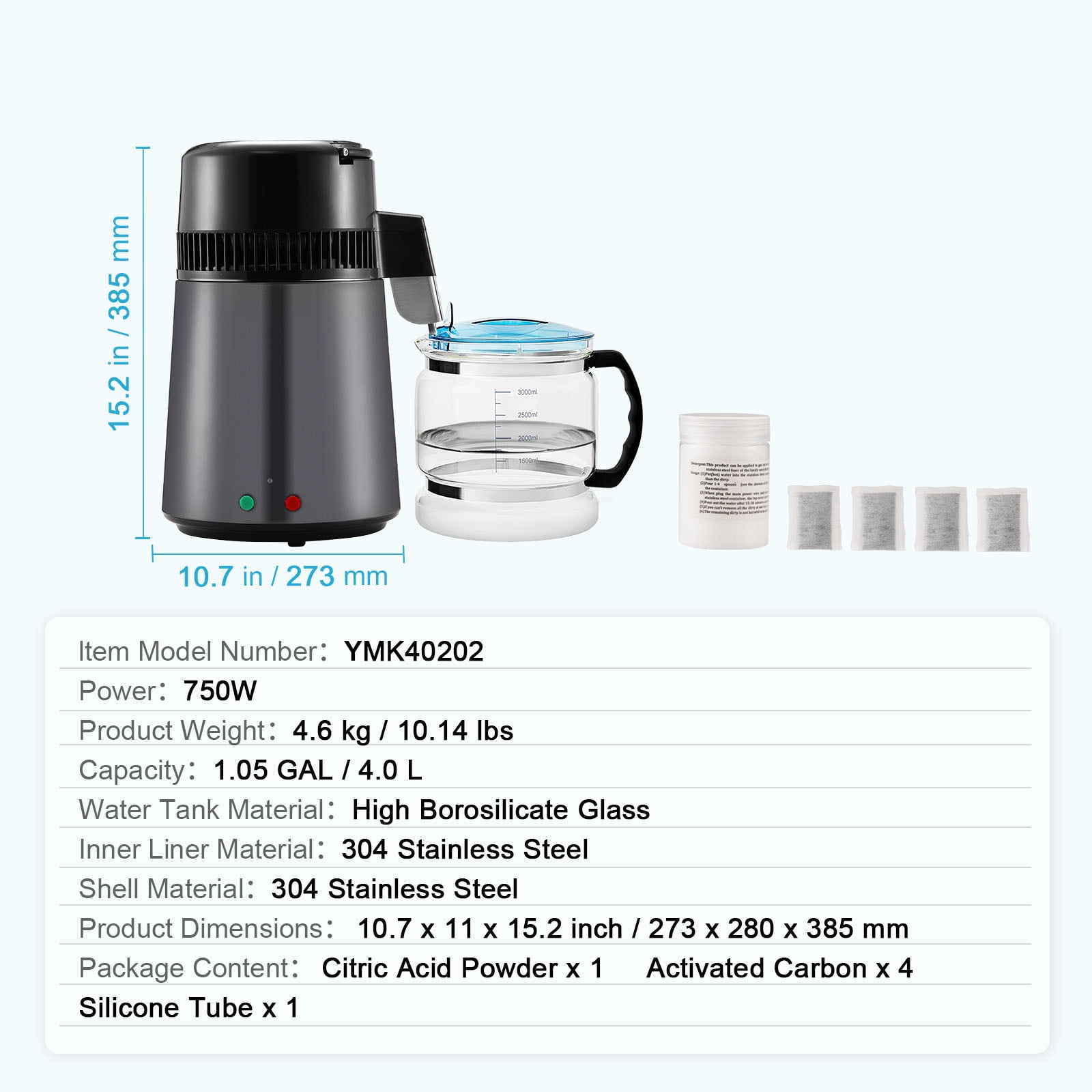 Product Description Premium Water Distiller The 750W water distiller yields over 0.26GAL/1L of water per hour, with the capacity to distill 6.3GAL/24L daily. Constructed from food-grade 304 stainless steel, it safeguards your health and ensures a consistent supply of distilled water. High Efficiency The 750W water distiller yields over 0.26GAL/1L of water per hour, with the capacity to distill 6.3GAL/24L daily. Easy to Change With simple replacement steps, the included activated carbon packs can be used as substitutes. Regular replacement is recommended to maintain the taste of your water. Food Grade Material The carafe is made of food-grade glass, BPA-free, characterized by its thickness and longevity. It meets food hygiene standards, delivering pure and clean drinking water to you. Wide Application The water distiller efficiently removes most contaminants from tap water and can be used for daily drinking water, coffee, baby formula preparation, skincare, cooking, humidifier water, CPAP machines, aquariums, and more. Fine Results With distillation and activated carbon dual filtration, it eliminates most impurities in tap water, such as VOCs, dissolved solids, and nearly all other pollutants, providing clean and healthy drinking water. Easy to Use Easy operation with the green button to start and the red button to stop. Use the reset button during distillation – no plugging or unplugging needed. It also features an over-temperature automatic protection function. Specifications Item Model Number: YMK40202 Power: 750W Capacity: 1.05 GAL / 4.0 L Water Tank Material: High Borosilicate Glass Inner Liner Material: 304 Stainless Steel Shell Material: 304 Stainless Steel Product Weight: 4.6kg / 10.14 lbs Package Content 1 x Water Distiller 1 x Citric Acid Powder 3 x Activated Carbon 1 x Silicone Tube