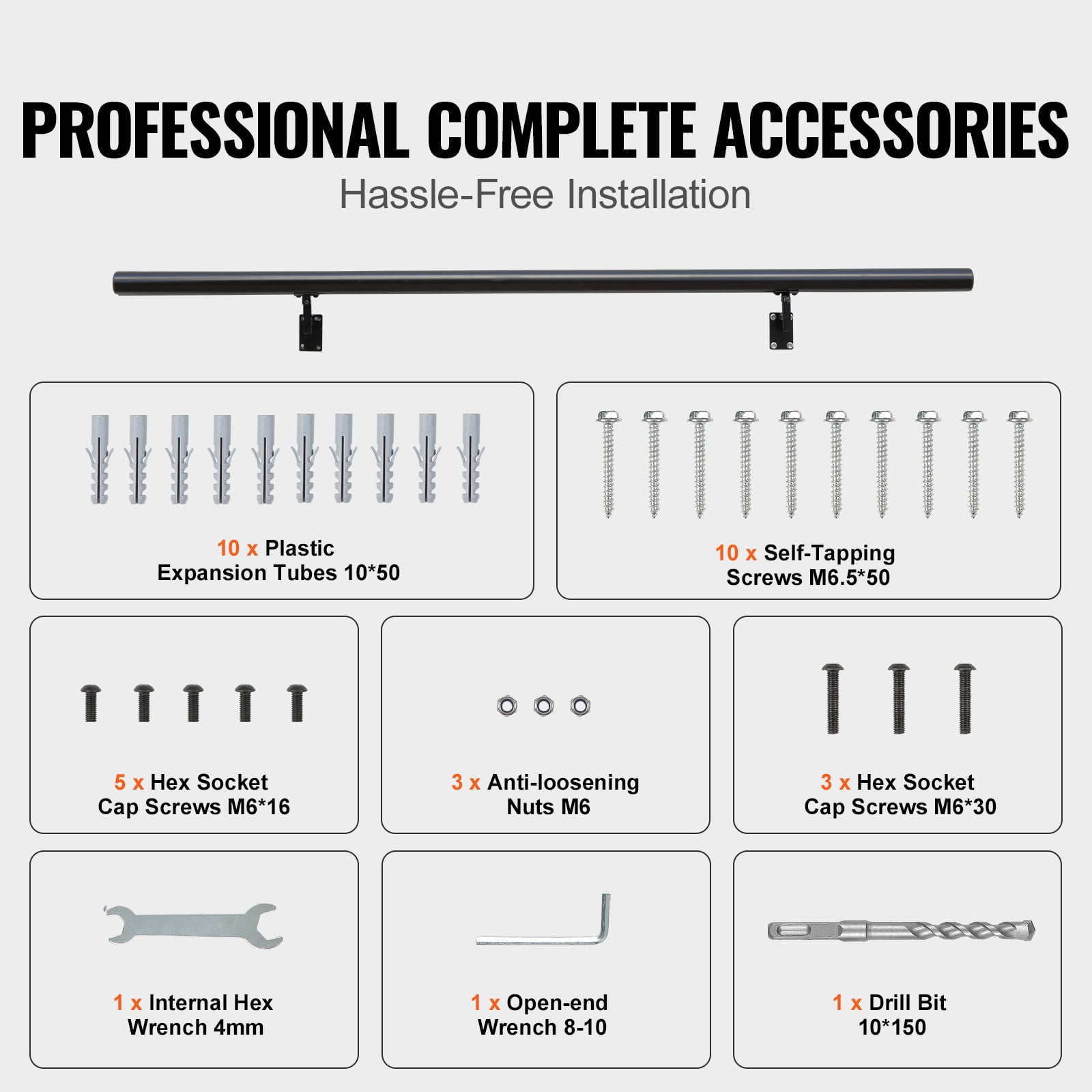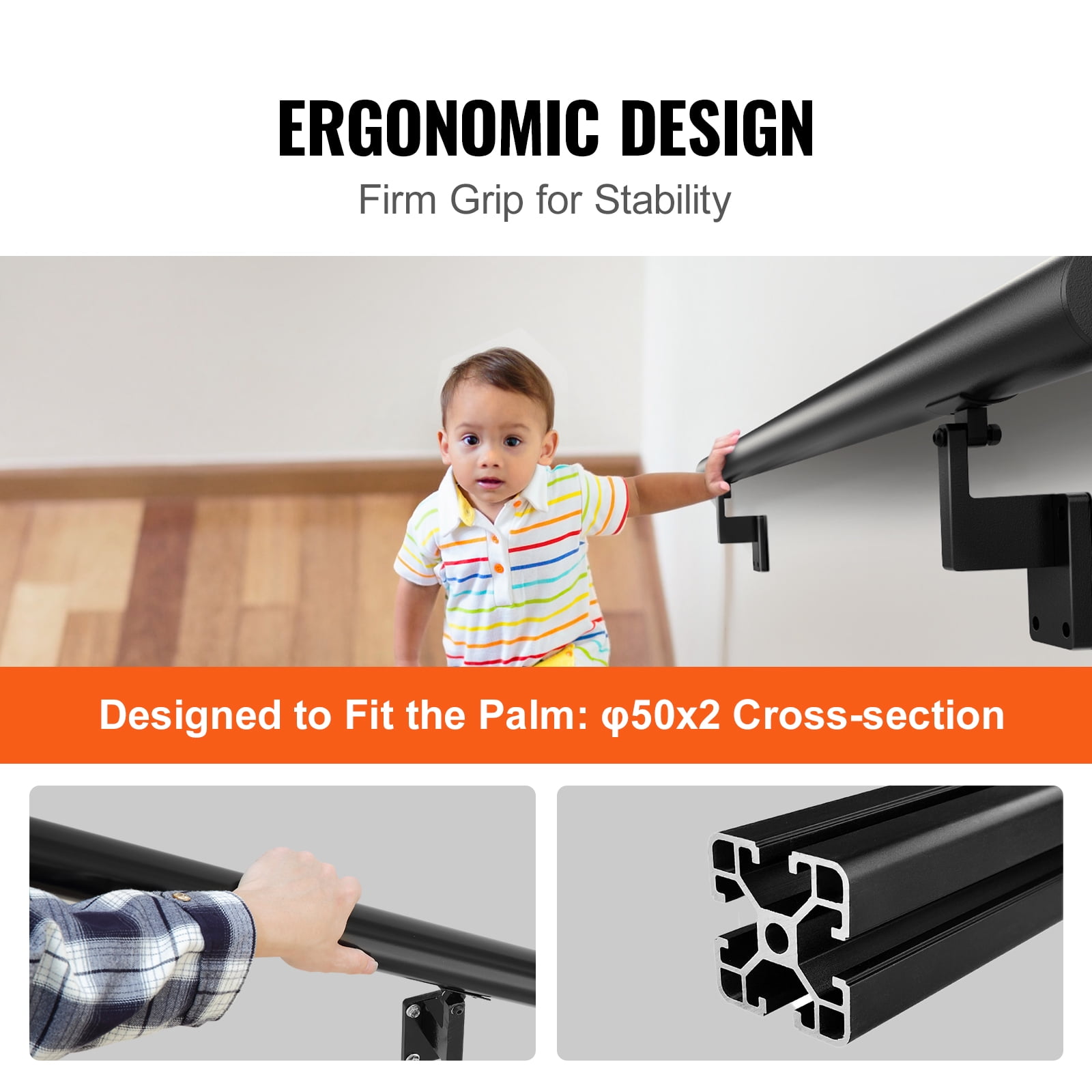Enhanced Stability: We have adopted a robust screw fixation method to ensure a secure connection between the handrail and the stairs. The non-slip design, coupled with outstanding load-bearing capacity of up to 440 lbs / 199.58 kg, allows you to rely on and support the handrail with confidence. Comprehensive Accessories: This stair handrail comes with specialized accessories, ensuring a simple and convenient installation process. There’s no need to purchase additional parts or tools. Just follow the instructions, and you can easily install the handrail, saving time and effort. Fits Various Stair Sizes: With a variety of available sizes, you can choose to install the handrail as a single segment or in multiple combinations to overlap safety concerns across the entire staircase area. Ergonomic Design: The cross-section size is φ50 x 2, providing a comfortable gripping experience that fully complies with ergonomic principles and standards. We have carefully designed the handrail’s size and shape, allowing you to naturally and effortlessly grasp it, whether you are standing or going up and down the stairs. Versatile Usage: With its sleek black appearance and powder-coated surface, the handrail easily complements various interior styles, making it a perfect fit for different decoration styles. Whether for single or multiple segments, it can be easily installed and adjusted to accommodate different stair lengths, meeting various environmental needs.