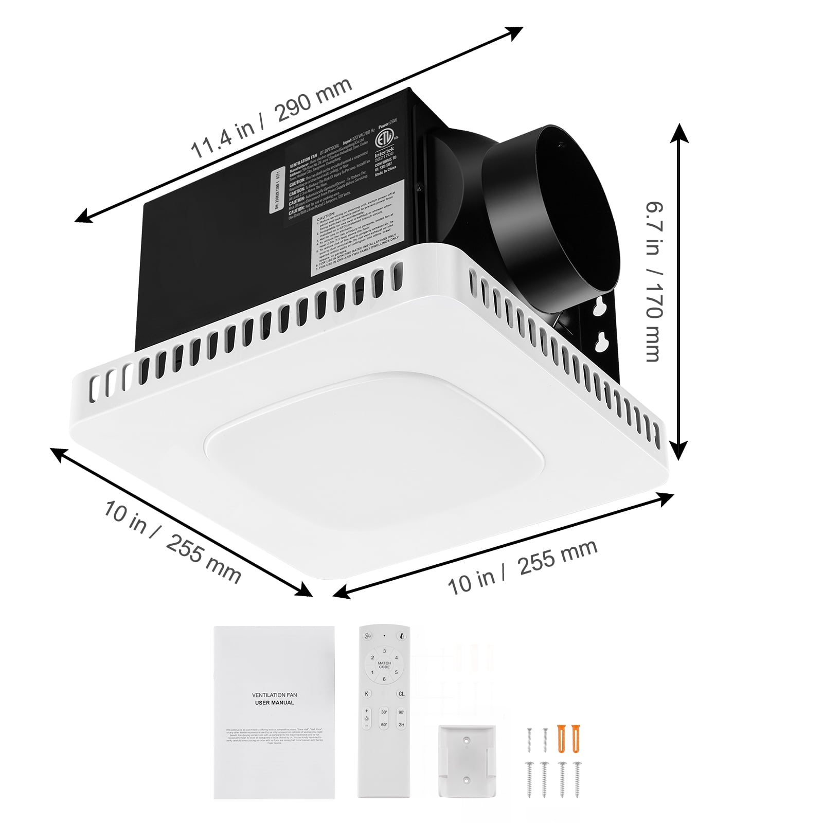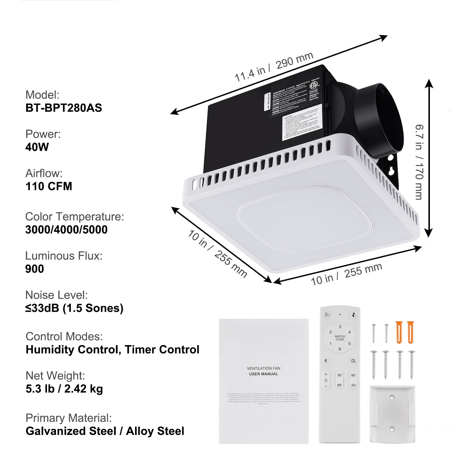 Product Description Bathroom Exhaust Fan – Bring A Tranquil Ventilation Condition Our bathroom exhaust fan comes with LED lighting, providing soft and bright illumination that’s easy on the eyes at night. It offers ventilation while delivering gentle lighting, enhancing a bright and refreshing atmosphere, making your space more comfortable. Efficient and Quiet Our bathroom exhaust fan offers powerful 110CFM airflow with a high-quality motor and quiet operation, thanks to a lightweight plastic PPFR impeller. Sturdy and Durable Its galvanized steel housing is highly resistant to water and corrosion, ensuring a long-lasting and reliable performance. Easy Installation With a cut-free design and no need for attic access, it’s a hassle-free replacement for most small bathroom fans. Versatile Applications Suitable for bathrooms, kitchens, gyms, or laundry rooms, it enhances indoor air quality for a healthier living space. Minimalist Design Our exhaust fan’s timeless white design seamlessly enhances interior aesthetics, harmonizing with various ceilings. Other Usage This exhaust fan offers versatile solutions, from bathroom steam removal to kitchen odor control, gym ventilation, and laundry room humidity management, promoting healthier indoor air quality. Specifications Item Model Number: BT-BPT190BL Rated Power: 28W Airflow: 110 CFM Color Temperature: ≤4000 Luminous Flux: 900 Noise Level: ≤33 (1.5 Sones) Primary Material: Galvanized Steel, Alloy Steel Net Weight: 5 lbs / 2.25 kg Package Content 1 x Bathroom Exhaust Fan 4 x Flat Head Screws M4*30 1 x Remote Control (No Batteries , with 2 installation screws) 1 x User Manual