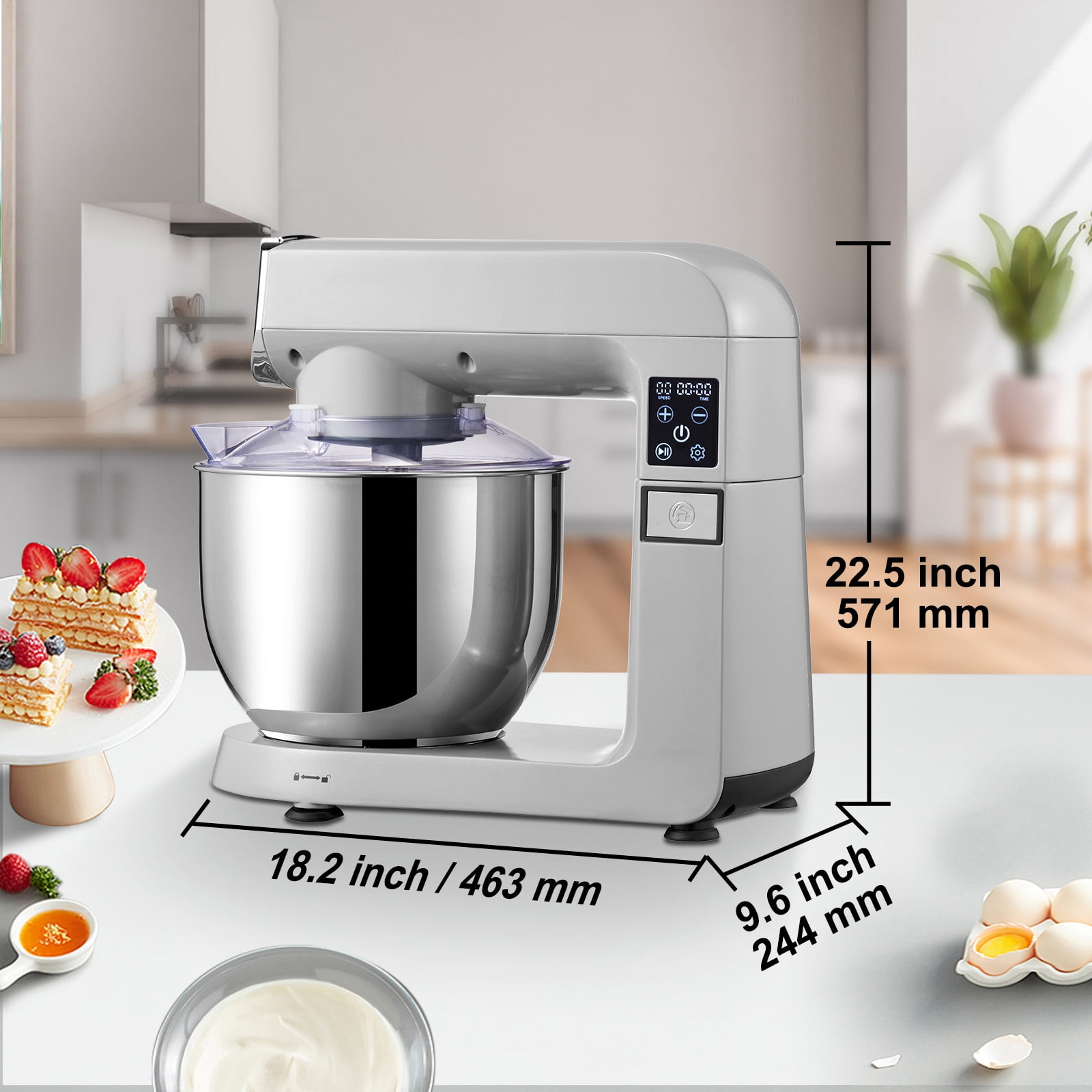 BENTISM 7.3 qt Stand Mixer, Silver with Meat Grinder, Scraper, Food Tray User-Friendly Control Panel: Features an intelligent LCD panel for easy operation, allowing you to monitor the precise remaining time and set different durations for various tasks 7.4 Qt Stainless Bowl with Fermentation: Equipped with a built-in thermostatic heating element, this bowl can automatically heat to the right temperature for fermentation, enabling you to knead raw materials for up to 6 toasts at once Efficient Mixing: The planetary mixing mechanism ensures full contact between the beater and the bowl, while the flat beater’s soft silicone edge scrapes sticky ingredients effortlessly Complete Accessories: Comes with 3 dishwasher-safe attachments: a dough hook, a beater, and a whisk, along with a scraper and splash-proof cover. Additional accessories include a meat grinder, sausage stuffer, and vegetable slicers Powerful 6-Speed Motor: The 450W gear-driven copper motor provides continuous high-torque mixing with 6 speed levels, perfect for various mixing tasks from kneading dough to whipping cream