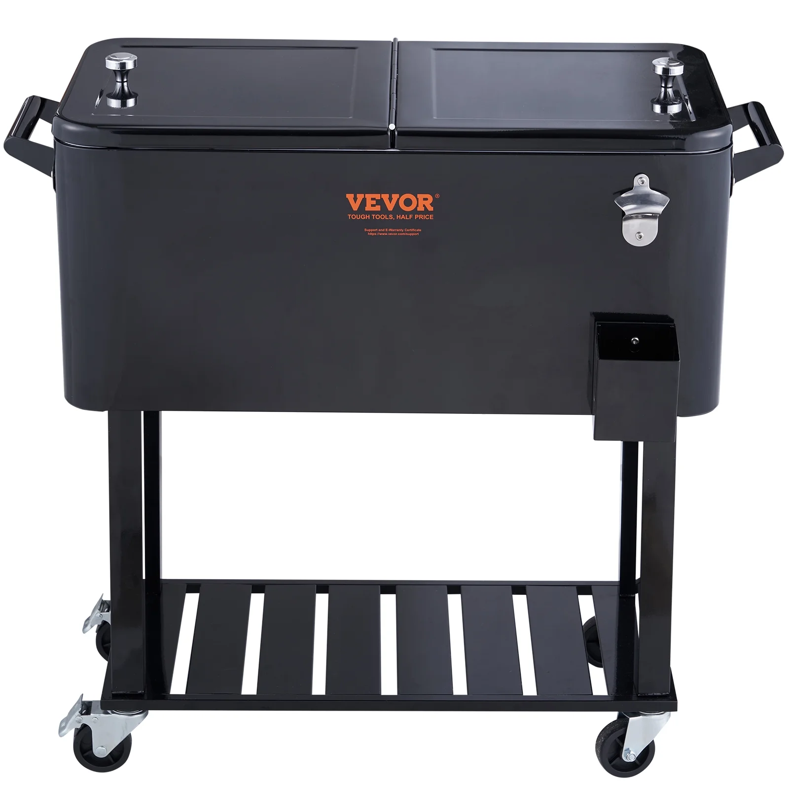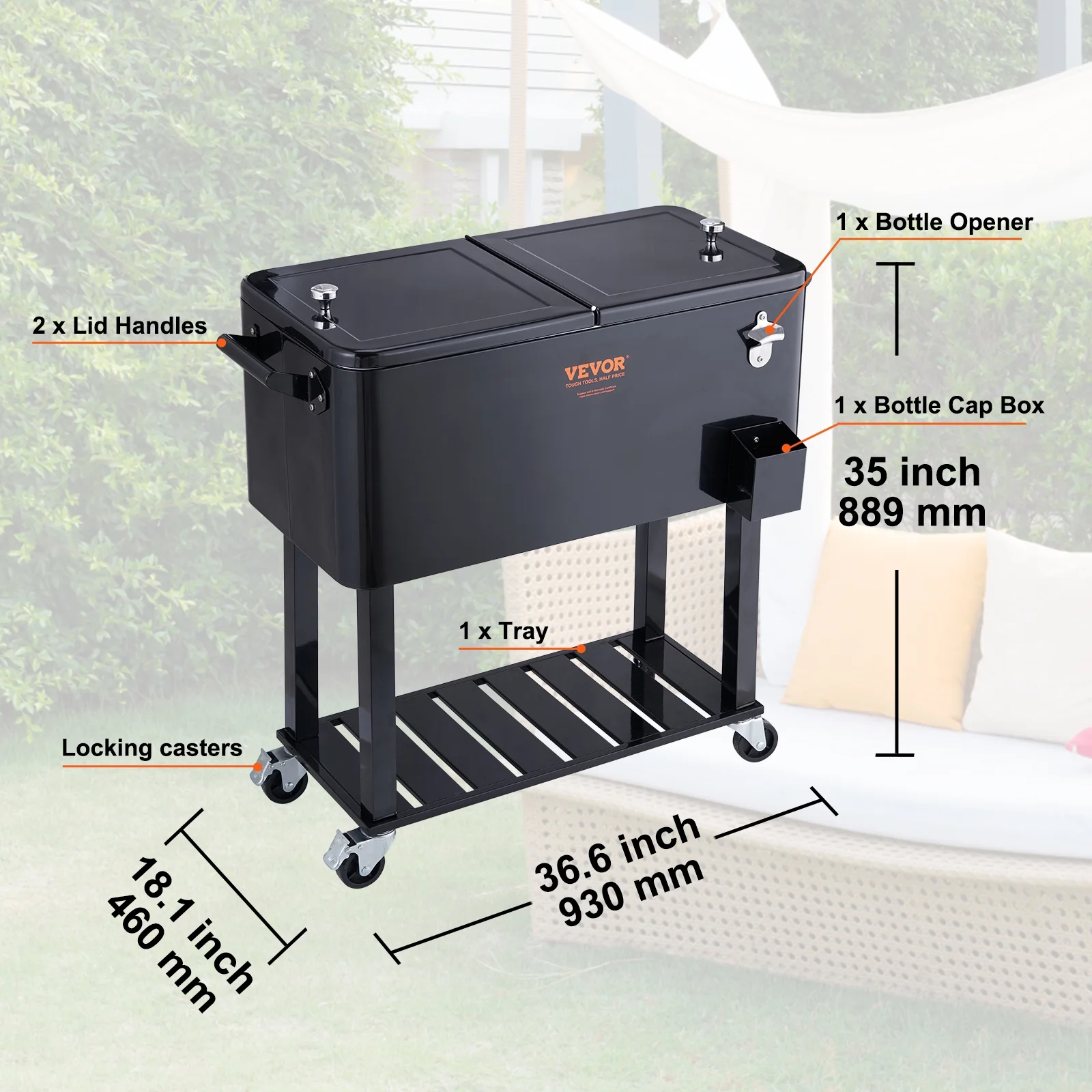 BENTISM 80 Quart Steel Cooler Cart, Bottle Opener Spacious Capacity: This rolling cooler cart features an 80QT capacity, accommodating up to 320 cans, perfect for gatherings and outdoor events Longlasting Insulation: Constructed with PU injection foam and foodgrade PP insulation, it keeps drinks cool for up to 48 hours Durable Design: The thickened powder coating enhances resistance to harsh weather conditions, ensuring longevity and durability Enhanced Storage: The unique fencetype tray design prevents water accumulation and rust while providing extra space for drinks Easy Mobility: Equipped with four 360° multidirectional locking casters for stable movement without shaking