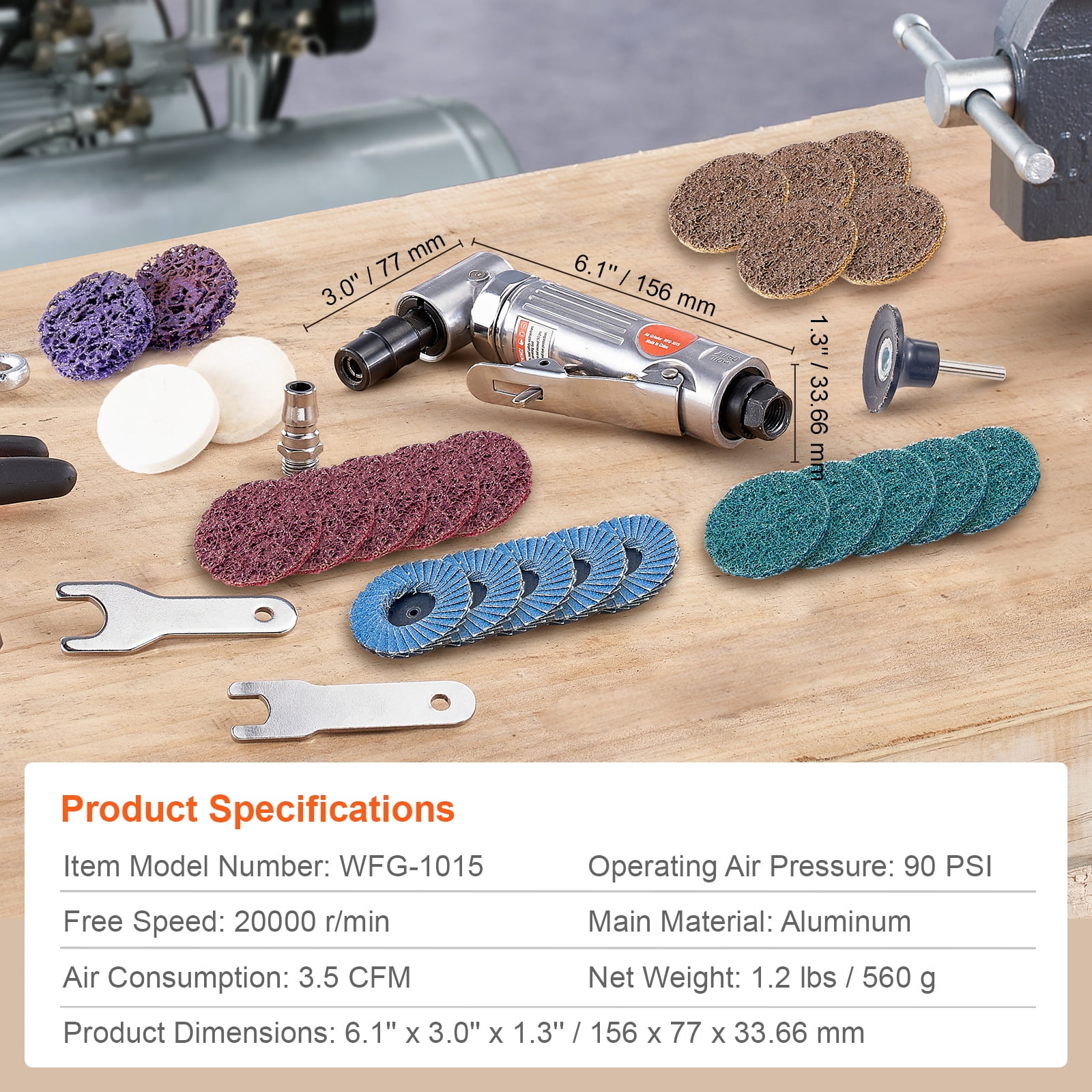 Powerful plus Robust: BENTISM’s air die grinder has a ball-bearing construction, provides a robust 20,000 RPM operation at 90 PSI and 3.5 CFM air consumption, pair it with a 1.5HP air compressor for precise, high-powered grinding tasks every time. Versatile & Ready for Anything: Whether it’s automotive, metalwork, or furniture crafting, this air grinder kit has you covered. Included are 24 top-quality sanding discs — from wool discs for polishing to nonwoven discs for surface treatments. One tool, countless applications. Built to Last: Quality is in the details. Our air die grinder is fortified with an aluminum housing, durable ball bearing construction, and precision-machined steel gears. The 1/4″ high-precision collet stands up to intense forces, ensuring long-lasting performance. User-Friendly & Lightweight Design: Weighing just 1.2 pounds and designed for a one-handed grip, our angle die grinder is a breeze to operate. Its ergonomic structure combined with a right-angle head makes even tight or angled grinding straightforward. Safety First, Always: Our air grinder tool’s safety lock ensures zero accidental startups. Plus, the rear exhaust design doesn’t just keep noise levels down; it ensures exhaust won’t be a bother, prioritizing your comfort and safety.
