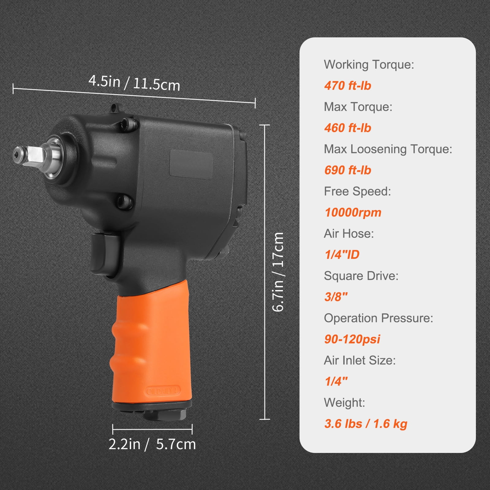 High Performance: BENTISM air impact wrench features twin hammer impact mechanism, delivers up to 690 foot-pounds of nut busting torque, tackles light duty assembly and disassembly applications, auto repairs and maintenance with exceptional performance and control. Lightweight Design: Weighing only 3.6 pounds, this impact gun is compact and lightweight, with its aluminum body and anti-slip rubber handle, it minimizes hand & wrist fatigue, so you can work comfortably and faster. Strong & Durable: High alloy steel provide superior resistance to withstand extreme levels of torque changes; Always remember to lubricate your air impact wrench before use to greatly extend air tool life. Easy Torque Control: This 3/8 inch impact wrench uses a 6-position combined forward/reverse and power management regulator, allowing you to switch between working modes and adjust torque output to handle any auto repair tasks. Wide Applications: BENTISM 3/8 inch air impact gun is powerful enough to loosen bolts and nuts, ideal for light duty auto repair shops or home repairs and maintenance; Avg. Air Consumption: 4.5 CFM. Air pressure: 90-120 PSI. Up to 690ft-lbs Nut-busting Torque|Lightweight Design|Strong & Durable|Easy Torque Control|Wide Applications