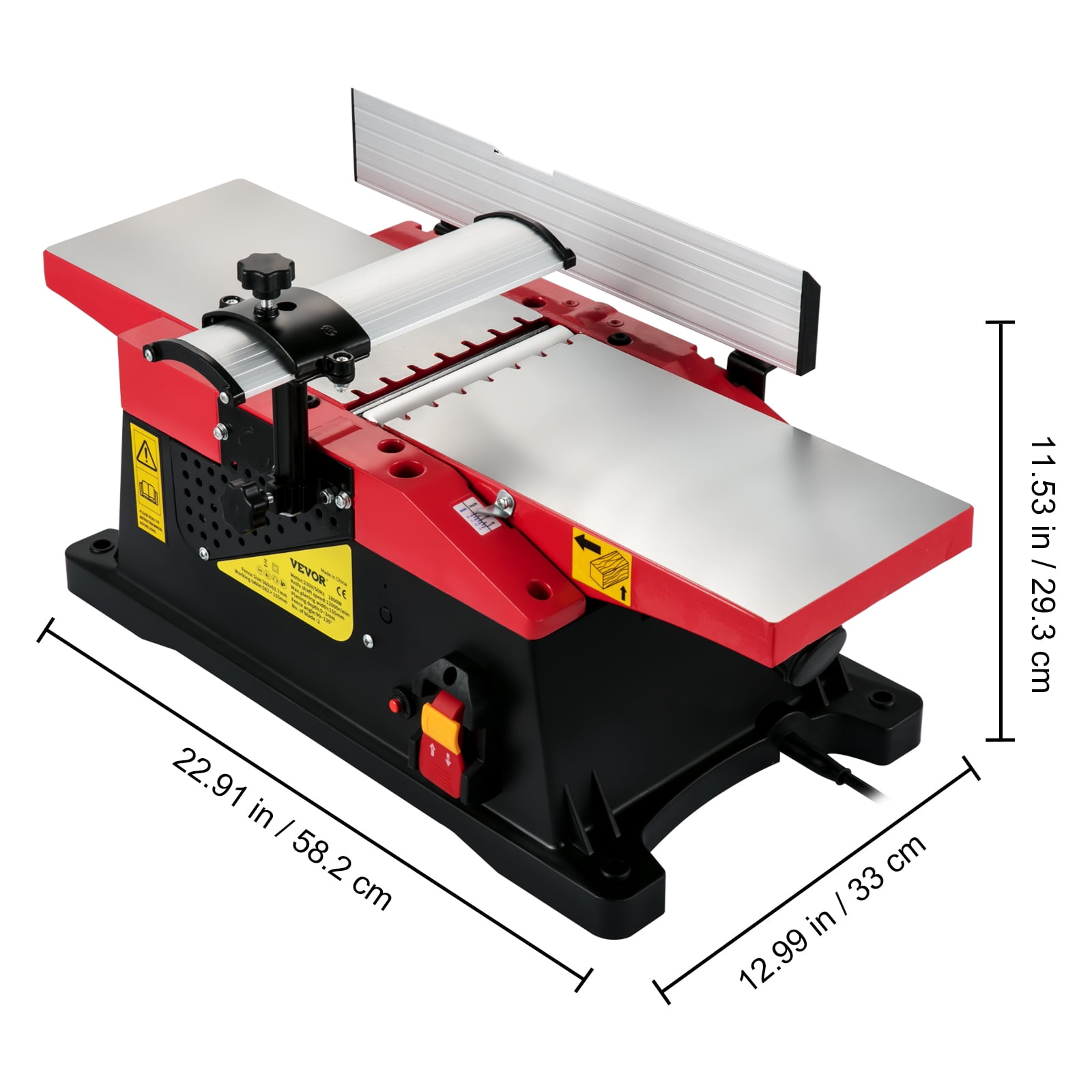 Product Description 6in Desktop Benchtop Jointer VEVOR woodworking benchtop jointers boast a sturdy, compact desktop design with 2 push blocks. It has an adjustable height knob, a powerful copper motor, two precise blades as well as other high-performance details that help you get the job done quickly and securely. Widely used in solid wood planing, construction planning wood, DIY wood products, and woodworking decoration. Capable enough to handle a range of materials and sizes. Specifications Model: M1B-LS-1558 Color: Red & Black Power: 1650 W, 8 A 110 V Max Planing Width: 6 in / 155 mm Planing Depth: 0 – 0.12 in / 0 – 3 mm Knife Shaft Speed: 12000 RPM Fence Angle: 90 – 135 Degrees Working Table: 22.9 x 6.1 in / 582 x 155 mm Table Material: Aluminum HSS Blade: 6.1 x 0.65 x 0.07 in / 154.5 x 16.5 x 2 mm Dust Inner Diameter: 2 in / 51 mm Dust Outer Diameter: 2.2 in / 56 mm Product Size (L x W x H): 22.91 x 12.99 x 11.53 in / 582 x 330 x 293 mm Net Weight: 20.72 lbs / 9.4 kg Package Content 1 x 6-inch Benchtop Jointer 2 x Push Blocks 1 x User Manual