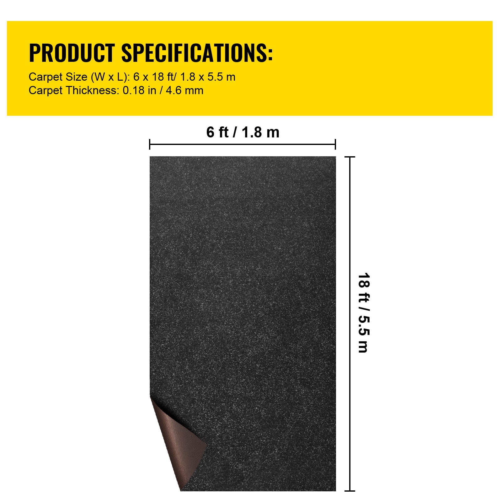 Product Description 6×18 ft Marine Carpet This is a fashion carpet for marine and home patio use. Made of high-quality polyester fiber and TPR backing, it is water, oil, and ravel resistant. It will restore your classic old boat and bring extra beauty to space. Easy to clean and maintain, quite suitable for both home and commercial occasions. Specifications Color: Black Product Length: 18 ft / 5.5 m Product Width: 6 ft / 1.8 m Material: Polyester Fiber + TPR Carpet Thickness: 0.18″ / 4.6 mm Pile Height: 0.17″ / 4.5 mm Carpet Weight: 1.1 kg/㎡ Package Content 1 x Marine Carpet