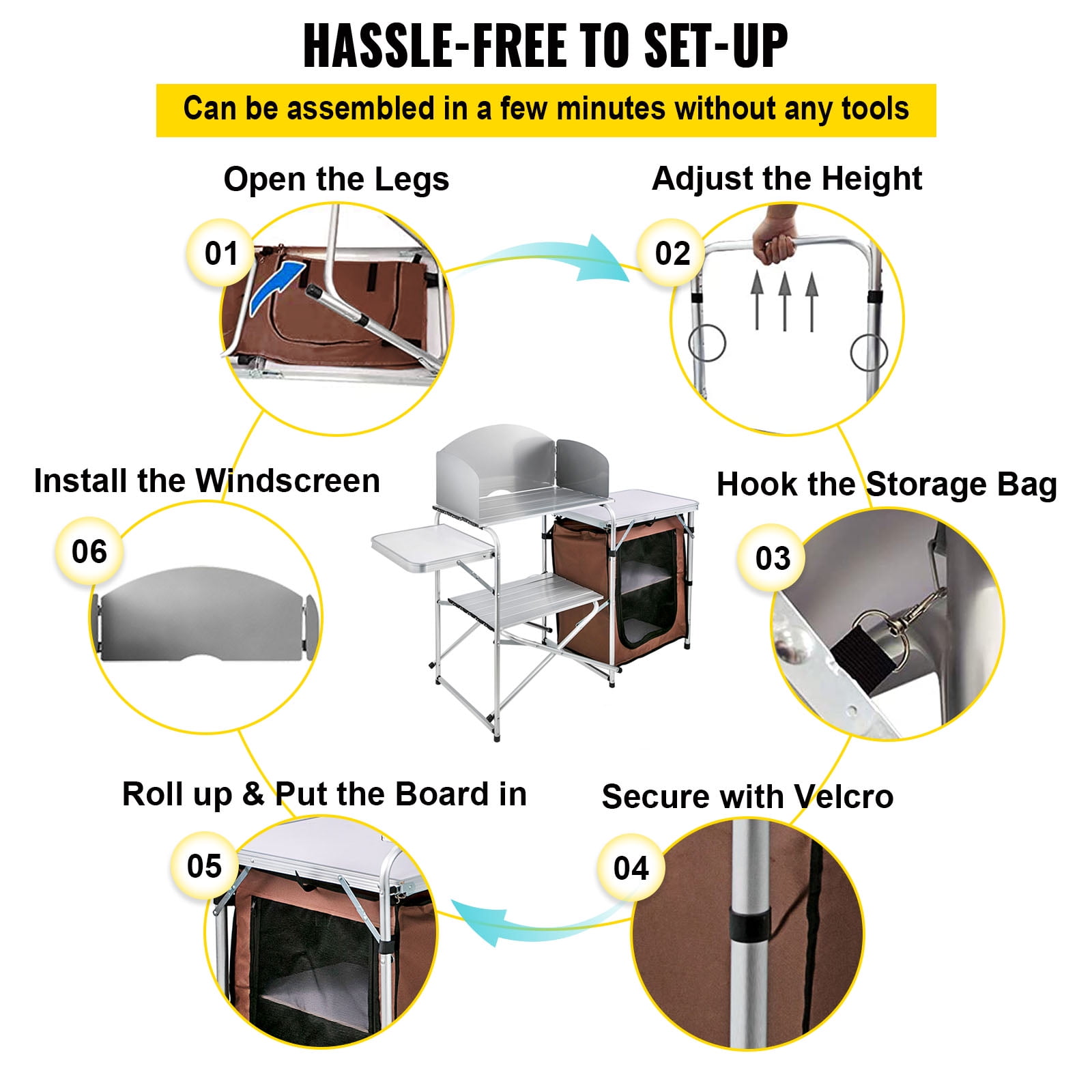Spacious Storage Space: The camp kitchen table comes with a roll-up aluminum tabletop, a windshield and 2 side tables, holding your grills, cooking tools, condiments, and other supplies. The 2-tier detachable storage organizer provides you with extensive space to place utensils in order. Convenient Installation in Minutes: The camp kitchen is easy for you to unfold, set up, and fold in minutes. Take out the camping table from the carrying bag, adjust the leg height, press the hasp and button to lock it, tie the hook and Velcro, and put the top board and shelf in the correct position. Then, a firm foldable camping kitchen is ready for you. Stable & Durable Structure: With the reinforced X-shaped structure and durable MDF tabletop, the camp kitchen has a high load-bearing capacity. The easy-to-clean tabletop is strong enough to hold most of the things that you need. Premium oxford cloth features waterproof and weather resistance, so you don’t have to worry about your kitchen camp set becoming worn. Portable & Lightweight: This kitchen table can be taken outdoors with our carry bag and stored effortlessly, thanks to its foldable and lightweight design. And the detachable aluminum top and rack make the table set up or break down completed in less than a minute. Super easy to carry and operate. Create Fun Anywhere: Our camping table is ideal for indoor and outdoor activities, such as picnics, backyard barbecues, tailgating parties, or an overnight hit outdoors. It can solve the problem of placing and storing items outdoors and enhance your outdoor experience.