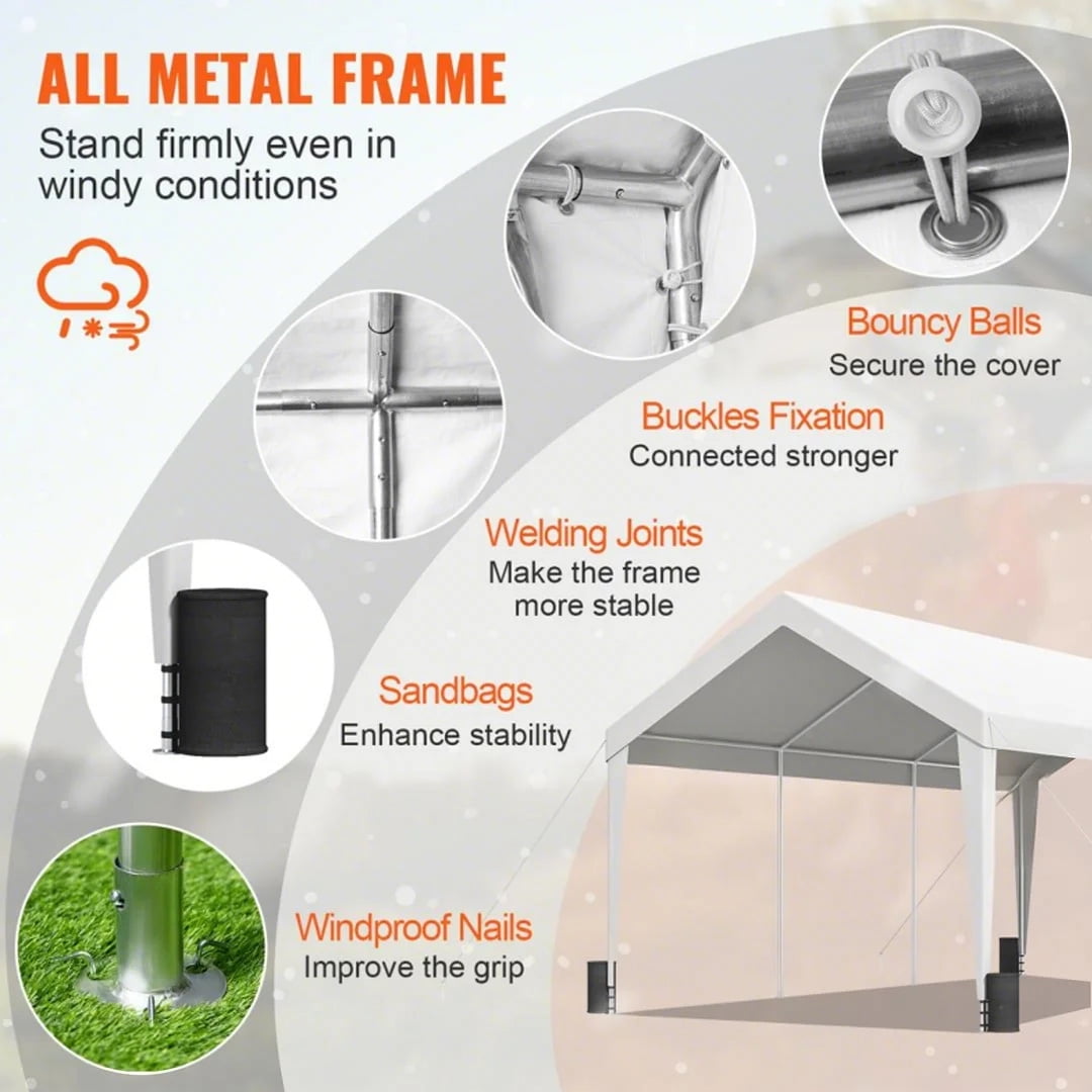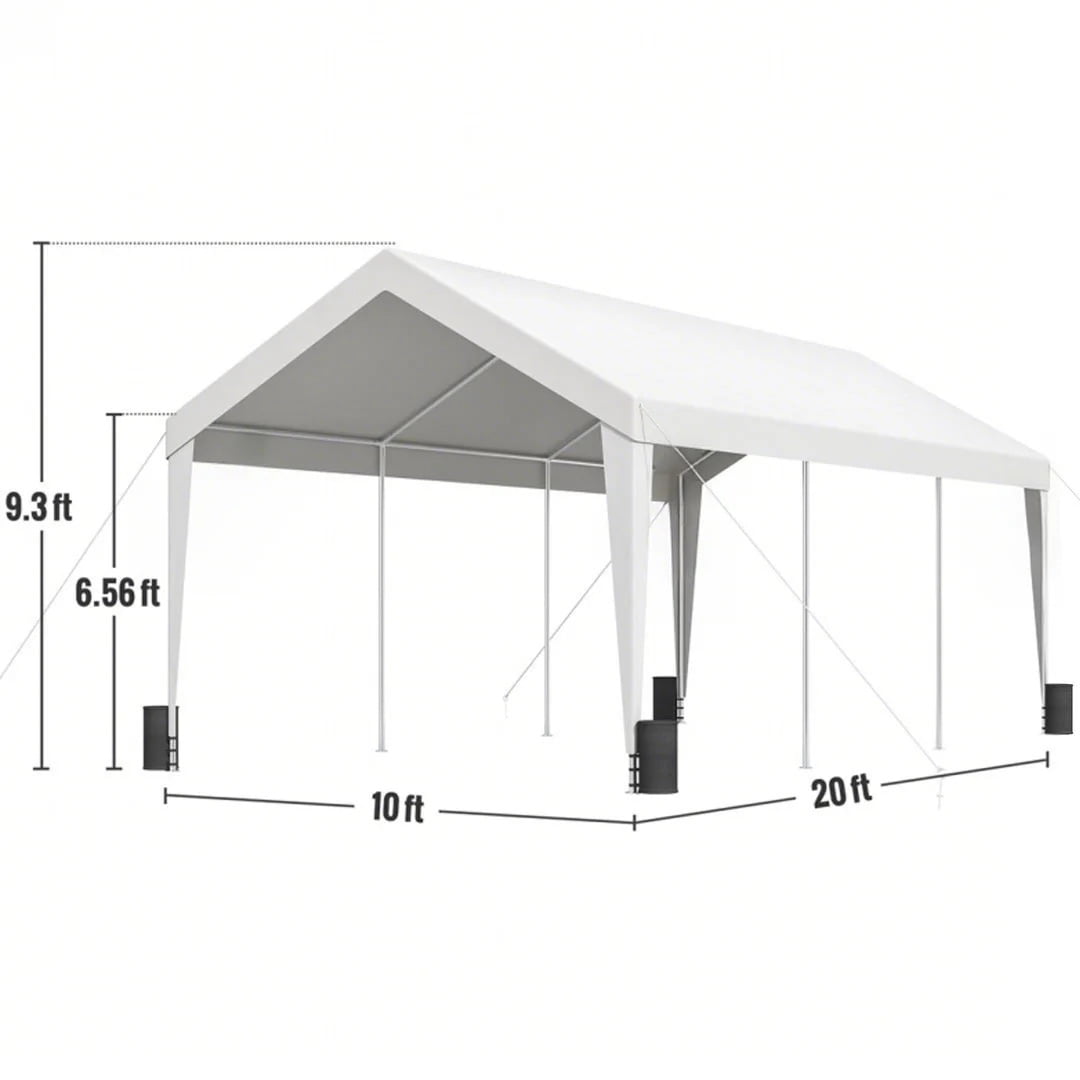 Product Description 10 X 20 FT Heavy Duty Carport Canopy Covered with 180g UV-resistant PE fabric, our heavy-duty carport provides unbeatable protection against sun, rain, snow, and wind, ensuring your beloved car stays safe and secure. Plus, the structure is made of φ38mm galvanized steel pipe with a unique double-walled structure and a wall thickness of 0.8 mm, you can rest assured that it’s built to last. Whether you’re looking to create a perfect parking spot or host outdoor gatherings with family and friends, this car shelter cover has got you covered! Windproof & Reinforced Frame The stable tent frame comprises 8 galvanized steel pipes and machine welding joints. Feel at ease when you start your next big camping adventure, even on windy days. Stability Ensured The bottom of the supporting foot comes with a solid foundation, and the whole carport can stand firmly and securely on the ground without shaking. Tie-down with Ease There are multiple rust-proof metal grommets and 44 bungee balls. You can easily fasten a tarp and build a stable car canopy for parking, a party, and more. Superior Material The carport cover adopts a 180g thick PE fabric, with waterproof heat insulation coating on both sides for a better defense effect. Made to Last The thickness of φ38MM galvanized steel pipe is 0.8mm, making it resistant to deformation and ensuring long-term use. Applicable to Various Activities 10 x 20 x 9.3 ft canopy garage shelter provides enough space for parking. It is also essential for outdoor parties, weddings, or other commercial activities. Specifications Product Type: Heavy Duty Carport Product Size: 10 x 20 x 9.3 FT / 3 x 6 x 2.8 m Product Color: White Carport Cover Material: 180G/㎡ Double-sided Coating PE Frame Material: Galvanized Steel Pipe Column Diameter: 1.49 in / 38 mm Wall Thickness: 0.03 in / 0.8 mm Number of Columns: 8 Product Weight: 105.8 lbs / 48 kg Package Size: 42.1 x17.7 x12.9 in / 107 x 45 x 33 cm Package Content 1 x Steel Frame (After Assembled) 1 x Carport Cover 4 x Nylon Rope 24 x L-Shaped Ground Nail 44 x Bounce Balls 4 x Windproof Nail 2 x Open Wrench 2 x Pairs of Glove 4 x Sandbag 1 x Manual