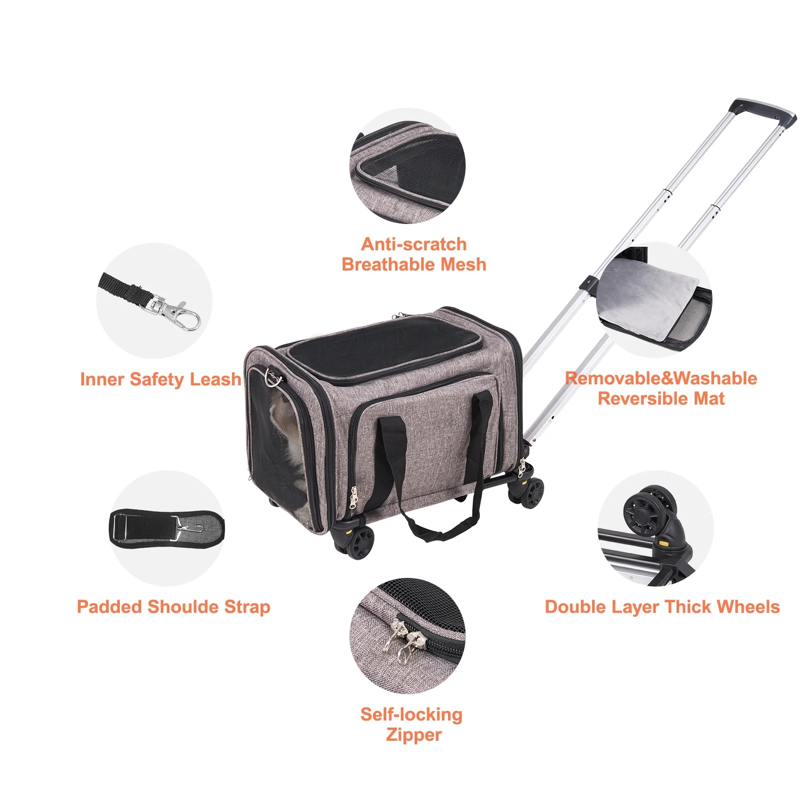 Airline-Approved Cat Carrier: Designed to meet TSA standards, our rolling pet carrier can be used under most airline seats. Size of the pet bag: 17.5×11.2×11.4 in (445x285x290 mm). Recommend for pets up to 25 lbs. Please check the regulations of the airline before departure. Comfortable and Breathable: Extended on both sides to provide a spacious space. With 4 sides breathable mesh windows, our pet carrier provides excellent ventilation and a wide view. The back and shoulder straps have thick padding for added comfort during long trips. The small side pocket can be used to store pet supplies and a pet bowl, so you can keep your pet’s food on the go. Sturdy and Durable: Made of 600D Oxford cloth thickened fabric, the cat carrier with wheels can carry small pets up to 25 lbs. It features long-lasting use. Perfect for car travel, trips to the vet, or any adventure with your small furry friend. Double-layer Wheels: The rolling cat carrier features 360° smooth and quiet double-layered, wear-resistant wheels with a 2.3-inch diameter. It ensures a bump-free journey on various road surfaces for your pet. User-friendly Details: Enjoy versatile use with multiple carrying options: hand-held, wear on your back or shoulder, or pull with the 3-level adjustable aluminum alloy pull rod. The self-locking zipper prevents your pet from escaping, while the detachable Velcro offers easy carrying and storage.
