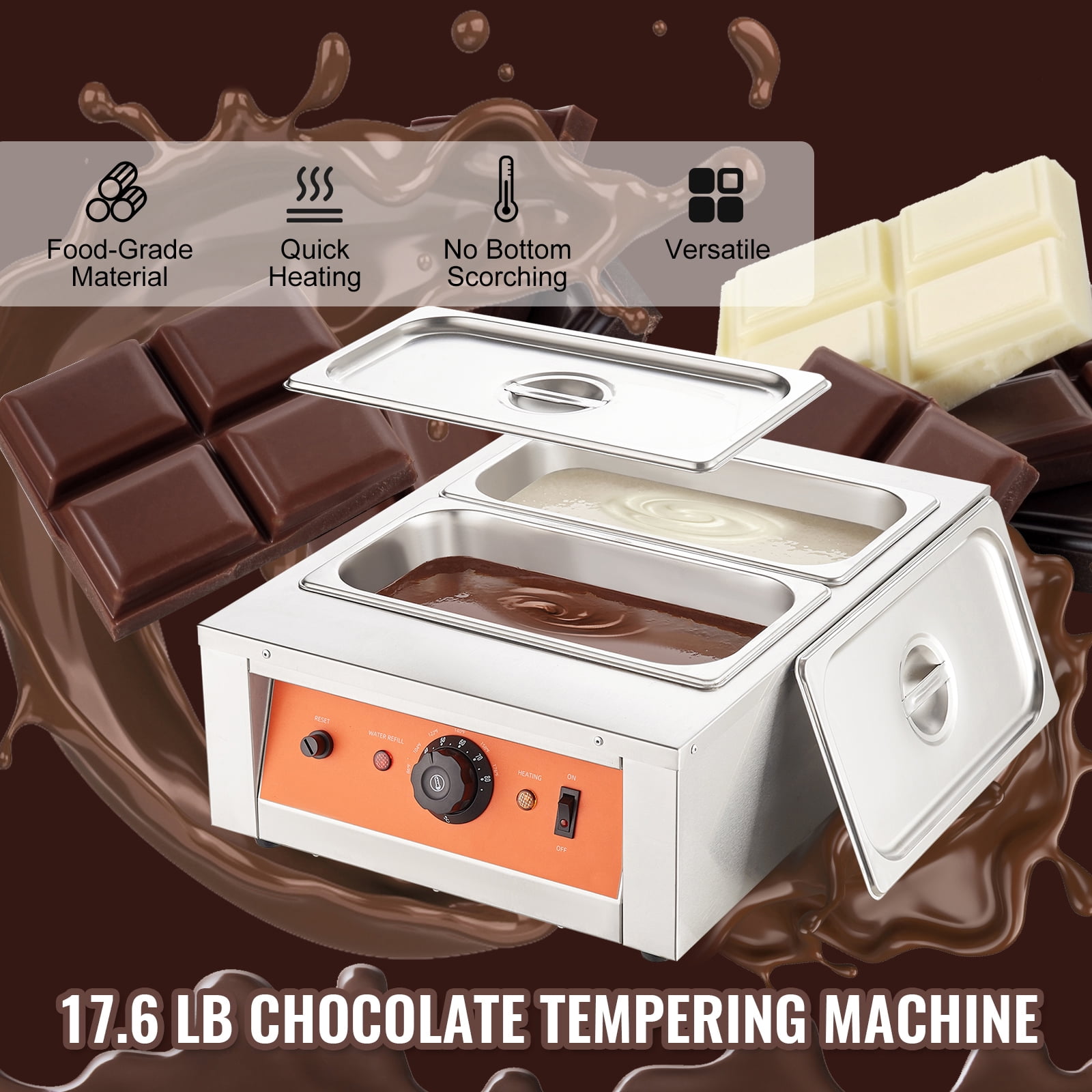 Product Description Double-Cylinder Chocolate Melter The chocolate tempering machine is designed for convenient operation, aims to melt chocolate and maintain it at a stable temperature. It is suitable for various occasions such as family gatherings, hotel restaurants, and bakeries. The entire machine is made of heavy-duty food-grade stainless steel and features detachable containers. This chocolate melter is equipped with multiple safety features, including dry-burning prevention, water bath melting, and flavor preservation during standby. Double-cylinder Chocolate Melter This chocolate melter utilizes the heat generated by water temperature, which is transferred to the chocolate through the cylinder, allowing the chocolate to be heated gradually and melt smoothly, resulting in a rich and flowing chocolate. Heavy-Duty Food-Grade Stainless Steel This chocolate melting machine features rust-proof, corrosion-resistant, aesthetically pleasing, and durable. It features detachable pots, accompanied by a clean and hygienic dust cover, providing excellent insulation and heat preservation performance. Wide Temperature Range The temperature can be manually adjusted within the range of 86℉-185℉ (approximately 30℃-85℃), making the operation simple and ensuring precise temperature control. Circulating Heating The interior of this chocolate melting pot consists of a U-shaped heating tube and water bath heating, preventing chocolate from sticking to the bottom. It ensures even heating of the chocolate, better fluidity of the mixture, and smoother sauces. Considerate Details Stainless steel food warmer is designed with rounded corners, providing a user-friendly and safe experience while offering convenience and comfort in both work and daily life. Versatile Use This chocolate fondue is especially suitable for heating and melting chocolate blocks, butter blocks, cream, milk, and more. It is applicable to various occasions, such as family gatherings, hotel restaurants, and bakeries. Specifications Item Model Number: CS-4-US Voltage: AC110V~120V 60Hz Power: 1500W Number of Cylinders: 2 Capacity: 2 x 3.3 L / 2 x 3.75 qt Temperature Adjustment Range: 30℃-85℃ / 86℉-185℉ Product Weight: 6.5 kg / 14.33 lbs Product Dimensions: 490 x 362 x 176 mm / 19.1 x 14.1 x 6.9 inch Package Content 1 x Chocolate Tempering Machine