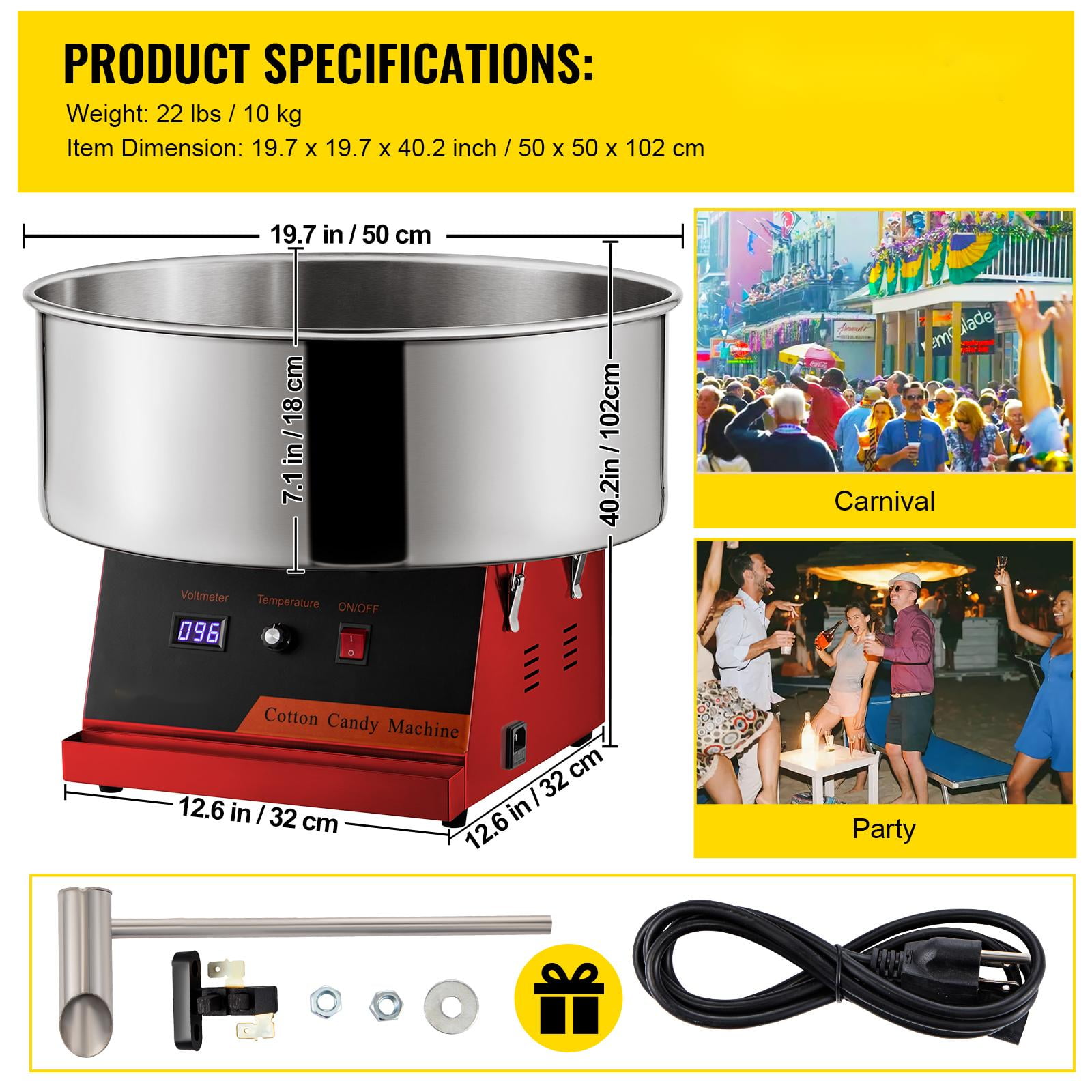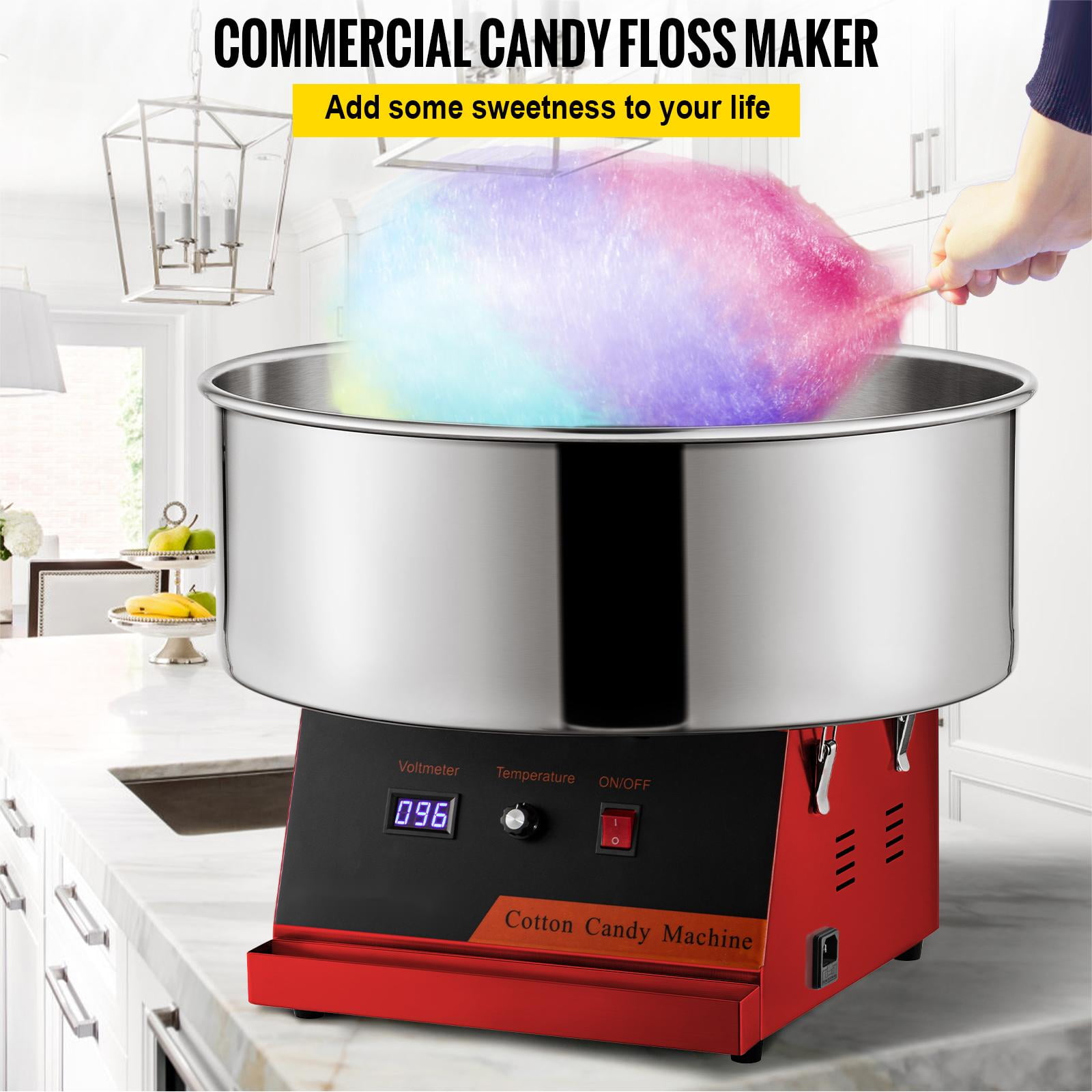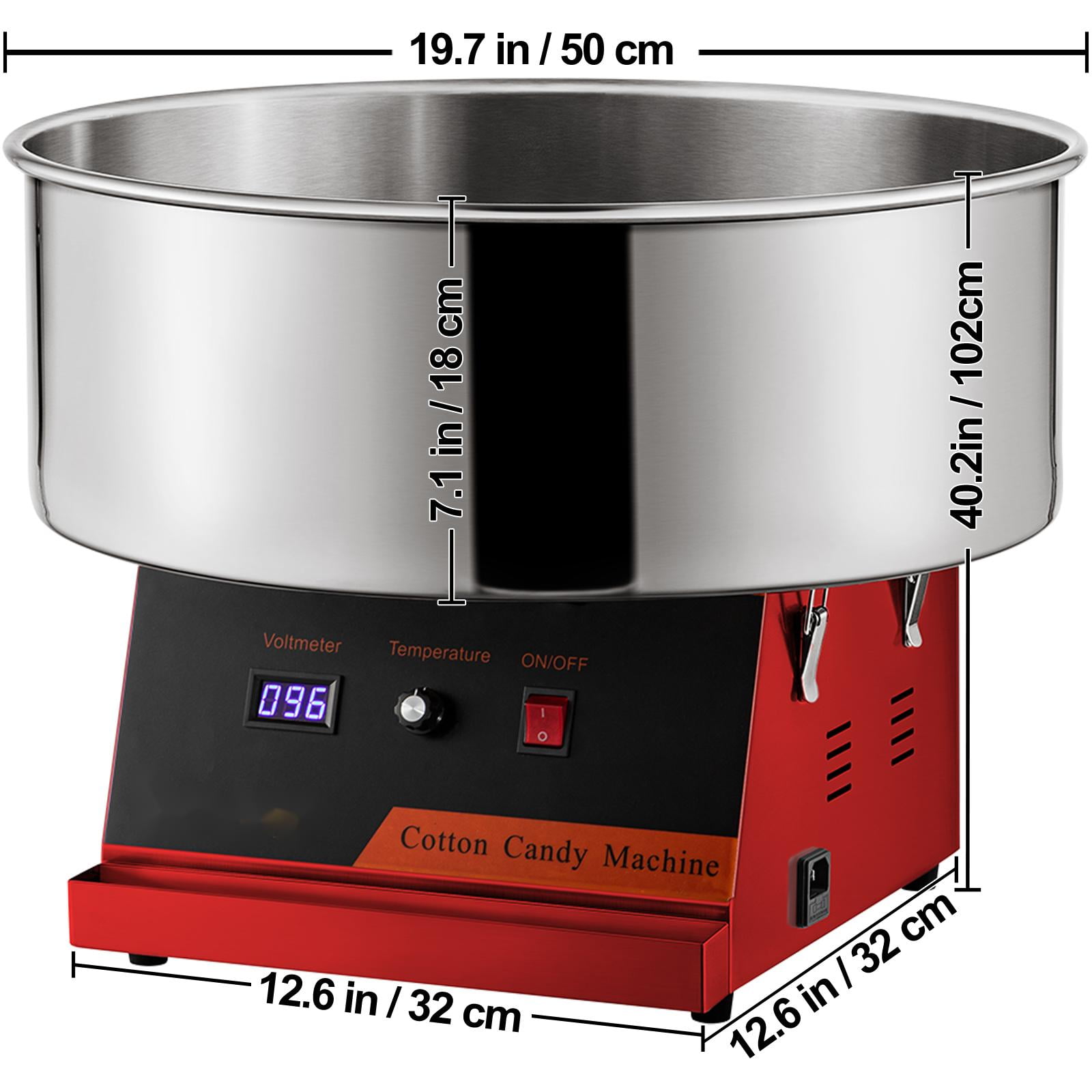 Product Description Serious Cotton Candy Making This commercial-grade cotton candy maker’s performance will not disappoint as it produces 2 to 3 servings of cotton candy per minute! Watch the smiles on kids’ faces as you hand out fluffy deliciousness that will brighten their day.This versatile product is not limited to granule sugar only. It’s capable of melting hard candies and making delicious floss out of them. Nerds, Life Savers, Soda Poppers, and more! Experiment with your favorites, and come up with delicious flavors. Specifications Model: VV-CCM-XF-21 Power: 1050W Head Rotating Speed: 5000RPM Preheat Time: 2 Min Cotton Candy Yield: 120 pcs/h Body Material: Carbon Steel Bowl Material: Stainless Steel Adjustable Temp Range: 338-482℉ / 170-250℃ Bowl Diameter: 19.7 inch Bowl Height: 7.1 inch Product Dimensions: 19.7 x 19.7 x 16.9 inch Product Weight: 22 lbs Package Content 1 x Cotton Candy Machine 1 x Sugar Scoop 1 x Carbon Brush