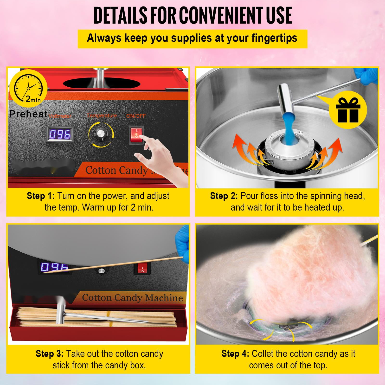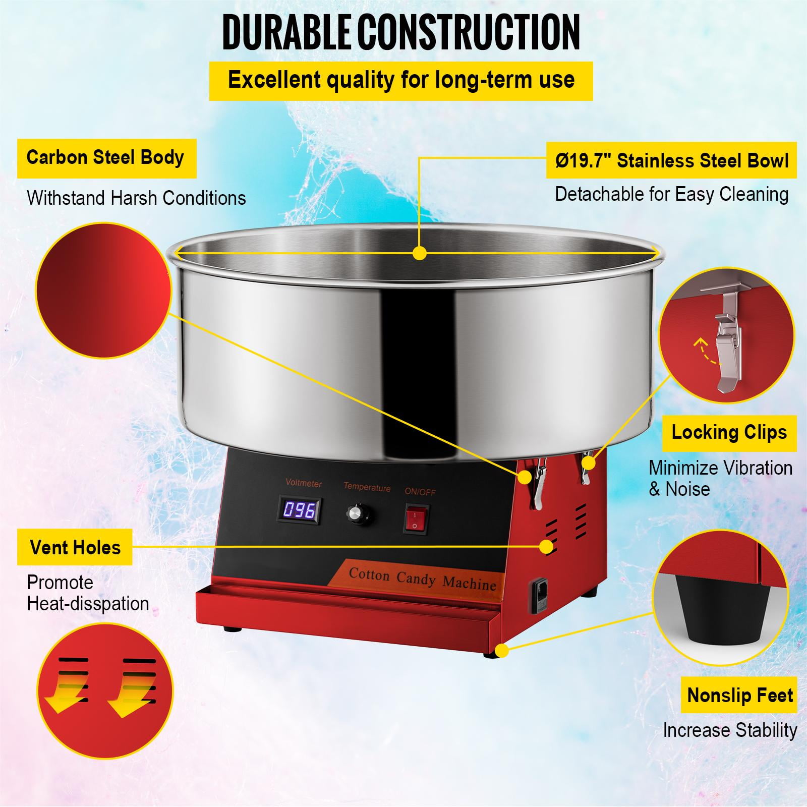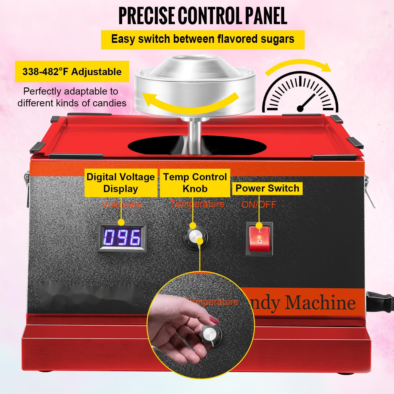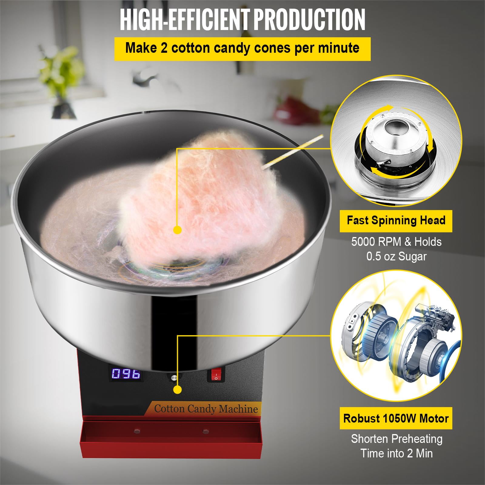 Product Description Serious Cotton Candy Making This commercial-grade cotton candy maker’s performance will not disappoint as it produces 2 to 3 servings of cotton candy per minute! Watch the smiles on kids’ faces as you hand out fluffy deliciousness that will brighten their day.This versatile product is not limited to granule sugar only. It’s capable of melting hard candies and making delicious floss out of them. Nerds, Life Savers, Soda Poppers, and more! Experiment with your favorites, and come up with delicious flavors. Specifications Model: VV-CCM-XF-21 Power: 1050W Head Rotating Speed: 5000RPM Preheat Time: 2 Min Cotton Candy Yield: 120 pcs/h Body Material: Carbon Steel Bowl Material: Stainless Steel Adjustable Temp Range: 338-482℉ / 170-250℃ Bowl Diameter: 19.7 inch Bowl Height: 7.1 inch Product Dimensions: 19.7 x 19.7 x 16.9 inch Product Weight: 22 lbs Package Content 1 x Cotton Candy Machine 1 x Sugar Scoop 1 x Carbon Brush