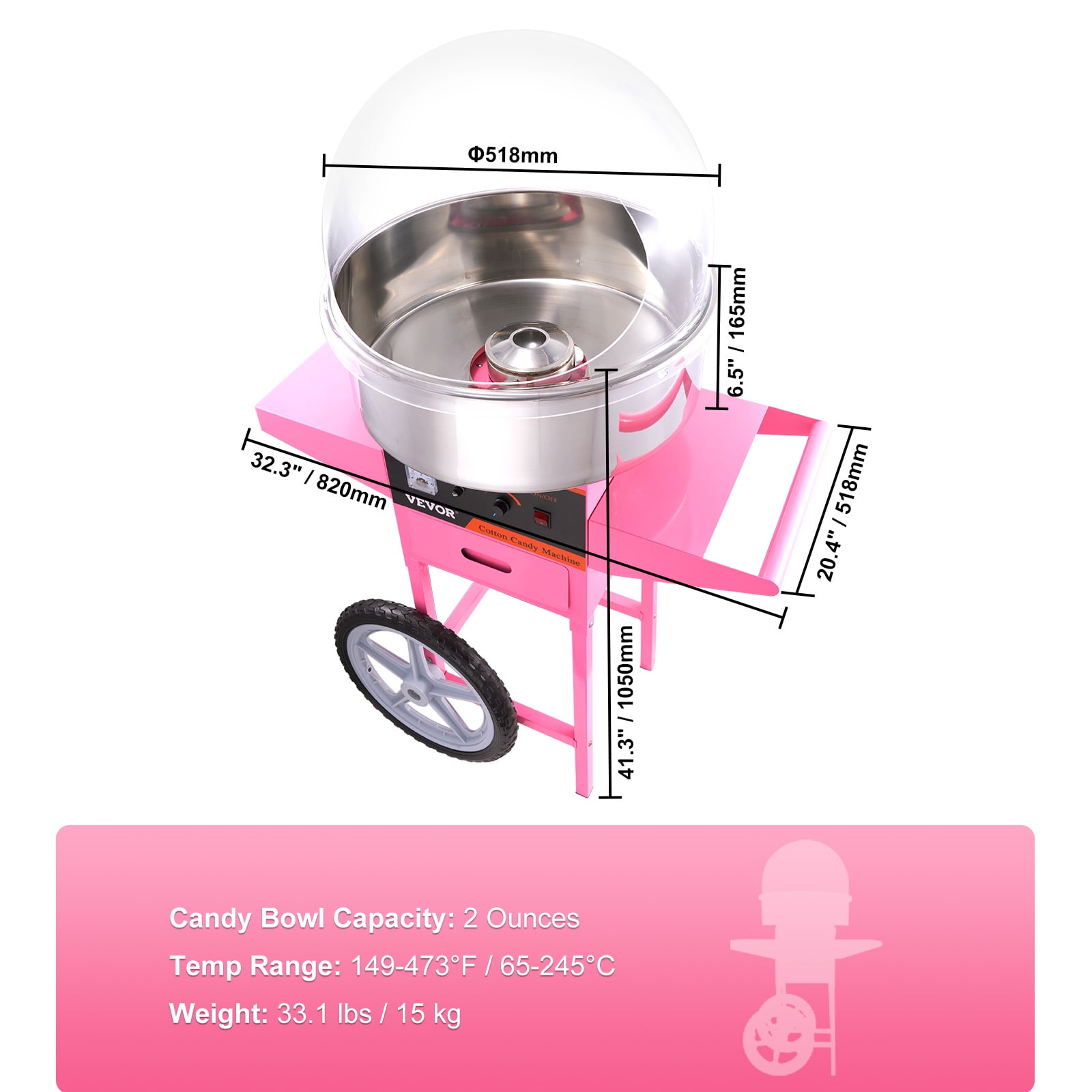 Product Description Electric Cotton Candy Machine This cotton candy maker is perfect for various parties and is suitable for most kinds of sugar. This cotton candy maker has a 1000W motor and larger candy bowl, providing about 6 cotton candies per minute. This candy floss maker can work continuously for one hour. It is perfect for various parties and is suitable for most kinds of sugar. Premium Material& Various Taste The control panel comes with a stepless voltage-regulating knob. The voltage is adjustable, and the voltage change can be viewed through the voltmeter. This candy machine can produce colorful cotton candy with a variety of tastes. The electric candy floss maker is assembled by a food-grade stainless steel, which is rust-proof and corrosion-proof. Easy-Operating Process Using this machine couldn’t be easier. 4 steps to make delicious and diverse cotton candy! Perfect for festivals, carnivals, parties, sports events, even family and social gatherings. Specifications Color: Pink Rated Power: 1000W Cotton Candy Yield: 6 pcs/min Candy Bowl Capacity: 2 Ounces Temp Range: 149-473 °F / 65-245 °C Baffle Size: Φ19.7×6.5 inch / Φ500×165 mm Item Size: 20.4×32.3×41.3 inch / 518x820x1050 mm Candy Drawer Material: SUS201 Food Grade Stainless Steel Weight: 36.6 lbs / 16.6 kg Package Content 1 x Cotton Candy Machine 1 x Sugar Scoop 1 x Transparent Cover 1 x Carbon Brush 1 x Power Line 1 x Extra Fuse 1 x Installation Screws 1 x Instruction Manual